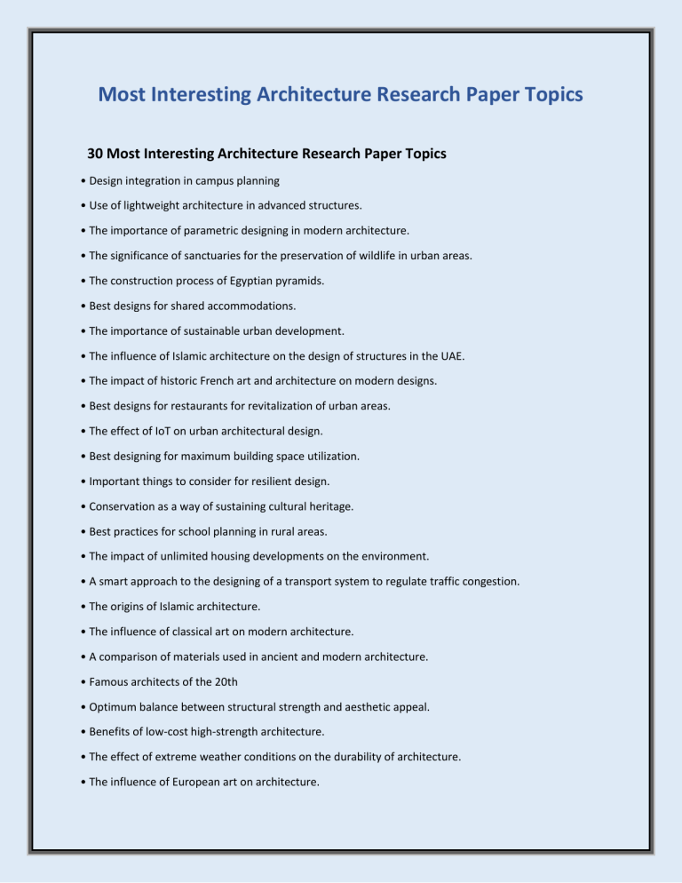 Most Interesting Architecture Research Paper Topics 30 Most Interesting Architecture Research Paper Topics • Design integration in campus planning • Use of lightweight architecture in advanced structures. • The importance of parametric designing in modern architecture. • The significance of sanctuaries for the preservation of wildlife in urban areas. • The construction process of Egyptian pyramids. • Best designs for shared accommodations. • The importance of sustainable urban development. • The influence of Islamic architecture on the design of structures in the UAE. • The impact of historic French art and architecture on modern designs. • Best designs for restaurants for revitalization of urban areas. • The effect of IoT on urban architectural design. • Best designing for maximum building space utilization. • Important things to consider for resilient design. • Conservation as a way of sustaining cultural heritage. • Best practices for school planning in rural areas. • The impact of unlimited housing developments on the environment. • A smart approach to the designing of a transport system to regulate traffic congestion. • The origins of Islamic architecture. • The influence of classical art on modern architecture. • A comparison of materials used in ancient and modern architecture. • Famous architects of the 20th • Optimum balance between structural strength and aesthetic appeal. • Benefits of low-cost high-strength architecture. • The effect of extreme weather conditions on the durability of architecture. • The influence of European art on architecture. • Best practices in town planning. • Art as the prime influencer of architecture. • The impact of Islamic architecture on the modern structural design. • The significance of arches for structural safety. • Reconstruction of architectural heritage. 10 Attention Grabbing Architecture Research Paper Questions • How to make the maximum use of sunlight in advanced structures? • How to redesign highways for best urban mobility? • Is rapid urbanization dangerous for sustainability? • How were the pyramids of Egypt constructed? • How do domes increase the strength of a structure? • What will the architectural practices be like in 2050? • What limit of indoor air velocity is allowable? • How has building information modelling influenced architecture? • How the architectural design of an office building differs from that of a residential building? • When architecture becomes art? 5 Architecture Research Paper Ideas To Explore Ancient temples in Egypt. The architecture of Taj Mahal. Rehabilitation of ancient structures. Ancient architecture. For more information about Premium Grade Essays, visit Premiumgradeessays.com.