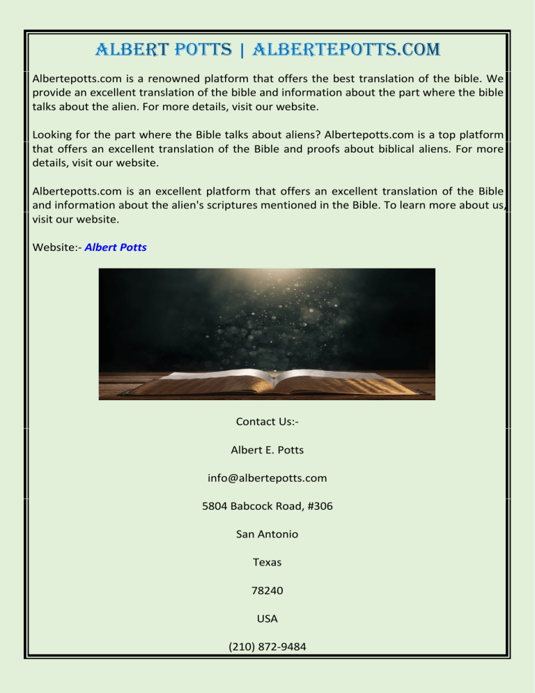 Albertepotts.com is a renowned platform that offers the best translation of the bible. We provide an excellent translation of the bible and information about the part where the bible talks about the alien. For more details, visit our website. Looking for the part where the Bible talks about aliens? Albertepotts.com is a top platform that offers an excellent translation of the Bible and proofs about biblical aliens. For more details, visit our website. Albertepotts.com is an excellent platform that offers an excellent translation of the Bible and information about the alien's scriptures mentioned in the Bible. To learn more about us, visit our website. Website:- Albert Potts Contact Us:Albert E. Potts [email protected] 5804 Babcock Road, #306 San Antonio Texas 78240 USA (210) 872-9484