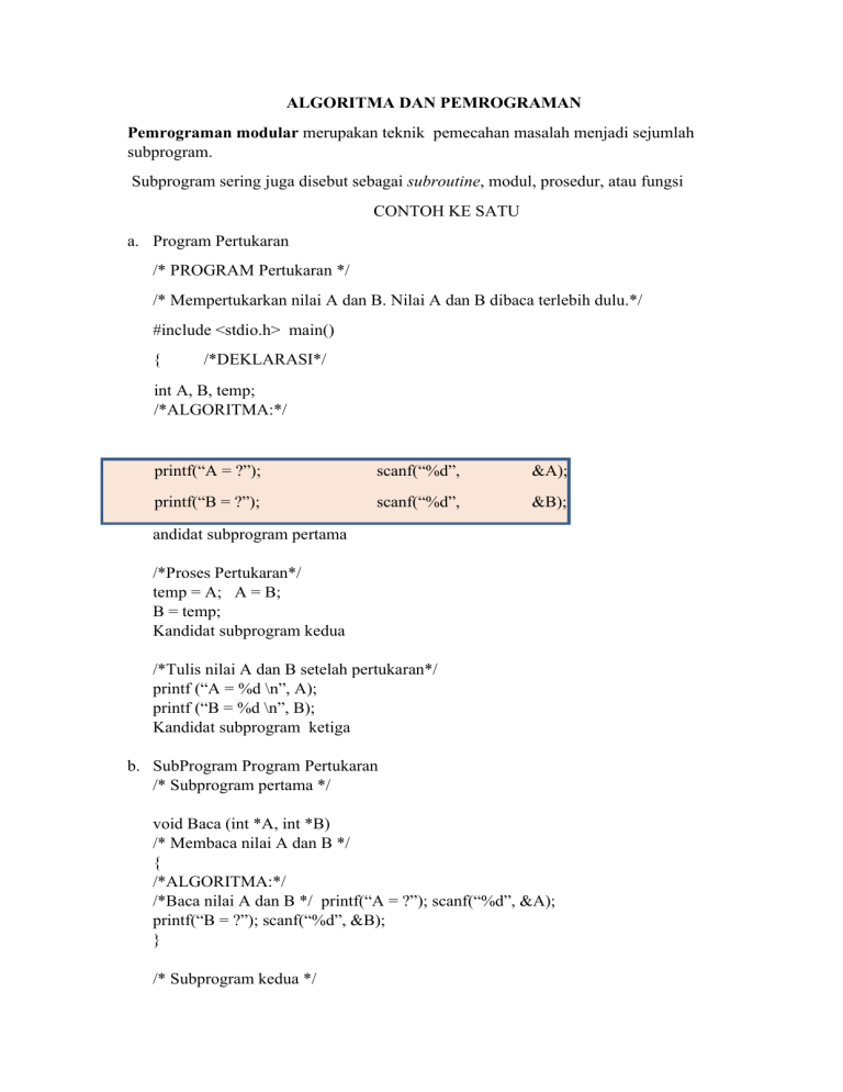 Baca(A,B); /*Baca nilai A & B*/ Tukar(&A, &B); /*Pertukaran */ Tulis(A, B);