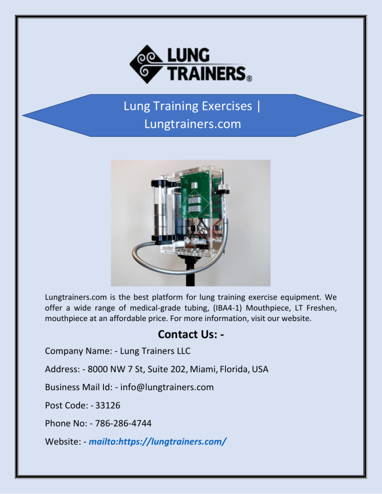 Lung Training Exercises | Lungtrainers.com Lungtrainers.com is the best platform for lung training exercise equipment. We offer a wide range of medical-grade tubing, (IBA4-1) Mouthpiece, LT Freshen, mouthpiece at an affordable price. For more information, visit our website. Contact Us: Company Name: - Lung Trainers LLC Address: - 8000 NW 7 St, Suite 202, Miami, Florida, USA Business Mail Id: - [email protected] Post Code: - 33126 Phone No: - 786-286-4744 Website: - mailto:https://lungtrainers.com/