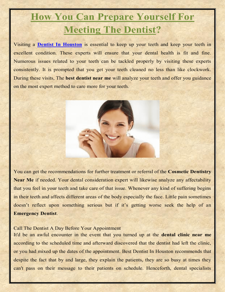 How You Can Prepare Yourself For Meeting The Dentist? Visiting a Dentist In Houston is essential to keep up your teeth and keep your teeth in excellent condition. These experts will ensure that your dental health is fit and fine. Numerous issues related to your teeth can be tackled properly by visiting these experts consistently. It is prompted that you get your teeth cleaned no less than like clockwork. During these visits, The best dentist near me will analyze your teeth and offer you guidance on the most expert method to care more for your teeth. You can get the recommendations for further treatment or referral of the Cosmetic Dentistry Near Me if needed. Your dental consideration expert will likewise analyze any affectability that you feel in your teeth and take care of that issue. Whenever any kind of suffering begins in their teeth and affects different areas of the body especially the face. Little pain sometimes doesn’t reflect upon something serious but if it’s getting worse seek the help of an Emergency Dentist. Call The Dentist A Day Before Your Appointment It'd be an awful encounter in the event that you turned up at the dental clinic near me according to the scheduled time and afterward discovered that the dentist had left the clinic, or you had mixed up the dates of the appointment. Best Dentist In Houston recommends that despite the fact that by and large, they explain the patients, they are so busy at times they can't pass on their message to their patients on schedule. Henceforth, dental specialists propose their patients to check their timetable already and affirm their arrangement again prior to appearing at the best dental specialists. Keep All The Documents And Relevant Reports Ready A dentist appointment isn’t just about issues or issues you are dealing with at this moment it’s for maintaining hygiene too. They need critical clinical documents and all records of past dental history to make the right investigations and treatment. Subsequently, consistently make a rundown of the significant focuses with respect to your clinical and dental wellbeing, at various times, to make your dental care totally beneficial and serving the purpose. Clean Your Teeth Nicely Before Meeting The Dentist You may think visiting a dental center in Texas implies they'll deal with your teeth in whatever condition they are, so why require the additional push to take care or even brush the teeth. In any case, as the best dental specialist in Houston says, brushing and flossing prior to visiting the center is similarly as significant for the oral examination as you being available there since it'll be simpler for your dental specialist to inspect you, and approach an exact conclusion that will be helpful for you. Have A Word About Your Issue Being open about your treatment is the way to great treatment of any sort and this is not different in dental treatment. In the event of dental treatment, it is even more essential. The more data your dental specialist gets, the simpler it becomes to come up with the best possible and exact treatment. If you are going to the emergency dentistry then skip this point.
