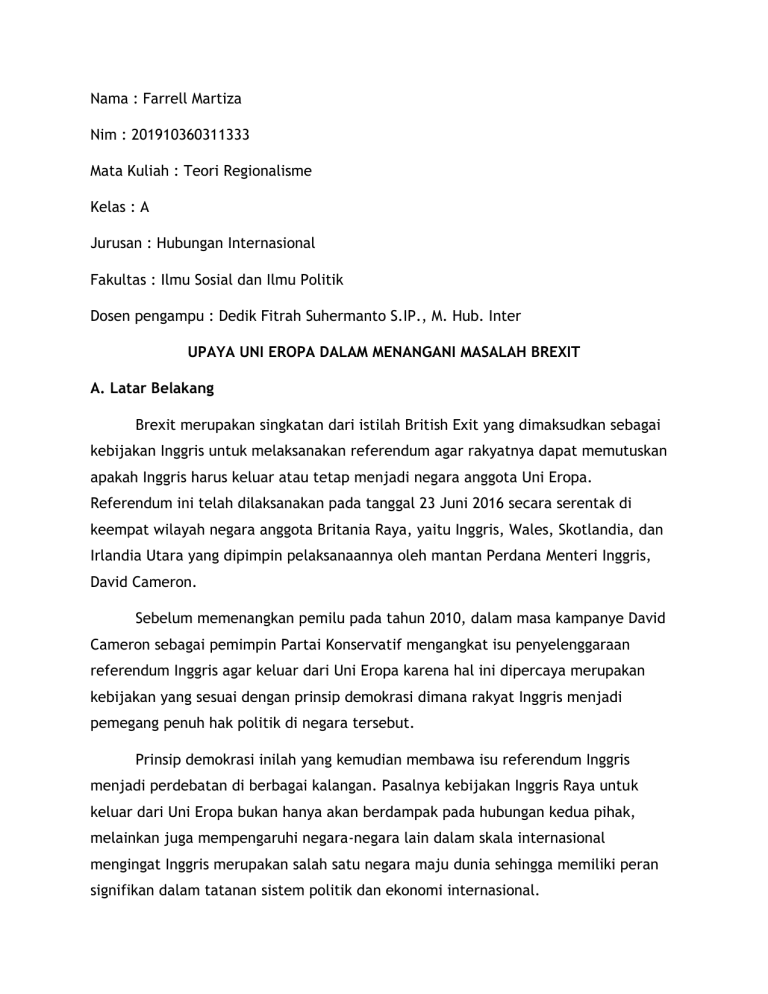 Nama : Farrell Martiza Nim : 201910360311333 Mata Kuliah : Teori Regionalisme Kelas : A Jurusan : Hubungan Internasional Fakultas : Ilmu Sosial dan Ilmu Politik Dosen pengampu : Dedik Fitrah Suhermanto S.IP., M. Hub. Inter UPAYA UNI EROPA DALAM MENANGANI MASALAH BREXIT A. Latar Belakang Brexit merupakan singkatan dari istilah British Exit yang dimaksudkan sebagai kebijakan Inggris untuk melaksanakan referendum agar rakyatnya dapat memutuskan apakah Inggris harus keluar atau tetap menjadi negara anggota Uni Eropa. Referendum ini telah dilaksanakan pada tanggal 23 Juni 2016 secara serentak di keempat wilayah negara anggota Britania Raya, yaitu Inggris, Wales, Skotlandia, dan Irlandia Utara yang dipimpin pelaksanaannya oleh mantan Perdana Menteri Inggris, David Cameron. Sebelum memenangkan pemilu pada tahun 2010, dalam masa kampanye David Cameron sebagai pemimpin Partai Konservatif mengangkat isu penyelenggaraan referendum Inggris agar keluar dari Uni Eropa karena hal ini dipercaya merupakan kebijakan yang sesuai dengan prinsip demokrasi dimana rakyat Inggris menjadi pemegang penuh hak politik di negara tersebut. Prinsip demokrasi inilah yang kemudian membawa isu referendum Inggris menjadi perdebatan di berbagai kalangan. Pasalnya kebijakan Inggris Raya untuk keluar dari Uni Eropa bukan hanya akan berdampak pada hubungan kedua pihak, melainkan juga mempengaruhi negara-negara lain dalam skala internasional mengingat Inggris merupakan salah satu negara maju dunia sehingga memiliki peran signifikan dalam tatanan sistem politik dan ekonomi internasional. Referendum Brexit tersebut kemudian menghasilkan kesepakatan bahwa Inggris harus melepaskan keanggotaannya di Uni Eropa dengan perolehan suara dimana 51,9% rakyat Inggris memilih untuk keluar dari Uni Eropa, sedangkan 48% rakyat Inggris lainnya memilih untuk tetap menjadi anggota Uni Eropa. Uni Eropa dinilai telah melakukan terlalu banyak intervensi dalam implementasi kebijakan pemerintah Inggris karena seringkali memaksakan kebijakannya untuk diterapkan, walaupun kebijakan tersebut bertentangan dengan kepentingan nasional Inggris. Keputusan mayoritas rakyat Inggris yang memilih untuk keluar dari Uni Eropa dilandaskan pada kepercayaan bahwa Uni Eropa telah melanggar kedaulatan Inggris dalam banyak aspek, mulai dari kebijakan Luar Negeri, keamanan, hingga isu-isu internal seperti penentuan standar upah pekerja-pekerja industri, maupun kebijakan Perikanan dan Kelautan Inggris yang seharusnya menjadi kewenangan penuh pemerintah domestik dalam rangka mempertahankan dan menjalankan kedaulatan negaranya. Hal ini disebabkan oleh sistem yang dianut Uni Eropa dalam perumusan serta penentuan kebijakannya, dimana keputusan organisasi supranasional tersebut diambil melalui proses voting atau pemungutan suara negara-negara anggota yang membuat Inggris tidak mampu berdiri sendiri dan menentang kebijakan-kebijakan tersebut karena Inggris tidak mampu melawan mayoritas negara anggota lain yang setuju dengan kebijakan yang telah ditetapkan. Salah satu contoh kebijakan yang menjadi pertimbangan terbesar Inggris untuk keluar dari Uni Eropa adalah “Open Door Immigration Policy” yang mengharuskan Inggris membuka keamanan perbatasannya kepada para imigran dan pengungsi agar dapat dengan bebas masuk dan menetap di negaranya. Walaupun kebijakan tersebut dilatarbelakangi oleh alasan kemanusiaan dan untuk kepentingan bersama negaranegara Eropa. Namun hal ini membuat Inggris kehilangan kontrol terhadap perbatasannya sehingga terjadi peningkatan arus imigran yang cukup signifikan memasuki wilayah negara tersebut dalam beberapa dekade terakhir dan telah menimbulkan konsekuensi ekonomis tertentu sehingga harus segera diatasi. Berdasarkan salah satu pertimbangan inilah, rakyat Inggris Raya yang percaya bahwa mereka telah kehilangan hak suara sejak tahun 1975 dalam parlemen Uni Eropa dan memilih untuk lepas dari ikatan kewajibannya sebagai negara anggota Uni Eropa serta berusaha memperoleh kembali kedaulatannya. Meningkatnya dominasi dari kaum Euroscepticism yang mengadvokasikan kerugian-kerugian menjadi anggota Uni Eropa di Inggris kemudian menyebar ke seluruh negeri dan setelah dipimpin oleh Partai Konservatif di Parlemen, sehingga rakyat Inggrispun akhirnya mewujudkan keinginan mereka untuk optout atau melakukan referendum keluar dari Uni Eropa pada bulan Juni lalu. Dalam rangka memenuhi tujuan didirikannya Uni Eropa, organisasi regional ini kemudian membentuk sistem kelembagaan kompleks yang antara lain terdiri dari Parlemen Eropa, Dewan Uni Eropa, Komisi Eropa, Lembaga Peradilan, Lembaga Pemeriksaan Keuangan, serta sistem institusional Uni Eropa lainnya. Semakin meluasnya otoritas Uni Eropa, pusat pemerintahan menjadi seakan berpindah tangan dari pemerintah domestik negara ke pemerintahan di Brussel, lokasi kantor parlemen utama Uni Eropa, sehingga pemerintah domestik semakin berkurang pengaruhnya terhadap perumusan kebijakan internal negara. Inilah yang dianggap Inggris sangat merugikan. Pada akhirnya setelah hasil referendum Brexit dipublikasikan dan Inggris secara resmi menyatakan diri keluar dari Uni Eropa, berbagai reaksi dari seluruh dunia bermunculan. Reaksi yang paling signifikan datang dari pihak negaranegara Uni Eropa itu sendiri. Referendum Brexit dalam waktu singkat menjadi pemicu maraknya kampanye-kampanye Eurosceptic serta ideologi nasionalisme yang dipimpin oleh tokoh-tokoh dari partai sayap kanan seperti yang terjadi di Perancis, Belanda, Swedia, Yunani dan Denmark. Pernyataan yang dipublikasikan oleh pemimpin-pemimpin Partai Kanan di negara-negara tersebut menyuarakan keinginan yang sama, yakni penyelenggaraan referendum untuk keluar dari Uni Eropa. Seperti yang ditegaskan oleh pemimpin Partai Nasional Perancis Marine Le Pen dalam kampanyenya bahwa “Now is the time to import democracy in our country. The French should have the right to choose!”. Marine Le Pen berjanji bahwa apabila Ia berhasil menang dalam Pemilu tahun 2017 nanti, Ia akan melaksan