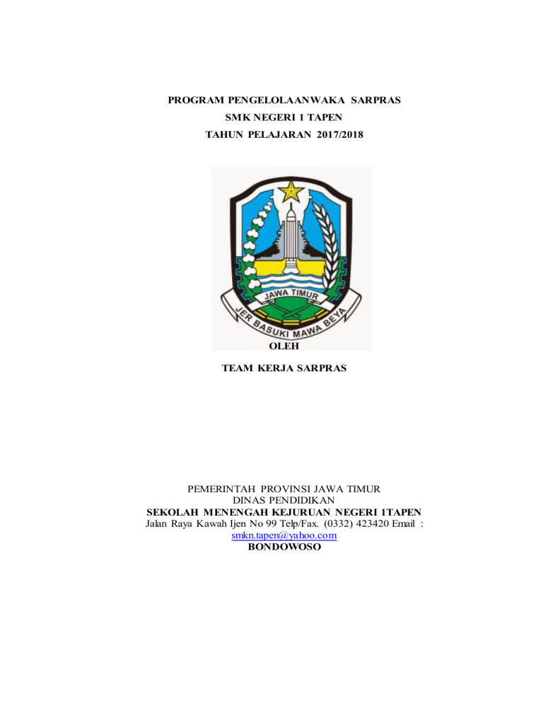 PROGRAM PENGELOLAANWAKA SARPRAS SMK NEGERI 1 TAPEN TAHUN PELAJARAN 2017/2018 OLEH TEAM KERJA SARPRAS PEMERINTAH PROVINSI JAWA TIMUR DINAS PENDIDIKAN SEKOLAH MENENGAH KEJURUAN NEGERI 1TAPEN Jalan Raya Kawah Ijen No 99 Telp/Fax. (0332) 423420 Email : [email protected] BONDOWOSO KATA PENGANTAR Bismillahirrahmaanirrahim Assalamualaikum Wr………Wb. Puji syukur kehadirat Allah SWT kita panjatkan, bahwasanya sampai saat ini kita senantiasa dalam keadaan sehat walafiat. Tidak lain karena Rahmat, taufik serta hidayah Allah Swt. Mudah- mudahan kita senantiasa dalam lindunganya, Amiin. Selanjutnya kita ucapkan syukur Alhamdulillah bahwa tahun pelajaran 2017/2018 telah berakhir dengan selamat dan sukses, tidak lain karena partitsipasi, kerjasama, bantuan dan do’a restu dari semua pihak terutama pihak yang menangani urusan sarana dan prasarana. Begitu pula sampai saat ini dengan bekal, petunjuk saran dan pengarahan bapak kepala SMK Negeri 1 Tapen , kami dapat menyelesaikan program sarana dan prasarana sekalipun sangat sederhana dan masih banyak kekuranganya. Sesuai dengan keterbatasan kemampuan kami, tentu saja banyak kekurangan dan kelemahanya. Oleh karena itu teguran kritik dan saran yang bersifat membangun dari berbagai pihak sangat kami harapkan. Atas segala bantuan, do’a dan restu para teman sejawat, disampaikan terima kasih. Wassalamualaikum Wr....... Wb BAB I PENDAHULUAN A. DASAR 1. Surat Keputusan kepala SMK Negeri 1 Tapen Nomor : 800/011/101.6.4.26/2017 tanggal 8 Juli 2017 tentang pembagian tugas guru dalam kegiatan proses belajar mengajar, guru pembimbing dan konseling, wali kelas dan guru pembina tahun Pelajaran 2017/2018 2. Surat keputusan kepala SMK Negeri 1 Tapen : 800/011/101.6.4.26/2017 tanggal 8 Juli 2017 tentang penetapan Nomor wakil kepala sekolah, Guru pembina dan Koordinator BP/BK. 3. Bahwa dalam memperlancarkan pelaksanaan tugas kepala sekolah.,maka wakil kepala sekolah dipandang perlu menyusun kerja tahunan sebagai pedoman kerja untuk membantu sebagian tugas-tugas kepala sekolah 4. Program kerja tahunan SMKN 1 Tapen tahun pelajaran 2017/2018 5. Program kerja kepala SMK Negeri 1 Tapen tahun 6. pelajaran 2017/2018 7. Undang- Undang Nomor 20 Tahun 2003 tentang sistem Pendidikan Nasional B. MAKSUD DAN TUJUAN 1. Maksud Sebagai pedoman kerja wakil kepala sekolah urusan sarana dan prasarana dalam melaksanakan tugas dan tanggung jawabnya selama tahun pelajaran 2017/2018 2.Tujuan Untuk mengetahui rencana dan program kerja yang akan di laksanakan sehingga dapat mencapai tujuan yang optimal. Sebagai bahan masukan bagi penyusunan program dan pertimbangan kepala sekolah dalam menetapkan kebijaksanaan serta langkah–langkah pengembangan sekolah selanjutnya. Agar dapat melaksakan tugas secara rinci, efektif dan efisien sesuai dengan bidang tugas wakasek urusan sarana dan prasarana. C. RUANG LINGKUP DAN SASARAN 1. Ruang lingkup Adapun ruang lingkup rencana dan program kerja tahunan, selama tahun pelajaran 2011/2017 Wakil kepala sekolah urusan sarana dan prasarana adalah : a. Program umum b. Program khusus c. Program jangka pendek d. Program jangka panjang 2. Sasaran Sasaran dari program tahunan wakil kepala sekolah urusan sarana dan prasarana adalah untuk membantu sebagian tugas-tugas kepala sekolah dalam kelancaran kegiatan proses belajar mengajar di SMK Negeri 1 Tapen. BAB II PROGRAM KERJA Di dalam penyusunan program kerja Wakil kepala sekolah urusan sarana dan prasarana dapat kami kemukakan sebagai berikut: A. Program Umum 1. Membantu tugas kepala sekolah di dalam penyelenggaraan kegiatan sekolah sehari-harinya terutama menyangkut urusan penyediaan dan pemeliharaan sarana dan prasarana. 2. Menyedikan, mengatur, memelihara sarana dan prasarana sekolah dengan pelaksanaan kegiatan sekolah dan proses belajar mengajar dapat berjalan dengan tertib dan lancar. Tentu saja hal ini tidak lepas dari pengawasan. 3. Mengupayakan kepada seluruh aparat penyelenggara sekolah (guru, karyawan, maupun siswa) akan pentingnya kesadaran diri untuk ikut memelihara keindahan dan kebersihan lingkungan sekolah sebagai unsur ketahanan sekolah. 4. Memikirkan, mengusahakan sarana dan prasarana yang belum ada/diadakan serta mengganti memperbaiki sarana dan prasarana yang telah rusak. 5. Menyusun rencana kebutuhan sarana dan prasarana sekolah. 6. Mengkoordinasikan pendayagunaan sarana dan prasarana sekolah 7. Mengelola dalam pembiyaan alat-alat pengajaran 8. Menyusun laporan pelaksanaan urusan sarana dan prasarana sekolah B. Program Khusus Program khusus ini dilaksanakan secara rutin yang meliputi : 1. Pemeliharaan kebersihan dan keindahan sekolah serta lingkungan secara teratur dengan meningkatkan tugas kerja karyawan. 2. Menyediakan sarana dan prasarana yang dibutuhkan dalam menyelenggarakan sekolah seperti alat tulis menulis serta kertas dan lainlain. 3. Mencatat dan mangawasi penggunaan sarana dan prasarana sekolah secara teratur agar setiap tri wulan berjalan . 4. Pembinaan tenaga karyawan baik bagian kebersihan maupun bagian pemeliharaan sarana dan prasarana sekolah agar mereka sadar dan mampu meningkatkan partisipasi di dalam menunjang penyelenggaraan sekolah sesuai dengan tugasnya masing- masing. 5. Mengikutsertakan karyawan serta siswa agar ikut memelihara sarana dan prasarana yang ada disekolah, begitu pula mengenai kebersihan serta keindahan sekolah dengan lingkungannya 6. Mengkoordinir kebersihan ruangan kelas, ruang guru dan ruiang kepala sekolah setiap hari. 7. Mengkoordinir kebersihan halaman sekolah, kebersihan taman, setiap hari. C. Program Jangka Pendek 1. Kebersihan dan keindahan meliputi : a. Kebersihan dan keindahan di dalam dan di luar ruang dan seluruh ruang yang ada di sekolah b. 2. Kebersihan dan keindahan taman Penyediaan dan penambahan sarana dan prasarana meliputi : a. Perlengkapan b. Peralatan c. Perbaikan meja dan kursi yang rusak secara rutin dan teratur d. Pemeliharaan sarana dan prasarana sekolah dengan pencatatan yang teratur serta pengecekan setiap tri wulan. D. Program Jangka P