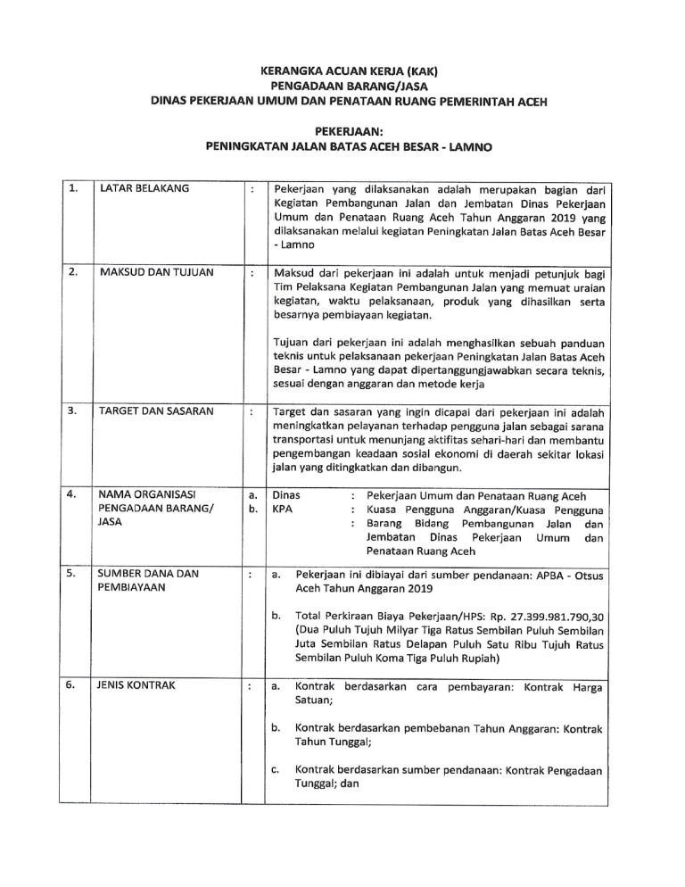 Lampiran 1. DAFTAR PERSONIL MANAJERIAL Nama Paket Pekerjaan : Peningkatan Jalan Batas Aceh Besar - Lamno Nilai Pagu : Rp. NO Jabatan / Posisi Pendidikan Terakhir 27.400.000.000,00 Pengalaman Pada Pelaksanaan Sertifikat Kompetensi Pekerjaan (Sesuai Kerja Subbidang paket yang diikuti) (Tahun) 1 General Superintendent S1 Teknik Sipil SKA Ahli Muda Teknik Jalan 6 Tahun 2 Highway Engineer S1 Teknik Sipil SKA Ahli Muda Teknik Jalan 6 Tahun 3 Manajer Kendali Mutu D3 Teknik Sipil SKA Ahli Muda Teknik Jalan 3 Tahun 4 Pelaksana K3 Konstruksi S1 Teknik Sipil SKA Ahli Muda K3 konstruksi 3 Tahun 5 Pengawas SLTA / sederajat SKTK Pengawas Lapangan Pekerjaan Jalan Tingkat I 2 Tahun 6 Surveyor SLTA / sederajat SKTK Juru Ukur Pekerjaan Jalan Tingkat I 2 Tahun 7 Adm & Keuangan SLTA / sederajat - - 8 Draftman SLTA / sederajat - - Catatan : Personil Manajerial untuk Posisi Highway Engineer dan pengawas merupakan personil tetap pada perusahan tersebut. Lampiran 2. DAFTAR KEBUTUHAN PERALATAN MINIMAL Nama Paket No. : Peningkatan Jalan Batas Aceh Besar - Lamno Jenis Alat Satuan Volume Ket 1 ASPHALT FINISHER Unit 1,00 2 ASPHALT SPRAYER Unit 1,00 3 BULLDOZER 100-150 HP Unit 3,00 4 COMPRESSOR 4000-6500 L\M Unit 1,00 5 DUMP TRUCK 3,5 TON Unit 5,00 6 DUMP TRUCK 10 TON Unit 15,00 7 EXCAVATOR 80-140 HP Unit 7,00 8 GENERATOR SET Unit 1,00 9 MOTOR GRADER >100 HP Unit 1,00 10 WHEEL LOADER 1.0-1.6 M3 Unit 1,00 11 TANDEM ROLLER 6-8 T. Unit 1,00 12 TIRE ROLLER 8-10 T. Unit 1,00 13 VIBRATORY ROLLER 5-8 T. Unit 1,00 14 WATER TANKER 3000-4500 L. Unit 1,00 15 ROCK DRILL BREAKER Unit 3,00 Unit 1,00 16 SURVEY EQUIPMENT Lampiran 3 Surat-surat Dukungan yang Diperlukan NAMA PAKET PAGU : Peningkatan Jalan Batas Aceh Besar - Lamno : Rp.27.400.000.000 Surat Dukungan yang diperlukan: 1. Surat Pernyataan Kepemilikan/Dukungan Peralatan Pendukung dan Bahan Untuk Pekerjaan Hotmix (Aspal Beton) dan pada surat pernyataan tersebut menyampaikan harga 1 ton ACBC/AC-WC; 2. Hasil Pindai (Scan) Sertifikat Kelayakan Operasi Asphalt Mixing Plant; 3. Surat Pernyataan Kepemilikan/Dukungan Peralatan Pendukung Untuk Pekerjaan Perkerasan (Non Aspal Beton);
