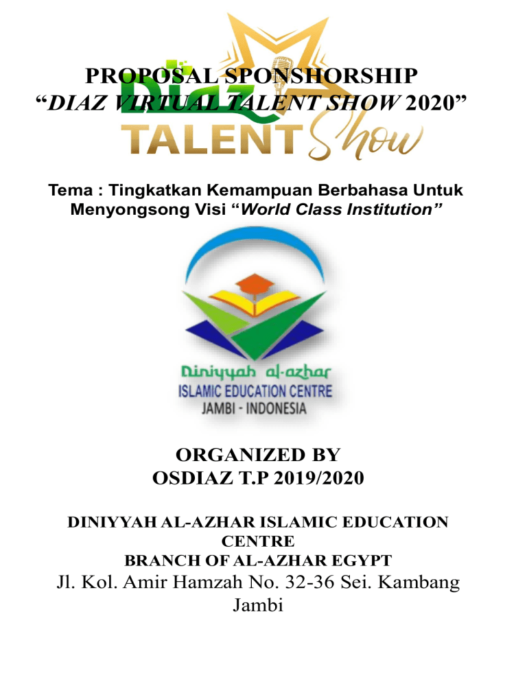 PROPOSAL SPONSHORSHIP “DIAZ VIRTUAL TALENT SHOW 2020” Tema : Tingkatkan Kemampuan Berbahasa Untuk Menyongsong Visi “World Class Institution” ORGANIZED BY OSDIAZ T.P 2019/2020 DINIYYAH AL-AZHAR ISLAMIC EDUCATION CENTRE BRANCH OF AL-AZHAR EGYPT Jl. Kol. Amir Hamzah No. 32-36 Sei. Kambang Jambi PENDAHULUAN A. LATAR BELAKANG Indonesia memiliki banyak bahasa dari masingmasing suku di Indonesia akan tetapi bahasa Indonesia menjadi bahasa persatuan, oleh karena itu kegiatan ini untuk memperingati Sumpah Pemuda yang jatuh pada tanggal 28 Oktober sebagai bagian dari sejarah bahasa Indonesia dimana bahasa Indonesia yang sudah mengakar sejak abad ke-15.Ketika Indonesia masih bernama Negara HindiaBelanda, maka kegiatan ini bertujuan menumbuhkan rasa jiwa patriotisme dan Nasionalisme dan cinta tanah air, juga sebagai ajang pentas karya seni bahasa, untuk unjuk bakat, dan aksi serta ekspresi, maka dari itu kami OSDIAZ SMP IT dan SMA IT DIAZ Jambi selaku panitia pelaksana kegiatan Bulan Bahasa secara virtual berpartisipasi dalam mengisi kegiatan Bulan Bahasa agar lancarnya kegiatan ini dan sekaligus cara bagaimana menghargai dan melestarikan budaya, bahasa yang menjadi ciri khas sendiri dilestarikan oleh para generasi muda. Latar belakang kegiatan virtual ini adalah untuk memperingati hari sumpah pemuda yang jatuh pada tanggal 28 Oktober.Mengingat semakin menurunnya minat dan kesadaran para generasi bangsa dalam memperingati hari sumpah pemuda, maka kegiatan ini diharapkan dapat menumbuhkan jiwa patriotisme dan nasionalisme di dalam diri para siswa.Selain itu kegiatan Bulan Bahasa ini juga berguna sebagai sarana berekspresi bagi siswa/I dan mengembangkan bakat-bakat siswa dibidang akademik dan non akademik. B. TUJUAN KEGIATAN Kegiatan Bulan Bahasa dan Diaz Talent Show diadakan setiap tahunnya tentu memiliki beberapa tujuan seperti : 1. Bulan Bahasa Meningkatkan mutu pendidikan melalui kemampuan berbahasa dan berkomunikasi. Melalui acara bulan bahasa yang akan diselenggarakan maka tujuan pertama yaitu meningkatkan mutu pendidikan melalui kemampuan berbahasa dan berkomunikasi dengan baik terutama dalam berbahasa Indonesia. Meningkatkan dan Mengembangkan Bakat dan Potensi yang Dimiliki Anak Didik. Acara bulan bahasa merupakan wadah bagi para peserta didik SDIT, SMPIT,SMAIT DIAZ Jambi, untuk dapat mengembangkan bakat dan potensinya melalui berbagai cabang lomba yang akan diadakan nantinya. Meningatkan Semangat Patriotismen Kepada Siswa/I Perguruan Diniyyah Al-Azhar. Bulan bahasa kali ini merupakan gabungan acara dari hari sumpah pemuda pada tanggal 28 Oktober dan juga hari pahlawan yang jatuh pada tanggal 10 November. Sehingga tujuan acara ini bukan saja ajang pencarian bakat dan potensi yang terpendam pada siswa didik, akan tetapi sebagai pendidikan dan penanam karakter jiwa patrotisme dan rasa cinta kepada para pahlawan yang telah berjuang demi kemerdekaan. 2. Diaz Talent Show Promosi sekolah Dengan menunjukkan keberadaan sanggar music dilingkungan Perguruan Diniyyah Al-Azhar Jambi, secara tidak langsung menjadi ajang mempromosikan Perguruan Diniyyah Al-Azhar Jambi kepada masyarakat di provinsi Jambi.Sanggar music Perguruan Diniyyah Al-Azhar Jambi dapat menjadi nilai plus bagi para orangtua siswa/I untuk sebagai bahan perbandingan sekolah-sekolah lainnya. Menumbuh kembangkan bakat dan minat anak Dengan diadakannya ajang perlombaan vocal solo, vocal group, dan bermain music ini secara tidak langsung telah menumbuhkan bakat-bakat yang dimiliki oleh anak-anak usia sekolah dan juga dapat mengetahui bakat-bakat bermusik anak yang mungkin sebelumnya masih belum diketahui tapi dengan adanya ajang perlombaan ini anak-anak akan merasa tertarik untuk menggali potensi dari mereka dibidang musik. C. BENTUK KEGIATAN Dalam kegiatan Bulan Bahasa dan Diaz Talent Show Virtual tahun 2020 ini kegiatan perlombaan yang akan diadakan adalah sebagai berikut : 1. Perlombaan Bulan Bahasa Lomba Menyanyi Lagu Anak-Anak (TK dan SD) Lomba menyanyi lagu anak-anak diikuti oleh TK dan SD kelas 1, 2, dan 3. Dilakukan secara virtual (mengirim hasil video asli tanpa di edit menggunakan aplikasi apapun, dan bisa dikirim mulai tanggal 15 – 27 oktober 2020 ke contact person dibawah ini. Tanggal registrasi 28 Sep-27 Oktober 2020 dan Biaya registrasi :Rp. 35. 000. CP : 0852-8722-2088 (Rosi oktaviani) Juri : Ustadzah.Yanti S.Pd.I (SD) Ustad Said Abdurrohim S.Si (SD) Ustadzah Juliana S.Pd (TK) Ustadzah Dra Titi Iswanti (TK) Lomba Membaca Puisi Bahasa Indonesia (SD, SMP, dan SMA) Lomba membaca puisi dengan tema ‘Perjuangan’ diikuti oleh siswa/I SD kelas 4,5,dan 6 SD dan juga siswa/I SMP dan SMA, dewan juri akan menyediakan dua pilihan puisi yang dapat dipilih oleh peserta, Pemilihan puisi akan diberikan disaat peserta melakukan technical meeting, Peserta bebas mengekspresikan diri dalam membacakan puisi. Lomba ini dilakukan secara virtual (mengirimkan video asli tanpa di edit menggunakan aplikasi apapun, dan langsung dikirimkan melalui contact person dibawah ini) dan video bisa dikirim mulai tanggal 15 – 27 Oktober 2020.tanggal registrasi 28Sep-27Oktober2020 dan Biaya registrasi :Rp. 30.000 CP : 0856-0959-1795 (Fathimah azzahra) Juri: Ustadzah Sri Rezeki Sp.d (SMP) dan (SMA) Ustadzah Dzikra Amalia S.Si (SD) Deklamasi Sumpah Pemuda ( SD ) Lomba mendeklamasi teks sumpah pemuda akan dilaksanakan secara virtual (mengirimkan video asli tanpa di edit menggunakan aplikasi apapun, dan bisa dikirim melalui contact person dibawah ini) dan dikirimkan mulai tanggal 15–27 Oktober 2020. Lomba ini akan diikuti oleh siswa/I tingkat SD kelas 3 dan 4.Teks sumpah pemuda disiapkan oleh masing-masing peserta.Para peserta bebas untuk berekspresi serta dapat menggunaka property yang menunjang penampilan dalam mendeklamasi sumpah pemuda tersebut. Tanggal registrasi 28 Sep- 27 Oktober 2020 dan Biaya registrasi :Rp. 25.000 CP :0812-7125-1626 (Alfiyana sawitri) Juri: Ustadzah Dwi Rizki Anggraini S.Pd Story Telling ( SD, SMP, dan SMA ) Lomba story telling 