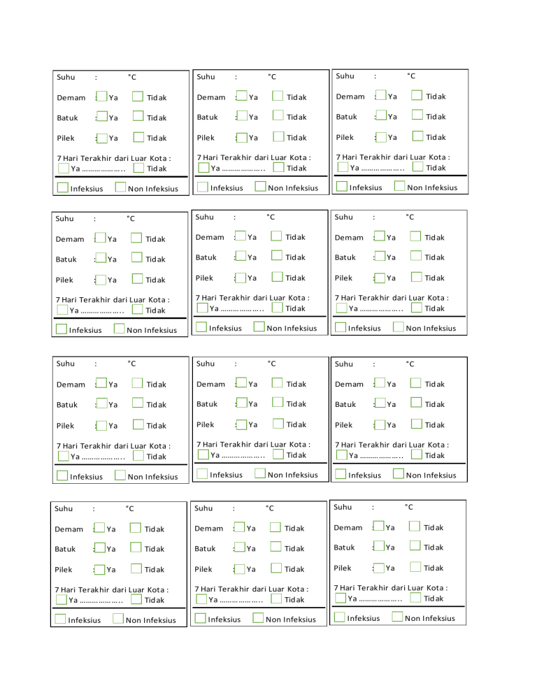 : Tidak Demam : Ya Tidak Ya Tidak Batuk : Ya Tidak Ya Tidak Pilek : Ya Tidak : Tidak Demam : Ya Ya Tidak Batuk : Ya Tidak Pilek : : Demam : Ya Batuk : Pilek : °C 7 Hari Terakhir dari Luar Kota : Ya ……………….. Tidak Infeksius Non Infeksius °C 7 Hari Terakhir dari Luar Kota : Ya ……………….. Tidak Infeksius Non Infeksius Suhu : Tidak Demam : Ya Ya Tidak Batuk : Ya Tidak Pilek : Suhu : Demam : Ya Batuk : Pilek : °C 7 Hari Terakhir dari Luar Kota : Ya ……………….. Tidak Infeksius Non Infeksius Suhu : Demam : Ya Batuk : Pilek : °C °C : Ya Tidak Ya Tidak Batuk : Ya Tidak Ya Tidak Pilek : Ya Tidak 7 Hari Terakhir dari Luar Kota : Ya ……………….. Tidak Infeksius Non Infeksius : Ya Ya Tidak Batuk : Ya Tidak Pilek : °C : Ya Tidak Ya Tidak Batuk : Ya Tidak Ya Tidak Pilek : Ya Tidak 7 Hari Terakhir dari Luar Kota : Ya ……………….. Tidak Infeksius Non Infeksius : Ya Tidak Ya Tidak Batuk : Ya Tidak Ya Tidak Pilek : Ya Tidak Batuk : Ya Tidak Pilek : : 7 Hari Terakhir dari Luar Kota : Ya ……………….. Tidak Non Infeksius °C 7 Hari Terakhir dari Luar Kota : Ya ……………….. Tidak Infeksius Non Infeksius Demam Tidak Pilek Infeksius Tidak Ya : 7 Hari Terakhir dari Luar Kota : Ya ……………….. Tidak : Ya Batuk °C Suhu : Ya Non Infeksius Demam Demam : Infeksius Tidak Tidak Demam 7 Hari Terakhir dari Luar Kota : Ya ……………….. Tidak : : °C °C Suhu Suhu : Non Infeksius Demam Demam Suhu Infeksius Tidak Tidak Non Infeksius 7 Hari Terakhir dari Luar Kota : Ya ……………….. Tidak : : Infeksius °C Suhu Suhu 7 Hari Terakhir dari Luar Kota : Ya ……………….. Tidak Infeksius Suhu Suhu Suhu Non Infeksius °C 7 Hari Terakhir dari Luar Kota : Ya ……………….. Tidak Infeksius Non Infeksius