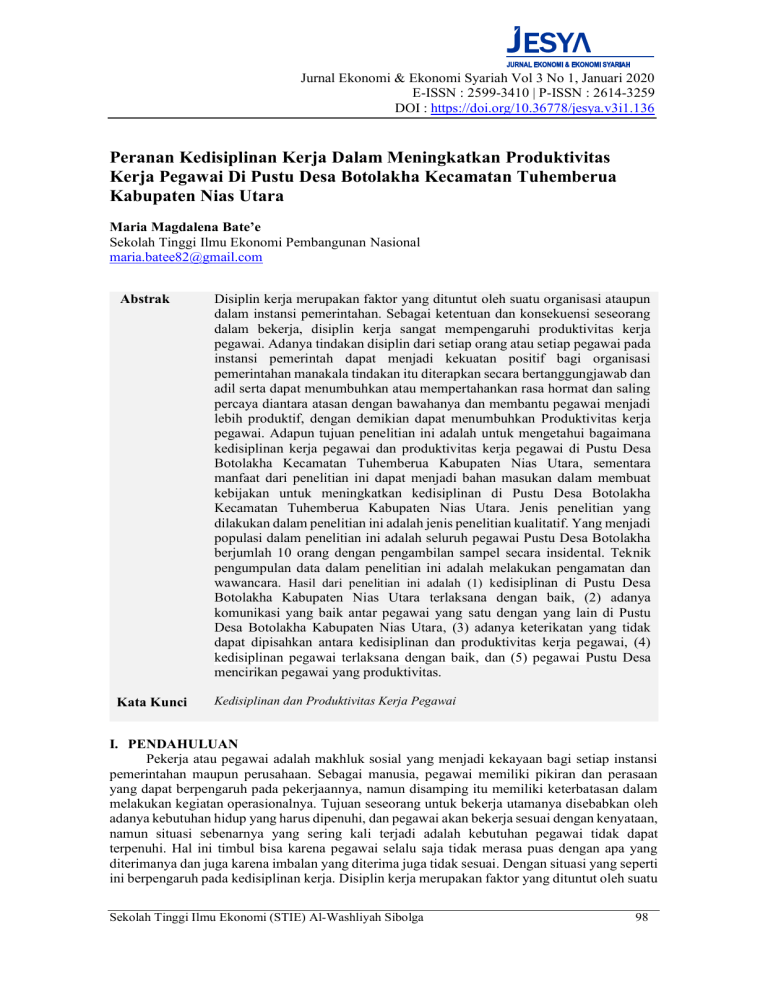 Jurnal Ekonomi & Ekonomi Syariah Vol 3 No 1, Januari 2020 E-ISSN : 2599-3410 | P-ISSN : 2614-3259 DOI : https://doi.org/10.36778/jesya.v3i1.136 Peranan Kedisiplinan Kerja Dalam Meningkatkan Produktivitas Kerja Pegawai Di Pustu Desa Botolakha Kecamatan Tuhemberua Kabupaten Nias Utara Maria Magdalena Bate’e Sekolah Tinggi Ilmu Ekonomi Pembangunan Nasional [email protected] Abstrak Disiplin kerja merupakan faktor yang dituntut oleh suatu organisasi ataupun dalam instansi pemerintahan. Sebagai ketentuan dan konsekuensi seseorang dalam bekerja, disiplin kerja sangat mempengaruhi produktivitas kerja pegawai. Adanya tindakan disiplin dari setiap orang atau setiap pegawai pada instansi pemerintah dapat menjadi kekuatan positif bagi organisasi pemerintahan manakala tindakan itu diterapkan secara bertanggungjawab dan adil serta dapat menumbuhkan atau mempertahankan rasa hormat dan saling percaya diantara atasan dengan bawahanya dan membantu pegawai menjadi lebih produktif, dengan demikian dapat menumbuhkan Produktivitas kerja pegawai. Adapun tujuan penelitian ini adalah untuk mengetahui bagaimana kedisiplinan kerja pegawai dan produktivitas kerja pegawai di Pustu Desa Botolakha Kecamatan Tuhemberua Kabupaten Nias Utara, sementara manfaat dari penelitian ini dapat menjadi bahan masukan dalam membuat kebijakan untuk meningkatkan kedisiplinan di Pustu Desa Botolakha Kecamatan Tuhemberua Kabupaten Nias Utara. Jenis penelitian yang dilakukan dalam penelitian ini adalah jenis penelitian kualitatif. Yang menjadi populasi dalam penelitian ini adalah seluruh pegawai Pustu Desa Botolakha berjumlah 10 orang dengan pengambilan sampel secara insidental. Teknik pengumpulan data dalam penelitian ini adalah melakukan pengamatan dan wawancara. Hasil dari penelitian ini adalah (1) kedisiplinan di Pustu Desa Botolakha Kabupaten Nias Utara terlaksana dengan baik, (2) adanya komunikasi yang baik antar pegawai yang satu dengan yang lain di Pustu Desa Botolakha Kabupaten Nias Utara, (3) adanya keterikatan yang tidak dapat dipisahkan antara kedisiplinan dan produktivitas kerja pegawai, (4) kedisiplinan pegawai terlaksana dengan baik, dan (5) pegawai Pustu Desa mencirikan pegawai yang produktivitas. Kata Kunci Kedisiplinan dan Produktivitas Kerja Pegawai I. PENDAHULUAN Pekerja atau pegawai adalah makhluk sosial yang menjadi kekayaan bagi setiap instansi pemerintahan maupun perusahaan. Sebagai manusia, pegawai memiliki pikiran dan perasaan yang dapat berpengaruh pada pekerjaannya, namun disamping itu memiliki keterbatasan dalam melakukan kegiatan operasionalnya. Tujuan seseorang untuk bekerja utamanya disebabkan oleh adanya kebutuhan hidup yang harus dipenuhi, dan pegawai akan bekerja sesuai dengan kenyataan, namun situasi sebenarnya yang sering kali terjadi adalah kebutuhan pegawai tidak dapat terpenuhi. Hal ini timbul bisa karena pegawai selalu saja tidak merasa puas dengan apa yang diterimanya dan juga karena imbalan yang diterima juga tidak sesuai. Dengan situasi yang seperti ini berpengaruh pada kedisiplinan kerja. Disiplin kerja merupakan faktor yang dituntut oleh suatu Sekolah Tinggi Ilmu Ekonomi (STIE) Al-Washliyah Sibolga 98 Jurnal Ekonomi & Ekonomi Syariah Vol 3 No 1, Januari 2020 E-ISSN : 2599-3410 | P-ISSN : 2614-3259 DOI : https://doi.org/10.36778/jesya.v3i1.136 organisasi ataupun dalam instansi pemerintahan. Sebagai ketentuan dan konsekuensi seseorang dalam bekerja, disiplin kerja sangat mempengaruhi produktivitas kerja pegawai. Disiplin terhadap tugas dan tanggung jawab merupakan kewajiban bagi setiap pegawai sesuai dengan hak yang diterimanya, karena hal itu perlu adanya keseimbangan antara hak dan kewajiban sehingga disiplin kerja akan tercapai. Adanya tindakan disiplin dari setiap orang atau setiap pegawai pada instansi pemerintah dapat menjadi kekuatan positif bagi organisasi pemerintahan manakala tindakan itu diterapkan secara bertanggungjawab dan adil serta dapat menumbuhkan atau mempertahankan rasa hormat dan saling percaya diantara atasan dengan bawahanya dan membantu pegawai menjadi lebih produktif, dengan demikian dapat menumbuhkan Produktivitas kerja pegawai. Produktivitas merupakan hasil dari pencapaian kerja dalam kurun waktu tertentu. Produktivitas sangat menentukan prestasi organisasi karena Produktivitas merupakan hal yang sangat penting untuk menjaga agar kegiatan administrasi dapat berlangsung dengan baik. Produktivitas individu dapat dinilai dari apa yang dilakukan oleh individu tersebut dalam kerjanya. Dengan kata lain Produktivitas individu adalah bagaimana seseorang melaksanakan pekerjaannya atas unjuk kerja (job performance). Produktivitas yang dihasilkan suatu organisasi tidak akan terlepas dari efektivitas yang dilaksanakan organisasi tersebut. Dari hasil penelitian terdahulu yang dilakukan di PT. Perkebunan Nusantara IV Kebon Tobasari menyatakan bahwa kedisiplinan kerja memberikan pengaruh yang positif dalam meningkatkan produktivitas kerja karyawan (Silalahi, 2017). Demikian pula penelitian yang dilakukan oleh Hartono di PT Festino bahwa terdapat pengaruh kedisiplinan kerja dalam meningkatkan produktivitas kerja karyawan pada PT Festino Jakarta Barat (Yudapratama, 2017). Sedangkan penelitian lain menyatakan bahwa produktivitas kerja karyawan akan semakin meningkat secara positif dipengaruhi oleh motivasi kerja karyawan yang baik dan kedisiplinan kerja yang tinggi (Trihudiyatmanto, 2017). Berdasarkan ketiga penelitian ini dapat disimpulkan bahwa kedisiplinan sangat penting dan mendukung meningkatnya produktivitas kerja pegawai dalam setiap organisasi. Dalam penelitian yang dilakukan saat ini, kondisi para pegawai yang ada di Puskesmas Pembantu (Pustu) Desa Sisarahili Kecamatan Mandrehe Kabupaten Nias Barat masih ditemui pegawai yang menunjukkan perilaku yang kurang disiplin seperti tidak tertib dalam bekerja, kurang patuh pada perintah atasan, menunda pekerjaan, dan melaksanakan tugas tidak sesuai dengan tugas pokok dan fungsinya, dan kemudian ada juga pegawai yang secara kolektif