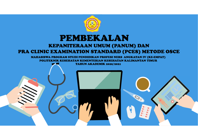 PEMBEKALAN KEPANITERAAN UMUM (PANUM) DAN PRA CLINIC EXAMINATION STANDARD (PCES) METODE OSCE MAHASISWA PROGRAM STUDI PENDIDIKAN PROFESI NERS ANGKATAN IV (KE-EMPAT) POLITEKNIK KESEHATAN KEMENTERIAN KESEHATAN KALIMANTAN TIMUR TAHUN AKADEMIK 2020/2021 PROGRAM PROFESI NERS SEMESTER I KEBIJAKAN PRAKTIK DI ERA PANDEMICOVID-19 01 Content Here Your Text Here SURAT EDARAN RESMI DARI KEMENTERIAN KESEHATAN NO. HK.02.02/MENKES/56/2020 TENTANG TINDAK LANJUT DARI WHO YANG TELAH MENETAPKAN STATUS VIRUS COVID-19 SEBAGAI DARURAT KESEHATAN GLOBAL 02 Content Here Your Text Here SURAT EDARAN DARI POLITEKNIK KESEHATAN KEMENTERIAN KESEHATAN KALIMANTAN TIMUR NO. UM.01.05/1.1/2920/2020 03 Content Here Your Text Here SURAT EDARAN RESMI DARI ASOSIASI INSTITUSI PENDIDIKAN NERS INDONESIA (AIPNI) NO. 465/AINEC.KA.SR/III/2020 TENTANG PROSES PEMBELAJARAN, PENGAJARAN, DAN KEMAHASISWAAN SELAMA MASA DARURAT PANDEMI CORONA VIRUS DISEASE (COVID-19) PRA KLINIK PROFESI NERS KEPANITERAAN UMUM (PANUM) KEPANITERAAN UMUM 01 Content Here Your Text Here Kegiatan pembekalan awal untuk menyiapkan mahasiswa sebelum masuk ke rumah sakit/ puskesmas, diharapkan mahasiswa akan memiliki motivasi dan kepercayaan diri dalam menjalani kepaniteraan. 02 Content Here Your Text Here Kegiatan kepaniteraan umum dilaksanakan selama 2 minggu secara daring (dalam jaringan) meliputi 12 kompetensi dasar yang harus dipenuhi. 03 Content Here Your Text Here Pada minggu pertama mahasiswa akan diberikan materi terkait beberapa kompetensi secara klasikal dan pada minggu kedua mahasiswa mengikuti panum dengan dibagi dalam kelompok kecil untuk membuat & mencari video sesuai SPO pada 12 kompetensi dasar (daftar terlampir) 04 Content Here Your Text Here Setelah mengikuti kegiatan Kepaniteraan Umum (Panum) selama 2 minggu, mahasiswa akan mengikuti Pra Clinic Examination Standar (PCES) dengan metode OSCE (Objective Structured Clinical Examination (OSCE) PRA KLINIK PROFESI NERS KEPANITERAAN UMUM (PANUM) (MINGGU I) KEPANITERAAN UMUM (PANUM) MINGGU PERTAMA PRA KLINIK PROFESI NERS KEPANITERAAN UMUM (PANUM) (MINGGU I) MEKANISME PANUM DARING 01 Content Here Your Text Here Mahasiswa mengikuti Bimbingan Panum untuk 12 Kompetensi Dasar Pra Klinik sebagai Prasyarat memasuki Tahap Profesi. 02 Content Here Your Text Here Mahasiswa membuat Video Keterampilan Klinik sesuai Daftar Kompetensi yang telah ditentukan sejumlah 4 (Empat) Prosedur dan 1 Dokumentasi NCP berdasarkan Pendokumentasian 3 S (SDKI, SIKI dan SLKI). 03 Content Here Your Text Here Kompetensi lainnya dicapai dengan mengunduh Video dari link (dot org) sejumlah 8 (Delapan) Prosedur sesuai Daftar Kompetensi Dasar (12 Kompetensi Dasar) 04 Content Here Your Text Here Setelah mengikuti kegiatan Kepaniteraan Umum (Panum) selama 2 minggu, mahasiswa akan mengikuti Pra Clinic Examination Standar (PCES) dengan metode OSCE (Objective Structured Clinical Examination (OSCE). KEPANITERAAN UMUM (PANUM) MINGGU KEDUA UJIAN PRA KLINIK PROFESI NERS PRA CLINIC EXAMINATION STANDARD (PCES) DENGAN METODE OSCE PRA CLINIC EXAMINATION STANDARD (PCES) DENGAN METODE OSCE THANK YOU Insert the Subtitle of Your Presentation