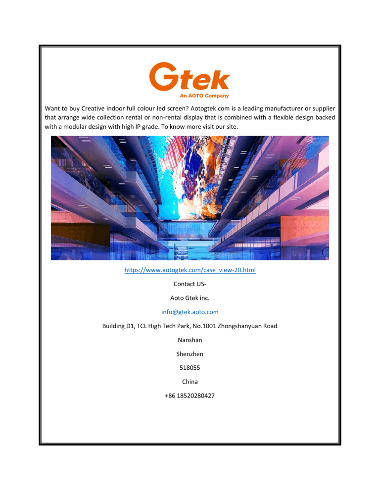 Want to buy Creative indoor full colour led screen? Aotogtek.com is a leading manufacturer or supplier that arrange wide collection rental or non-rental display that is combined with a flexible design backed with a modular design with high IP grade. To know more visit our site. https://www.aotogtek.com/case_view-20.html Contact USAoto Gtek inc. [email protected] Building D1, TCL High Tech Park, No.1001 Zhongshanyuan Road Nanshan Shenzhen 518055 China +86 18520280427