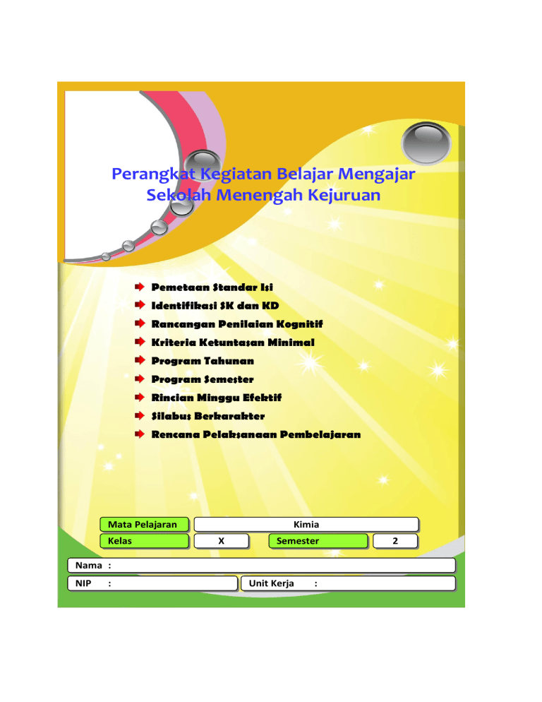 Perangkat Kegiatan Belajar Mengajar Sekolah Menengah Kejuruan Pemetaan Standar Isi Identifikasi SK dan KD Rancangan Penilaian Kognitif Kriteria Ketuntasan Minimal Program Tahunan Program Semester Rincian Minggu Efektif Silabus Berkarakter Rencana Pelaksanaan Pembelajaran Mata Pelajaran Kelas Kimia X Semester Nama : NIP : Unit Kerja : 2 SMK Negeri 1 Samboja SMK PPeem meettaaaann SSttaannddaarr IIssii Mata Pelajaran Standar Kompetensi 1. Memahami konsep penulisan lambang unsur, senyawa dan bentuk molekul, persamaan reaksi, dan hukum-hukum dasar kimia Semester 2 Kimia Kompetensi Dasar Ruang Lingkup 1 2 3 Menjelaskan dan mema- - Lambang unsur, √ hami pengertian unsur senyawa, dan Menyebutkan nama unbentuk molekul sur dan lambang unsur Menjelaskan tentang atom, molekul, ion, dan senyawa Menjelaskan tentang hukum perbandingan tetap Menjelaskan dan memahami rumus kimia Menjelaskan tentang persamaan reaksi Menjelaskan dan memahami hukum-hukum dasar kimia √ Menjelaskan pengertian - Stoikiometri konsep mol Menjelaskan penerapan hukum Proust Menjelaskan dan memahami stoikiometri reaksi √ Menjelaskan pengertian - Konsep reaksi reaksi kimia kimia Menjelaskan pengertian konsep reaksi redoks Menjelaskan pengertian bilangan oksidasi Menjelaskan dan menyebutkan perbedaan konsep oksidasi, reduksi, dan lainnya Indikator 1.1 Memahami lambang unsur, senyawa, dan bentuk molekul 1.2 Memahami rumus kimia 1.3 Menuliskan nama senyawa kimia 1.4 Memahami hukum-hukum dasar kimia - - 2. Memahami kon- 2.1 Memahami konsep mol sep mol dan sebagai dasar perhitungstoikiometri an kimia 2.2 Memahami stoikiometri 3. Memahami per- 3.1 Mendeskripsikan pe- kembangan konngertian umum reaksi sep reaksi kimia kimia 3.2 Membedakan konsep oksidasi, reduksi, dan reaksi lainnya - Kelas: X Materi Pokok Alokasi Waktu 16 x 45' 8 x 45’ 8 x 45' Mengetahui Kepala Sekolah ………………………………… Guru Mata Pelajaran ________________________ NIP. ________________________ NIP. Kimia (Teknik) X – Semester 2 2 SMK Negeri 1 Samboja IIddeennttiiffiikkaassii SSKK,, KKD D uunnttuukk M Meenneettaappkkaann KKeeggiiaattaann PPeem mbbeellaajjaarraann ((TTM M,, PPTT,, KKM MTTTT)) Mata Pelajaran Standar Kompetensi 1. Memahami konsep penulisan lambang unsur, senyawa dan bentuk molekul, persamaan reaksi, dan hukum-hukum dasar kimia SMK Semester 2 Kimia Kelas: X Kompetensi Dasar Materi Pembelajaran Indikator 1.1 Memahami lambang unsur, senyawa, dan bentuk molekul 1.2 Memahami rumus kimia 1.3 Menuliskan nama senyawa kimia 1.4 Memahami hukum-hukum dasar kimia - Unsur - Atom, molekul, dan ion - Hukum perbandingan tetap dan rumus kimia - Persamaan reaksi - Hukum-hukum dasar kimia - Menjelaskan dan memahami pengertian unsur - Menyebutkan nama unsur dan lambang unsur - Menjelaskan tentang atom, molekul, ion, dan senyawa - Menjelaskan tentang hukum perbandingan tetap - Menjelaskan dan memahami rumus kimia - Menjelaskan tentang persamaan reaksi - Menjelaskan dan memahami hukum-hukum dasar kimia - Menjelaskan pengertian konsep mol - Menjelaskan penerapan hukum Proust - Menjelaskan dan memahami stoikiometri reaksi - Menjelaskan pengertian reaksi kimia - Menjelaskan pengertian konsep reaksi redoks - Menjelaskan pengertian bilangan oksidasi - Menjelaskan dan menyebutkan perbedaan konsep oksidasi, reduksi, dan lainnya Jenis Kegiatan Pembelajaran TM PT KMTT 2. Memahami 2.1 Memahami konsep mol - Konsep mol konsep mol sebagai dasar perhitungan - Penerapan hukum dan stoikiokimia Proust metri 2.2 Memahami stoikiometri - Stoikiometri reaksi 3. Memahami 3.1 Mendeskripsikan pengerperkembangtian umum reaksi kimia an konsep re- 3.2 Membedakan konsep okaksi kimia sidasi, reduksi, dan reaksi lainnya - Reaksi kimia - Konsep reaksi redoks - Bilangan oksidasi - Reaksi autoredoks - Perubahan bilangan oksidasi dalam reaksi oksidasi reduksi - Menyetarakan persamaan reaksi redoks - Perbedaan oksidasi dan reduksi Keterangan: TM : Tatap Muka PT : Penugasan Terstruktur KMTT : Kegiatan Mandiri Tidak Terstruktur Mengetahui Kepala Sekolah ………………………………… Guru Mata Pelajaran ________________________ NIP. ________________________ NIP. Kimia (Teknik) X – Semester 2 3 SMK Negeri 1 Samboja RRaannccaannggaann PPeenniillaaiiaann KKooggnniittiiff PPeem meettaaaann PPeenniillaaiiaann BBeerrddaassaarrkkaann SSKK//KKD D//IInnddiikkaattoorr Mata Pelajaran Standar Kompetensi Kimia Kompetensi Dasar SMK Semester 2 Kelas: X Indikator UH UTS LUS 1. Memahami konsep penulisan lambang unsur, senyawa dan bentuk molekul, persamaan reaksi, dan hukum-hukum dasar kimia 1.1 Memahami lambang unsur, se- - Menjelaskan dan memahami penyawa, dan bentuk molekul ngertian unsur 1.2 Memahami rumus kimia - Menyebutkan nama unsur dan 1.3 Menuliskan nama senyawa kimia lambang unsur 1.4 Memahami hukum-hukum dasar - Menjelaskan tentang atom, molekimia kul, ion, dan senyawa - Menjelaskan tentang hukum perbandingan tetap - Menjelaskan dan memahami rumus kimia - Menjelaskan tentang persamaan reaksi - Menjelaskan dan memahami hukum-hukum dasar kimia 2. Memahami konsep 2.1 Memahami konsep mol sebagai - Menjelaskan pengertian konsep mol dan stoikiometri dasar perhitungan kimia mol 2.2 Memahami stoikiometri - Menjelaskan penerapan hukum Proust - Menjelaskan dan memahami stoikiometri reaksi 3. Memahami perkem- 3.1 Mendeskripsikan pengertian - Menjelaskan pengertian reaksi bangan konsep reaksi umum reaksi kimia kimia kimia 3.2 Membedakan konsep oksidasi, - Menjelaskan pengertian konsep reduksi, dan reaksi lainnya reaksi redoks - Menjelaskan pengertian bilangan oksidasi - Menjelaskan dan menyebutkan perbedaan konsep oksidasi, reduksi, dan lainnya Keterangan: UH : Ulangan Harian UTS : Ulangan Tengah Semester LUS : Latihan Ulangan Semester Mengetahui Kepala Sekolah ………………………………… Guru Mata Pelajaran ________________________ NIP. ________________________ NIP. Kimia (Teknik) X – Semester 2 4 SMK Negeri 1 Samboja PPeenneettaappaann KKrriitteerriiaa KKeettuunnttaassaann M M
