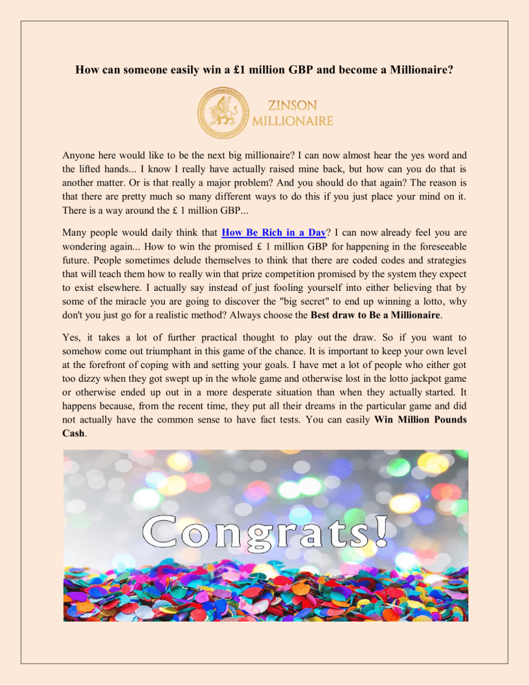 How can someone easily win a £1 million GBP and become a Millionaire? Anyone here would like to be the next big millionaire? I can now almost hear the yes word and the lifted hands... I know I really have actually raised mine back, but how can you do that is another matter. Or is that really a major problem? And you should do that again? The reason is that there are pretty much so many different ways to do this if you just place your mind on it. There is a way around the £ 1 million GBP... Many people would daily think that How Be Rich in a Day? I can now already feel you are wondering again... How to win the promised £ 1 million GBP for happening in the foreseeable future. People sometimes delude themselves to think that there are coded codes and strategies that will teach them how to really win that prize competition promised by the system they expect to exist elsewhere. I actually say instead of just fooling yourself into either believing that by some of the miracle you are going to discover the "big secret" to end up winning a lotto, why don't you just go for a realistic method? Always choose the Best draw to Be a Millionaire. Yes, it takes a lot of further practical thought to play out the draw. So if you want to somehow come out triumphant in this game of the chance. It is important to keep your own level at the forefront of coping with and setting your goals. I have met a lot of people who either got too dizzy when they got swept up in the whole game and otherwise lost in the lotto jackpot game or otherwise ended up out in a more desperate situation than when they actually started. It happens because, from the recent time, they put all their dreams in the particular game and did not actually have the common sense to have fact tests. You can easily Win Million Pounds Cash. How to end up winning a draw promised by a strategy to accomplish that goal is easier than simply playing through a particular game again without a definite plan for how you really expect to win another game. There are a few other ideas that could help you Win Million Pounds Cash. The first major tip of the fire right is to help make sure you have a ticket on a daily basis. Does it sound like a dumb suggestion right? Well, it's not that much dumb for a particular person who should have actually won, but not just because they skipped betting on their normal number combination onto that day. The second easy tip is to somehow keep it calm. Make a vow to yourself that now you are not going to go nuts all of a sudden and waste all your Easy Money while buying the Millionaire tickets, Only because you have heard somewhere that however the "secret" of how to actually win a £ 1 million GBP promised by simply buying dozens and maybe even thousands of tickets at a same time is the only way to win a major win. Finally, just do not simply leave it all to the possible chance... usually come up with now betting theme. Do not be usually afraid to search the internet now for advice, particularly about how to do it using math methods and also just science processes, if necessary.