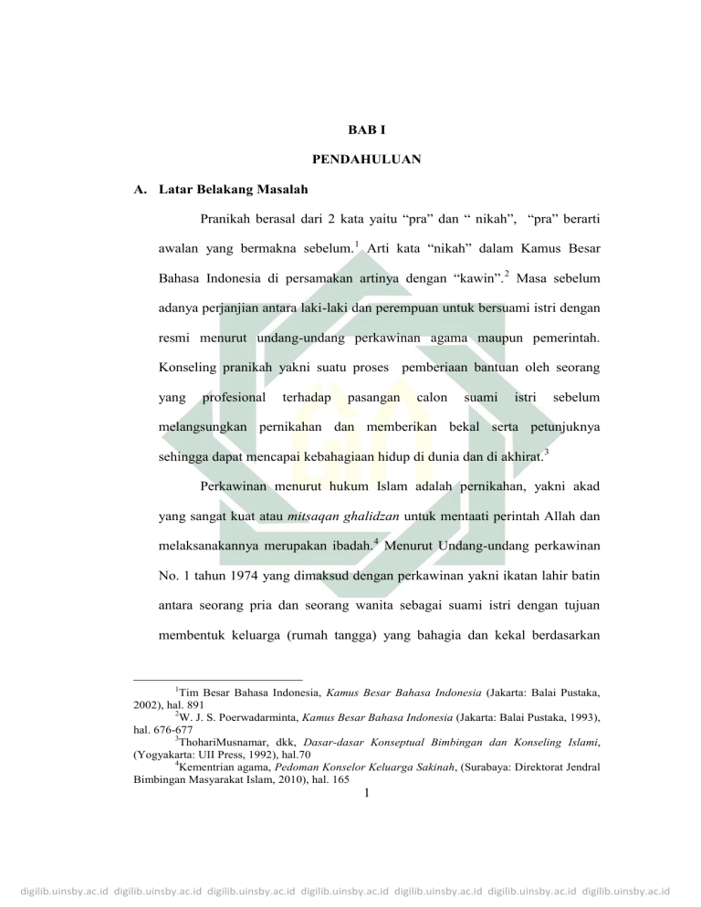 BAB I PENDAHULUAN A. Latar Belakang Masalah Pranikah berasal dari 2 kata yaitu “pra” dan “ nikah”, “pra” berarti awalan yang bermakna sebelum.1 Arti kata “nikah” dalam Kamus Besar Bahasa Indonesia di persamakan artinya dengan “kawin”. 2 Masa sebelum adanya perjanjian antara laki-laki dan perempuan untuk bersuami istri dengan resmi menurut undang-undang perkawinan agama maupun pemerintah. Konseling pranikah yakni suatu proses pemberiaan bantuan oleh seorang yang profesional terhadap pasangan calon suami istri sebelum melangsungkan pernikahan dan memberikan bekal serta petunjuknya sehingga dapat mencapai kebahagiaan hidup di dunia dan di akhirat.3 Perkawinan menurut hukum Islam adalah pernikahan, yakni akad yang sangat kuat atau mitsaqan ghalidzan untuk mentaati perintah Allah dan melaksanakannya merupakan ibadah.4 Menurut Undang-undang perkawinan No. 1 tahun 1974 yang dimaksud dengan perkawinan yakni ikatan lahir batin antara seorang pria dan seorang wanita sebagai suami istri dengan tujuan membentuk keluarga (rumah tangga) yang bahagia dan kekal berdasarkan 1 Tim Besar Bahasa Indonesia, Kamus Besar Bahasa Indonesia (Jakarta: Balai Pustaka, 2002), hal. 891 2 W. J. S. Poerwadarminta, Kamus Besar Bahasa Indonesia (Jakarta: Balai Pustaka, 1993), hal. 676-677 3 ThohariMusnamar, dkk, Dasar-dasar Konseptual Bimbingan dan Konseling Islami, (Yogyakarta: UII Press, 1992), hal.70 4 Kementrian agama, Pedoman Konselor Keluarga Sakinah, (Surabaya: Direktorat Jendral Bimbingan Masyarakat Islam, 2010), hal. 165 1 digilib.uinsby.ac.id digilib.uinsby.ac.id digilib.uinsby.ac.id digilib.uinsby.ac.id digilib.uinsby.ac.id digilib.uinsby.ac.id digilib.uinsby.ac.id 2 Ketuhanan Yang Maha Esa.5 Untuk mencapai tujuan tersebut diperlukan berbagai pertimbangan yang berkaitan dengan kebutuhan manusia. Menurut BP4 (Badan Penasihatan, Pembinaan dan Pelestarian Perkawinan) mengatakan bahwa perkawinan dalam Islam ialah suatau akad atau perjanjian yang mengikat antara laki-laki dan perempuan untuk menghalalkan hubungan biologis antara kedua belah pihak dengan sukarela berdasarkan dengan Syariat Islam.6 Islam memandang dan menjadikan perkawinan itu sebagai basis suatu masyarakat yang baik dan teratur, sebab perkawinan tidak hanya dipertalikan oleh ikatan lahir saja, melainkan juga dengan ikatan bathin. Islam mengajarkan bahwa perkawinan itu tidaklah hanya sebagai ikatan biasa seperti perjanjian jual beli atau sewa- menyewa dan lain-lain, melainkan merupakan suatu perjanjian suci mitsaqon gholidhon, dimana kedua belah pihak dihubungkan menjadi suami istri atau menjadi pasangan hidup dengan mempergunakan nama Allah SWT. Sabda Rasulullah SAW: ُُﻮ ُﻫ ﱠﻦ ﺑِﺎَﻣَﺎ ﻧَِﺔ اﷲِ وَا ْﺳﺘَ ْﺤﻠَْﻠﺘُ ْﻢ ﻓُـﺮُْو َﺟ ُﻬ ﱠﻦ ﺑِ ًﻜﻠِ َﻤ ِﺔ ْ اِ ﺗﱠـ ُﻘﻮا اﷲَ ِﰱ اﻟﻨﱢﺴَﺎ ِء ﻓَﺎِ ﻧﱠ ُﻜ ْﻢ اَ َﺧ ْﺬ ﲤ (اﷲِ )رواﻩ ﻣﺴﻠﻢ Artinya: 5 BimoWalgito, Bimbingan dan Konseling Perkawinan (Yogyakarta: Andi Offset, 2004), hal. 105 6 Kementrian Agama, Tuntunan Praktis Rumah Tangga Bahagia, (Sidoarjo: Badan Penasihatan, Pembinaan, dan Pelestarian Perkawinan (BP4) Provinsi Jawa Timur, 2012) hal. 8 digilib.uinsby.ac.id digilib.uinsby.ac.id digilib.uinsby.ac.id digilib.uinsby.ac.id digilib.uinsby.ac.id digilib.uinsby.ac.id digilib.uinsby.ac.id 3 “Takutlah kepada Allah akan urusan perempuan, sesungguhnya kamu ambil mereka dengan amanah Allah dan kamu halalkan mereka dengan kalimat Allah” (HR. Muslim) Perkawinan memang bukan perkara yang mudah, bukan suatu hal yang boleh dipandang remeh, melainkan suatu aspek dari kehidupan manusia yang harus mendapatkan perhatian serius.7 Karena dalam perkawinan itu bukan hanya menyatukan dua insan yang sedang jatuh cinta, tetapi juga menyatukan dua keluarga besar yaitu antara keluarga besar dari mempelai laki-laki dan keluarga besar dari mempelai perempuan yang mana dalam keluarga itu nantinya akan muncul suatu masalah (konflik). Keluarga bahagia merupakan dambaan bagi para pasangan suami istri yang telah menikah, semua pasangan suami istri setelah menikah pasti mempunyai tujuan untuk membentuk keluarga mereka hidup dengan bahagia. Akan tetapi harapan dari pernikahan saat memasuki area keluarga tidak selalu seperti apa yang diharapkan karena dalam membina sebuah keluarga pasti banyak hal terjadi yang menjadi sebuah masalah dalam keluarga tersebut, sehingga harapan saat pernikahan dengan adanya masalah saat berkeluarga dapat berdampak pada perceraian. Tak banyak pernikahan yang pada akhirnya harus berakhir dengan perceraian, seperti hal nya yang sedang marak saat ini, perceraian sering terjadi dan bahkan perceraian dijadikan sebuah alternative untuk menyelesaikan masalah yang terjadi didalam sebuah keluarga, sehingga saat 7 Andi Samsul Alam, Usia Ideal Memasuki Dunia Perkawinan (Jakarta: Kencana Mas Publishing House, 2005) digilib.uinsby.ac.id digilib.uinsby.ac.id digilib.uinsby.ac.id digilib.uinsby.ac.id digilib.uinsby.ac.id digilib.uinsby.ac.id digilib.uinsby.ac.id 4 ini perceraian seperti dijadikan sebuah trend. Contohnya Indonesia yang memiliki angka perceraian dari pernikahan yang cukup mengejutkan. Menurut data dari Dirjen Bimas Islam Kementrian Agama RI pada tahun 2010, dari 2 juta orang yang menikah setiap tahun se-Indonesia, ada 285.184 perkara yang berakhir dengan perceraian per tahun se-Indonesia. Angka tersebut merupakan angka tertinggi sejak 5 tahun terakhir, adapun penyebab dari persoalan ini disebabkan banyak hal, mulai dari selingkuh, ketidak harmonisan, sampai persoalan ekonomi.8 Banyak hal yang menjadi penyebab keluarga tidak bahagia permasalahan itu muncul bukan hanya setelah dilakukan perkawinan tetapi bisa jadi permasalahan itu muncul sejak awal sebelum perkawinan dilakukan yakni kesalahan dalam memilih calon suami atau istri, ekonomi keluarga yang kurang mencukupi, perbedaan watak, ketidak puasan dalam berhubungan seksual, kejen