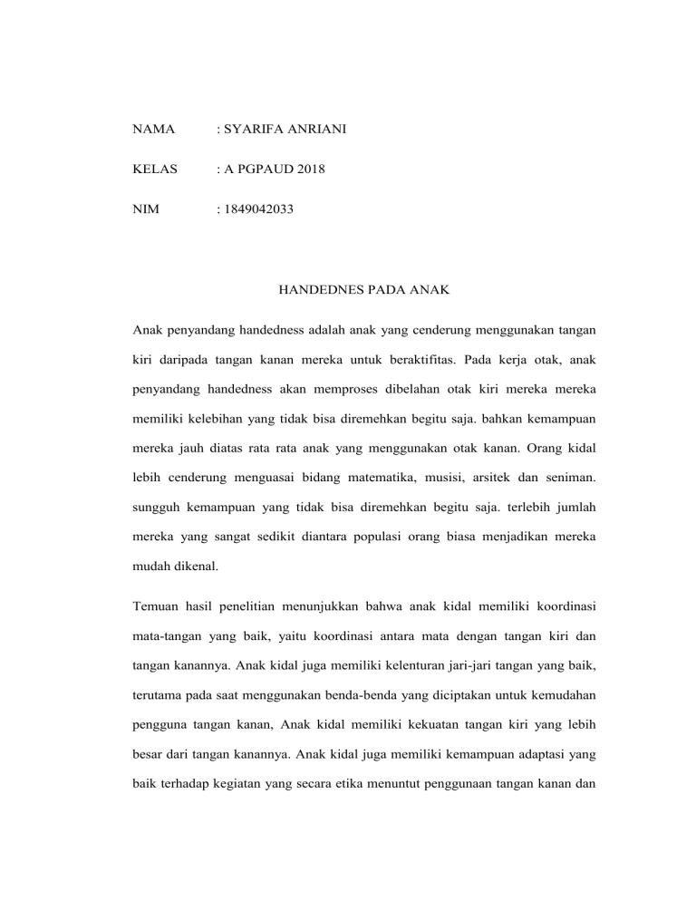 NAMA : SYARIFA ANRIANI KELAS : A PGPAUD 2018 NIM : 1849042033 HANDEDNES PADA ANAK Anak penyandang handedness adalah anak yang cenderung menggunakan tangan kiri daripada tangan kanan mereka untuk beraktifitas. Pada kerja otak, anak penyandang handedness akan memproses dibelahan otak kiri mereka mereka memiliki kelebihan yang tidak bisa diremehkan begitu saja. bahkan kemampuan mereka jauh diatas rata rata anak yang menggunakan otak kanan. Orang kidal lebih cenderung menguasai bidang matematika, musisi, arsitek dan seniman. sungguh kemampuan yang tidak bisa diremehkan begitu saja. terlebih jumlah mereka yang sangat sedikit diantara populasi orang biasa menjadikan mereka mudah dikenal. Temuan hasil penelitian menunjukkan bahwa anak kidal memiliki koordinasi mata-tangan yang baik, yaitu koordinasi antara mata dengan tangan kiri dan tangan kanannya. Anak kidal juga memiliki kelenturan jari-jari tangan yang baik, terutama pada saat menggunakan benda-benda yang diciptakan untuk kemudahan pengguna tangan kanan, Anak kidal memiliki kekuatan tangan kiri yang lebih besar dari tangan kanannya. Anak kidal juga memiliki kemampuan adaptasi yang baik terhadap kegiatan yang secara etika menuntut penggunaan tangan kanan dan pada penggunaan benda-benda yang di buat untuk kemudahan pengguna tangan kanan. Pada tahapan imitasi anak kidal tetap mempertahankan kekidalannya dalam mengimitasi kegiatan-kegiatan yang dilakukan model dengan dominasi tangan kanan. Anak yang kidal terpantau lebih sulit melakukan aktivitas motorik halus, daripada anak-anak yang tidak kidal. Fasilitas dan alat bisa menjadi penyebab perkembangan motorik halus anak kidal tidak optimal. Pasalnya, banyak sekali fasilitas dan peralatan yang tidak memungkinkan untuk digunakan oleh anak kidal. Pengembangan keterampilan motorik halus anak dengan dominasi tangan kiri penting untuk perkembangan kemampuan lainnya. Tidak ada perkembangan yang berdiri sendiri, setiap aspek perkembangan berpengaruh pada aspek perkembangan lainnya. Perkembangan keterampilan motorik halus yang baik pada anak kidal, memudahkan anak tersebut dalam berbagai kegiatan. Keterampilan motorik halus anak tidak akan berkembang melalui kematangan usia begitu saja, tetapi perlu mendapatkan stimulasi agar perkembangannya menjadi optimal. Kidal tidak hanya menggunakan tangan kirinya sebagai tangan utama (superior) dan menjadikan tangan kanannya sebagai tangan pembantu (inferior), tetapi dalam kondisi tertentu, anak kidal juga harus melakukan hal sebaliknya, menjadikan tangan kanannya sebagai tangan superior dan tangan kiri sebagai tangan inferior. Anak dengan dominasi tangan kiri dapat menggunakan beberapa benda dan fasilitas yang memang diciptakan untuk kemudahan pengguna tangan kanan, namun dalam kondisi sebaliknya anak dengan dominasi tangan kanan, belum tentu dapat menggunakan benda-benda yang diciptakan khusus. Perkembangan fisik anak usia lima sampai enam tahun memiliki pilihan penggunaan tangan yang stabil. Pernyataan tersebut menegaskan bahwapada usia 6 tahun pilihan penggunaan tangan pada anak sudah menetap,sehingga sangat kecil kemungkinan anak pada usia tersebut mengubahkebiasaan penggunaan tangannya.