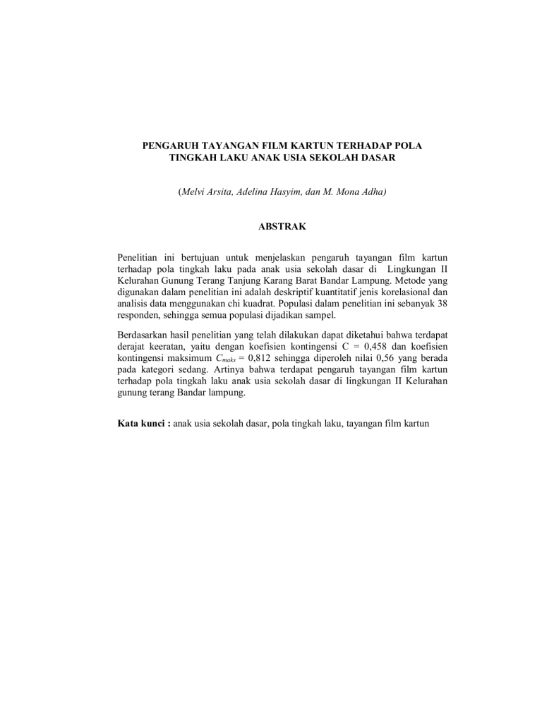PENGARUH TAYANGAN FILM KARTUN TERHADAP POLA TINGKAH LAKU ANAK USIA SEKOLAH DASAR (Melvi Arsita, Adelina Hasyim, dan M. Mona Adha) ABSTRAK Penelitian ini bertujuan untuk menjelaskan pengaruh tayangan film kartun terhadap pola tingkah laku pada anak usia sekolah dasar di Lingkungan II Kelurahan Gunung Terang Tanjung Karang Barat Bandar Lampung. Metode yang digunakan dalam penelitian ini adalah deskriptif kuantitatif jenis korelasional dan analisis data menggunakan chi kuadrat. Populasi dalam penelitian ini sebanyak 38 responden, sehingga semua populasi dijadikan sampel. Berdasarkan hasil penelitian yang telah dilakukan dapat diketahui bahwa terdapat derajat keeratan, yaitu dengan koefisien kontingensi C = 0,458 dan koefisien kontingensi maksimum Cmaks = 0,812 sehingga diperoleh nilai 0,56 yang berada pada kategori sedang. Artinya bahwa terdapat pengaruh tayangan film kartun terhadap pola tingkah laku anak usia sekolah dasar di lingkungan II Kelurahan gunung terang Bandar lampung. Kata kunci : anak usia sekolah dasar, pola tingkah laku, tayangan film kartun THE INFLUENCE OF CARTOON MOVIES AGAINST THE PATTERN TOWARDS BEHAVIOUR IN SCHOOL AGE CHILDREN BASE (Melvi Arsita, Adelina Hasyim, dan M. Mona Adha) ABSTRACT This research aims to explain influence of cartoon movies against the behaviour pattern in school age children base environment II Kelurahan Gunung Terang Tanjung Karang Barat Bandar Lampung. The method of this research uses quantitative descriptive correlational type and data analysis uses chi squared. Population of this research is 38 people, so all of population is sample. Based on research that has been done, it can be seen that there is a degree of closeness, the contingency coefficient C = 0,458 Cmaks = 0,812 obtained a value of 0,56 classified in medium category. It means that there is influence of cartoon movies against the behaviour pattern in school age children base environment II Kelurahan Gunung Terang Tanjung Karang Barat Bandar Lampung. Key words: school age children in basis, patterns of behavior, cartoon movies, PENDAHULUAN Latar Belakang Masalah Masa anak-anak adalah masa dimana anak akan meniru segala sesuatu yang dilihatnya. Setiap anak memiliki karakteristik perkembangan yang berbeda-beda. Proses utama perkembangan anak merupakan hal yang saling berkaitan antara proses sosio emosional dan proses kognitif. Kedua hal tersebut akan saling berpengaruh satu sama lain dan sepanjang perjalanan hidup manusia. Selama proses perkembangan, tidak menutup kemungkinan anak menghadapi berbagai masalah yang akan menghambat proses perkembangan selanjutnya. Permasalahan yang dihadapi anak dapat dilihat melalui tingkah laku anak pada saat mengikuti proses pembelajaran di kelas atau pada saat anak bermain. Menurut Rita Eka Izzaty (2005:41) “Berbagai faktor yang menyebabkan permasalahan perkembangan anak tidak hanya menghambat perkembangan emosi dan sosial, akan tetapi juga menghambat perkembangan fisik, intelektual, kognitif dan bahasa”. Pergaulan sehari-hari anak-anak sering berinteraksi dengan teman sebaya, anakanak akan mengekspresikan segala sesuatu yang ia lihat sebelumnya, contohnya meniru kebiasaan orang-orang di sekelilingnya, misalnya cara bertingkah laku. Tingkah laku merupakan seperangkat perbuatan atau tindakan seseorang dalam melakukan respon terhadap sesuatu dan kemudian dijadikan kebiasaan karena adanya nilai yang diyakini. Tingkah laku manusia pada dasarnya terdiri dari komponen pengetahuan (kognitif), sikap (afektif), dan keterampilan (psikomotor) atau tindakan. Dalam konteks ini maka setiap perubahan seseorang dalam merespon sesuatu pastilah terkonseptualisasikan dari tiga ranah ini. Tingkah laku anak yang baik dapat didukung oleh tindakan atau prilaku orangorang di sekelilingnya yang mencerminkan tindakan positif, contohnya orang tua yang mengajari anaknya bagaimana cara bertutur kata yang baik, dan cara berprilaku sopan. Banyak faktor yang menjadi penghambat anak untuk berprilaku positif, yaitu adanya faktor internal dan faktor eksternal. Contoh dari faktor internal yang pertama adalah kecerdasan. Kecerdasan merupakan faktor psikologis yang paling penting dalam proses penyerapan tingkah laku. Karena kecerdasan seorang anak, dapat menilai mana tingkah laku yang harus ditiru dan mana tingkah laku yang tidak untuk ditiru yang bisa dia lihat dalam lingkungannya. Faktor eksternal pun menjadi salah satu penghambat anak untuk berprilaku positif. Contoh dari faktor eksternal adalah lingkungan keluarga. Keluarga merupakan tempat pertama kali anak menyerap tingkah laku. Oleh karena itu lingkungan keluarga sangat mempengaruhi proses belajar anak. Namun, apabila ada keluarga yang tidak harmonis akan memberi dampak negatif pada anak dalam berperilaku. Pertikaian, kesibukan dan kurang perhatianya orang tua akan membuat anak merasa terbebani sehingga dapat terjadilah perubahan pola tingkah laku pada anak. Contoh lain dari faktor eksternal adalah lingkungan sosial masyarakat. Kondisi lingkungan masyarakat tempat tinggal juga mempengaruhi perubahan pola tingkah laku anak. Lingkungan pengangguran dan banyak teman sebaya yang tidak sekolah dapat menjadi faktor yang menimbulkan perubahan pola tingkah laku anak. Misalnya anak meniru kebiasaan-kebiasaan buruk temanteman sebayanya baik ucapan maupun tingkah laku. Semakin banyaknya media massa seperti televisi pun menjadi salah satu faktor yang dapat mempengaruhi imitasi pola tingkah laku anak. Media massa yang, dianggap paling mempengaruhi khalayaknya dalam hal penyampaian informasi adalah televisi. Televisi merupakan salah satu media elektronik yang hampir seluruh lapisan masyarakat dapat menikmatinya. Media ini menyediakan informasi baik berita, pengetahuan, maupun hiburan yang dapat dinikmati oleh masyarakat secara bebas. Hasil dari pemerolehan informasi tersebut dapat berupa pengetahuan, perilaku, dan pemikiran yang telah terkontaminasi. Kehadiran televisi dalam kehidupan manusia memunculkan suatu peradaban, khususnya dalam pros