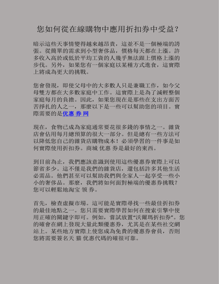 您如何從在線購物中應用折扣券中受益? 暗示這些天事情變得越來越昂貴,這並不是一個極端的誇 張。從簡單的需求到小型奢侈品,價格每天都在上漲。許 多收入高於或低於平均工資的人幾乎無法跟上價格上漲的 步伐。另外,如果您有一個家庭以某種方式進食,這實際 上將成為更大的挑戰。 您會發現,即使父母中的大多數人只是兼職工作,如今父 母雙方都在大多數家庭中工作。這實際上是為了減輕整個 家庭每月的負擔。因此,如果您現在是那些在支出方面苦 苦掙扎的人之一,那麼以下是一些可以幫助您的項目。實 際需要的是优惠 券 网 現在,食物已成為家庭通常要花很多錢的事情之一。雜貨 店會佔用每月總預算的很大一部分。但是總有一些方法可 以降低您自己的雜貨店購物成本!必須學習的一件事是如 何實際使用折扣券。商城 优惠 券是最好的東西。 到目前為止,我們應該意識到使用這些優惠券實際上可以 節省多少。這不僅是我們的雜貨店,還包括許多其他生活 必需品。他們甚至可以幫助我們與全家人一起享受一些小 小的奢侈品。那麼,我們將如何面對極端的優惠券挑戰? 您可以輕鬆地淘宝 领 券。 首先,檢查虛擬市場。這可能是實際尋找一些最佳折扣券 的最佳地點之一。您只需要實際學習如何在搜索引擎中使 用正確的關鍵字即可。例如,嘗試放置“沃爾瑪折扣券”。您 的確會在網上發現大量此類優惠券,尤其是在某些社交網 站上。某些地方實際上使您成為免費的優惠券會員,否則 您將需要簽名天 猫 优惠代碼的確很可靠。 在線獲得更好的優惠券的另一種可能方法是註冊您最喜歡 的零售商的電子郵件和折扣優惠。這很明顯,但是大多數 人都不知道。 雖然不是唯一的優惠券應用程序,常規銷售網站甚至可以 降低價格,但團體和生活社交等網站可以利用團體購買力 以某種方式獲得巨大折扣。天 猫 购物 券將為您提供最好的 折扣。 您仍然應該搜尋雜誌。如果您以某種方式喜歡購買一些雜 誌,請幾乎完全使用它們。僅需進行一點點適當的盡職調 查,即可將所有這些內容從您的閱讀內容堆中刪除。您不 僅可以看到食物券,還可以看到衣服,化妝品和其他一些 物品。請隨時注意兒童玩具,運動鞋和其他時尚優惠券。 第三,也是最後,進行在線折扣交易。在很多地方,您都 可以將自己不需要的優惠券兌換成更有價值的優惠券。因 此,無論如何,都要多加註意,您會發現自己的預算中特 定的極端優惠券的主要區別將是什麼!