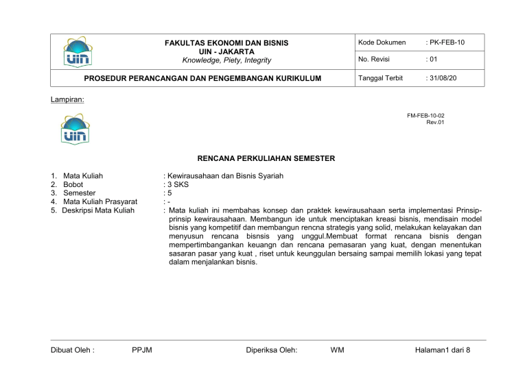 FAKULTAS EKONOMI DAN BISNIS UIN - JAKARTA Knowledge, Piety, Integrity PROSEDUR PERANCANGAN DAN PENGEMBANGAN KURIKULUM Kode Dokumen : PK-FEB-10 No. Revisi : 01 Tanggal Terbit : 31/08/20 Lampiran: FM-FEB-10-02 Rev.01 RENCANA PERKULIAHAN SEMESTER 1. 2. 3. 4. 5. Mata Kuliah Bobot Semester Mata Kuliah Prasyarat Deskripsi Mata Kuliah Dibuat Oleh : PPJM : Kewirausahaan dan Bisnis Syariah : 3 SKS :5 :: Mata kuliah ini membahas konsep dan praktek kewirausahaan serta implementasi Prinsipprinsip kewirausahaan. Membangun ide untuk menciptakan kreasi bisnis, mendisain model bisnis yang kompetitif dan membangun rencna strategis yang solid, melakukan kelayakan dan menyusun rencana bisnsis yang unggul.Membuat format rencana bisnis dengan mempertimbangankan keuangn dan rencana pemasaran yang kuat, dengan menentukan sasaran pasar yang kuat , riset untuk keunggulan bersaing sampai memilih lokasi yang tepat dalam menjalankan bisnis. Diperiksa Oleh: WM Halaman1 dari 8 FAKULTAS EKONOMI DAN BISNIS UIN - JAKARTA Knowledge, Piety, Integrity PROSEDUR PERANCANGAN DAN PENGEMBANGAN KURIKULUM Kode Dokumen : PK-FEB-10 No. Revisi : 01 Tanggal Terbit : 31/08/20 6. Minggu ke- 1 Kompetensi Dasar (TIU) Orientasi Materi Standar (Pokok Bahasan) Indikator (TIK) Penilaian Penjelasan dan diskusi daring Mahasiswa saling mengenal Orientasi Strategi dan Langkah Perkuliahan Keaktifan mahasiswa dalam kelas 2 3 Mahasiswa dapat memahami konsep kewirausahaan dalam Islam Mahasiswa dapat memahami karakter wirausahawan Dibuat Oleh : Definisi Karakter Tujuan Ayat & Motivasi Hadits Karakter Wirausaha Mahasiswa dapat menjelaskan tentang karakter wirausaha di masa pandemi Pengendali Dokumen Sumber Referensi: Media: Komputer dan WA Group, Google Classroom, Google Meet Motivasi Kewirausahaan Mahasiswa mampu menjelaskan tentang: 1. Definisi 2. Karakter 3. Tujuan 4. Ayat & Hadits Buku Sumber dan Media Menjelaskan dan diskusi daring Keaktifan mahasiswa dalam kelas Sumber Referensi: Media: Komputer dan WA Group, Google Classroom, Google Meet Observasi dan wawancara Diperiksa Oleh: Keaktifan mahasiswa WM Sumber Referensi: Halaman2 dari 8 Alokasi Waktu Ceramah + Presentas i 100 menit Diskusi 50 menit Ceramah + Presentas i 100 menit Diskusi 50 menit Observasi 100 menit FAKULTAS EKONOMI DAN BISNIS UIN - JAKARTA Knowledge, Piety, Integrity PROSEDUR PERANCANGAN DAN PENGEMBANGAN KURIKULUM Kode Dokumen : PK-FEB-10 No. Revisi : 01 Tanggal Terbit : 31/08/20 wirausahawan sekitar rumah Menjelaskan dan diskusi 4 5 Mahasiswa dapat memahami karakter wirausahawan Mahasiswa dapat memahami karakter wirausahawan Dibuat Oleh : Karakter Wirausaha Karakter Wirausaha Mahasiswa dapat menjelaskan tentang karakter wirausaha di masa pandemi Mahasiswa dapat menjelaskan tentang karakter wirausaha di masa pandemi Pengendali Dokumen Observasi dan wawancara wirausahawan sekitar rumah Menjelaskan dan diskusi Observasi dan wawancara wirausahawan sekitar rumah Menjelaskan dan diskusi Diperiksa Oleh: WM dalam kelas Presentasi daring Keaktifan mahasiswa dalam kelas Presentasi daring Keaktifan mahasiswa dalam kelas Presentasi daring Diskusi 50 menit Media: Komputer dan WA Group, Google Classroom, Google Meet Sumber Referensi: Observasi 100 menit Diskusi 50 menit Media: Komputer dan WA Group, Google Classroom, Google Meet Sumber Referensi: Observasi 100 menit Diskusi 50 menit Media: Komputer dan WA Group, Google Classroom, Google Meet Halaman3 dari 8 FAKULTAS EKONOMI DAN BISNIS UIN - JAKARTA Knowledge, Piety, Integrity PROSEDUR PERANCANGAN DAN PENGEMBANGAN KURIKULUM 6 7 Mahasiswa mampu memahami konsep dasar marketing mix Mahasiswa mampu memahami konsep dasar marketing mix Marketing Mix 4P to 7P Marketing Mix 4P to 7P Mahasiswa mampu menjelaskan tentang marketing mix dan mampu membuat: 1. weblog 2. FB/IG/Twitter/WA 3. Optimasi Socmed 4. Search Engine Optimization (SEO) Mahasiswa mampu menjelaskan tentang marketing mix dan mampu membuat: 1. weblog 2. FB/IG/Twitter/WA 3. Optimasi Socmed 4. Search Engine Optimization (SEO) : PK-FEB-10 No. Revisi : 01 Tanggal Terbit : 31/08/20 Sumber Referensi: SN Bab 3 Menjelaskan dan diskusi Keaktifan mahasiswa dalam kelas Tugas weblog dan socmed Media: Komputer dan WA Group, Google Classroom, Google Meet Sumber Referensi: SN Bab 3 Menjelaskan dan diskusi Keaktifan mahasiswa dalam kelas Quiz Media: Komputer dan WA Group, Google Classroom, Google Meet Ceramah + Presentas i 100 menit Diskusi 50 menit Ceramah + Presentas i 100 menit Diskusi 50 menit UJIAN TENGAH SEMESTER 8 9 Kode Dokumen Mahasiswa mampu memahami dan membuat business Dibuat Oleh : Business Model Canvas (BMC) Mahasiswa menjelaskan elemen BMC Pengendali Dokumen mampu tentang 9 Menjelaskan dan diskusi Diperiksa Oleh: Keaktifan mahasiswa dalam kelas WM Sumber Referensi: Halaman4 dari 8 Ceramah + Presentas FAKULTAS EKONOMI DAN BISNIS UIN - JAKARTA Knowledge, Piety, Integrity PROSEDUR PERANCANGAN DAN PENGEMBANGAN KURIKULUM Kode Dokumen : PK-FEB-10 No. Revisi : 01 Tanggal Terbit : 31/08/20 model canvas Mahasiswa mampu memahami dan membuat business model canvas Media: Komputer dan WA Group, Google Classroom, Google Meet Business Model Canvas (BMC) Mahasiswa menjelaskan elemen BMC mampu tentang 9 Menjelaskan dan diskusi Keaktifan mahasiswa dalam kelas Tugas membuat BMC 10 Mahasiswa mampu memahami dan membuat SWOT analysis SWOT Analysis 11 12 Mahasiswa mampu memahami dan Dibuat Oleh : Sumber Referensi: SWOT Analysis Mahasiswa mampu menjelaskan tentang: 1. SWOT analysis 2. Matrix SWOT 3. Strategi SWOT Mahasiswa mampu menjelaskan tentang: Pengendali Dokumen Menjelaskan dan diskusi Keaktifan mahasiswa dalam kelas Menjelaskan dan diskusi Diperiksa Oleh: Keaktifan mahasiswa WM Media: Komputer dan WA Group, Google Classroom, Google Meet Sumber Referensi: SN Bab 3 Media: Komputer dan WA Group, Google Classroom, Google Meet Sumber Referensi: Halaman5 dari 8 i 100 menit Diskusi 50 menit Ceramah + Presentas i 100 menit Diskusi 50 menit Ceramah + Presentas i 100 menit Diskusi 50 menit Ceramah + FAKULTAS EKONOMI DA