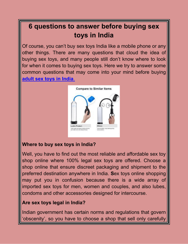 6 questions to answer before buying sex toys in India Of course, you can’t buy sex toys India like a mobile phone or any other things. There are many questions that cloud the idea of buying sex toys, and many people still don’t know where to look for when it comes to buying sex toys. Here we try to answer some common questions that may come into your mind before buying adult sex toys in India. Where to buy sex toys in India? Well, you have to find out the most reliable and affordable sex toy shop online where 100% legal sex toys are offered. Choose a shop online that ensure discreet packaging and shipment to the preferred destination anywhere in India. Sex toys online shopping may put you in confusion because there is a wide array of imported sex toys for men, women and couples, and also lubes, condoms and other accessories designed for intercourse. Are sex toys legal in India? Indian government has certain norms and regulations that govern ‘obscenity’, so you have to choose a shop that sell only carefully selected products via internet platform in a tasteful manner, keeping the norms in mind. Female or male sex toys in India are being checked and approved by Indian customers to ensure it is 100% legal and complaint in Indian laws and norms. Are sex toys safe to use? When you need to buy sex toys for men or women, you should make it from a trusted source. Pick a site where sex toys are carefully chosen and sourced from international brands. Ensure the sex toys you find at the website are made of body-safe materials, such as medical grade silicone. Hence, you can ensure hygiene and safety to use. How to choose the right one? Shopping for sex toys is not like buying any other things. You might feel awkward, overwhelming and difficult to identify the premium quality products from the duds. How can you understand the difference between plug-in and battery powered? Do you need a toy that looks like a penis? Does voltage really matter? So, before you make a move, understand and confirm the kind of pleasure you want and which sex toy will give you that pleasure. A trusted sex toys source will have extensive product reviews from users and expert guides. Consider the reviews and consult friends and doctors as well. Do sex toys really help you towards satisfaction? Well, asking if sex toys help is like asking is sex really all that good! Thousands of sex toys users claim that their first sex toy has changed their lives. Remember, if you don’t try, you will never know. So, choose one and go for it before missing the big joys of lifetime. They are healthy too! Whom to consult before buying a sex toy? You can visit a sex therapist or counselor and they might refer you to a platform or give a list of products that you can use daily to pep up your sex life. Don’t shy away! Open up your mind and you will start enjoying the unexplored facets of sex.