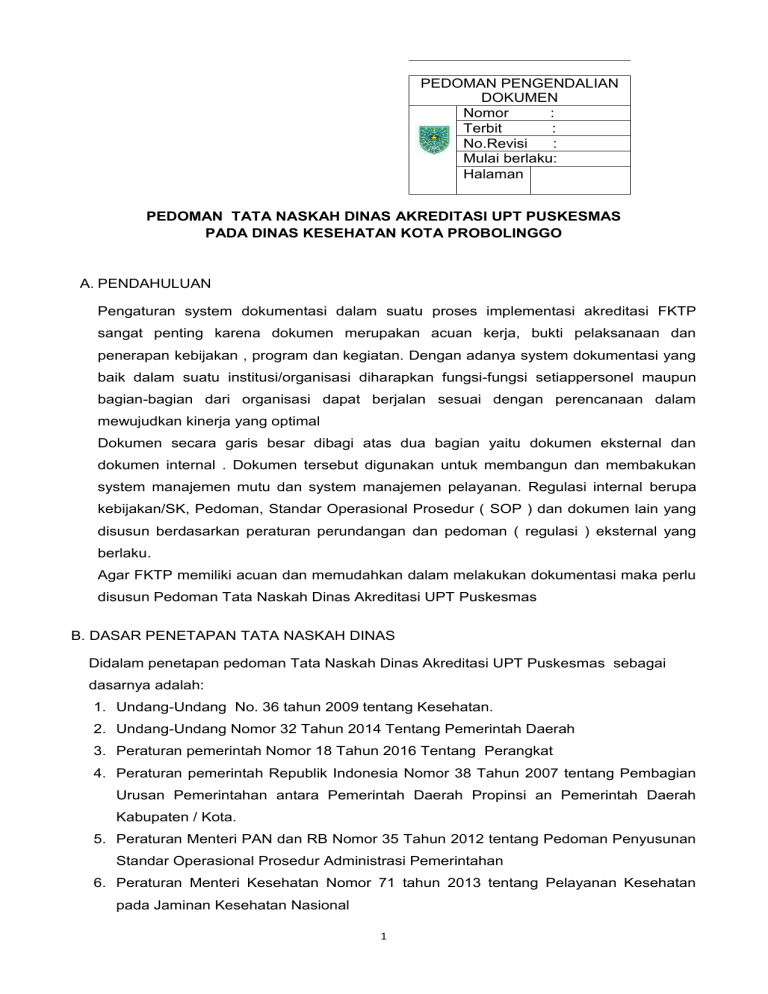 PEDOMAN PENGENDALIAN DOKUMEN Nomor : Terbit : No.Revisi : Mulai berlaku: Halaman PEDOMAN TATA NASKAH DINAS AKREDITASI UPT PUSKESMAS PADA DINAS KESEHATAN KOTA PROBOLINGGO A. PENDAHULUAN Pengaturan system dokumentasi dalam suatu proses implementasi akreditasi FKTP sangat penting karena dokumen merupakan acuan kerja, bukti pelaksanaan dan penerapan kebijakan , program dan kegiatan. Dengan adanya system dokumentasi yang baik dalam suatu institusi/organisasi diharapkan fungsi-fungsi setiappersonel maupun bagian-bagian dari organisasi dapat berjalan sesuai dengan perencanaan dalam mewujudkan kinerja yang optimal Dokumen secara garis besar dibagi atas dua bagian yaitu dokumen eksternal dan dokumen internal . Dokumen tersebut digunakan untuk membangun dan membakukan system manajemen mutu dan system manajemen pelayanan. Regulasi internal berupa kebijakan/SK, Pedoman, Standar Operasional Prosedur ( SOP ) dan dokumen lain yang disusun berdasarkan peraturan perundangan dan pedoman ( regulasi ) eksternal yang berlaku. Agar FKTP memiliki acuan dan memudahkan dalam melakukan dokumentasi maka perlu disusun Pedoman Tata Naskah Dinas Akreditasi UPT Puskesmas B. DASAR PENETAPAN TATA NASKAH DINAS Didalam penetapan pedoman Tata Naskah Dinas Akreditasi UPT Puskesmas sebagai dasarnya adalah: 1. Undang-Undang No. 36 tahun 2009 tentang Kesehatan. 2. Undang-Undang Nomor 32 Tahun 2014 Tentang Pemerintah Daerah 3. Peraturan pemerintah Nomor 18 Tahun 2016 Tentang Perangkat 4. Peraturan pemerintah Republik Indonesia Nomor 38 Tahun 2007 tentang Pembagian Urusan Pemerintahan antara Pemerintah Daerah Propinsi an Pemerintah Daerah Kabupaten / Kota. 5. Peraturan Menteri PAN dan RB Nomor 35 Tahun 2012 tentang Pedoman Penyusunan Standar Operasional Prosedur Administrasi Pemerintahan 6. Peraturan Menteri Kesehatan Nomor 71 tahun 2013 tentang Pelayanan Kesehatan pada Jaminan Kesehatan Nasional 1 7. Keputusan Menteri Kesehatan Nomor 59/2015 tentang Komisi Akreditasi FKTP. 8. Peraturan Menteri Kesehatan Nomor 75 tahun 2014 tentang Puskesmas, 9. Peraturan Menteri Kesehatan Nomor 71 tahun 2013 tentang Pelayanan Kesehatan pada Jaminan Kesehatan Nasional 10. Peraturan Menteri Kesehatan Nomor 46 tahun 2015 tentang Akreditasi Puskesmas, Klinik Pratama, Tempat Praktek Mandiri Dokter dan Tempat Praktik Mandiri Dokter Mandiri. 11. Peraturan Walikota Probolinggo Nomor 20 Tahun 2011 tentang Pedoman Tata Naskah Dinas di Lingkungan Pemerintah Kota Probolinggo. 12. Pedoman Penyusunan Dokumen Akreditasi FKTP Direktorat Jenderal Bina Upaya Kesehatan Direktorat Bina Upaya Kesehatan Dasar Tahun 2015 C. PENGERTIAN TATA NASKAH DINAS AKREDITASI 1. Pedoman Tata Naskah Dinas Akreditasi UPT Puskemas pada Dinas Kesehatan Kota Probolinggo adalah sistem pengelolaan dokumen/ surat menyurat dan rekaman implementasi, yang meliputi sistem penyusunan tata naskah untuk penyelenggaraan manajemen puskesmas, penyelenggaraan Upaya Kesehatan Masyarakat dan Penyelenggaraan Upaya Kesehatan Perorangan 2. Dokumen penyelenggaraan manajemen Puskesmas meliputi Rencana Lima Tahunan Puskesmas, Pedoman/Manual mutu, Pedoman/Panduan teknis yang terkait manajemen, Standar Operasional Prosedur, Perencanaan Tingkat Puskesmas serta Kerangka Acuan Kegiatan 3. Dokumen penyelenggaraan Upaya Kesehatan Masyarakat meliputi kebijakan Kepala Puskesmas, Pedoman masing-masing UKM, Standar Operasional Prosedur ( SOP ), Rencana Tahunan untuk masing-masing UKM, Kerangka Acuan Kerja untuk masingmasing UKM 4. Dokumen penyelenggaraan Upaya Kesehatan Perorangan meliputi kebijakan tentang Pelayanan Klinis, Pedoman Pelayanan Klinis, Standar Operasional Prosedur ( SOP ) klinis , Kerangka Acuan Kerja terkait dengan program/kegiatan Pelayanan Klinis dan Peningkatan Mutu dan Keselamatan Pasien 5. Dokumen eksternal adalah: buku, peraturan, standar, surat keputusan, kebijakan yang merupakan acuan/ referensi di dalam penyusunan dokumen akreditasi Puskesmas, D. KETENTUAN TATA NASKAH DINAS AKREDITASI UPT PUSKESMAS I. KEBIJAKAN Kebijakan adalah Peraturan/Surat Keputusan yang ditetapkan oleh Kepala UPT Puskesmas yang merupakan garis besar yang bersifat mengikat dan wajib dilaksanakan oleh penanggungjawab maupun pelaksana. Format Peraturan/Surat Keputusan adalah sebagai berikut : 2 1. Memakai Kertas dengan Kop Surat UPT Puskesmas dengan menggunakan kertas ukuran Folio ( 21cm x 33 cm ) dengan penulisan menggunakan margin atas 2 cm , margin kiri 2 cm, margin kanan 2 cm dan margin bawah 2 cm 2. Penulisan kebijakan dengan menggunakan huruf Arial font 12 dengan spasi 1,5 3. Pembukaan Kebijakan ditulis dengan huruf Kapital menggunakan huruf Arial font ukuran 12 Bold 4. Nomor ditulis sesuai system penomoran UPT Puskesmas 5. Judul ditulis dengan huruf capital Arial font 12 Bold 6. Jabatan pembuat keputusan ditulis Kepala UPT kesmas dengan huruf capital Arial 12 Bold 7. Konsideran meliputi a. Menimbang 1) Memuat uraian singkat tentang pokok pikiran/landasan filosofis, sosiologis dan konklusi 2) Huruf awal kata menimbang diawali dengan huruf capital dengan tanda baca titik ( : ) dan diletakkan dibagian kiri 3) Konsideran menimbang diawali dengan penomoran menggunakan huruf kecil dengan kata “ bahwa” dengan b huruf kecil dan diakhiri dengan tanda baca titik koma ( ; ) 4) Jumlah konsideran menimbang ada 3 yang meliputi a ( landasan filosofis ), b ( landasan sosiologis ) dan c ( konklusi ) b. Mengingat 1) Memuat dasar kewenangan dan peraturan perundangan yang memerintahkan pembuatan kebijakan tersebut 2) Peraturan perundangan yang menjadi dasar hukum adalah peraturan yang tingkatannya lebih tinggi 3) Kata “ mengingat” diletakkan dibagian kiri sejajar dengan kata menimbang dengan diawali huruf capital 4) Konsideran yang berupa peraturan perundangan diurutkan sesuai dengan hirarki tata perundangan dengan tahun yang awal disebut terlebih dahulu diawali dengan nomor 1,2,3 dst dan diakhiri dengan tanda baca ( ; ) c. Diktum 1) Diktum Memutuskan ditulis dengan huruf capital seluruhnya dan diletakkan ditengah 2) Diktum mene
