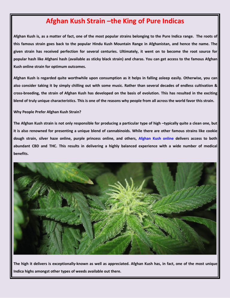 Afghan Kush Strain –the King of Pure Indicas Afghan Kush is, as a matter of fact, one of the most popular strains belonging to the Pure Indica range. The roots of this famous strain goes back to the popular Hindu Kush Mountain Range in Afghanistan, and hence the name. The given strain has received perfection for several centuries. Ultimately, it went on to become the root source for popular hash like Afghani hash (available as sticky black strain) and charas. You can get access to the famous Afghan Kush online strain for optimum outcomes. Afghan Kush is regarded quite worthwhile upon consumption as it helps in falling asleep easily. Otherwise, you can also consider taking it by simply chilling out with some music. Rather than several decades of endless cultivation & cross-breeding, the strain of Afghan Kush has developed on the basis of evolution. This has resulted in the exciting blend of truly unique characteristics. This is one of the reasons why people from all across the world favor this strain. Why People Prefer Afghan Kush Strain? The Afghan Kush strain is not only responsible for producing a particular type of high –typically quite a clean one, but it is also renowned for presenting a unique blend of cannabinoids. While there are other famous strains like cookie dough strain, silver haze online, purple princess online, and others, Afghan Kush online delivers access to both abundant CBD and THC. This results in delivering a highly balanced experience with a wide number of medical benefits. The high it delivers is exceptionally-known as well as appreciated. Afghan Kush has, in fact, one of the most unique Indica highs amongst other types of weeds available out there. Effects of Afghan Kush It is believed that from the moment you get its inhalation, the high effect of the Indica strain is going to seep into your body instantly. It feels like a major rush of varying sensations that pour through the insides of the body while calming & soothing you instantly. Just like with other potent Indicas out there, as the high approaches its end, you will feel experience lethargy slightly. It is recommended to lie down and relax a little bit. For the beginners, one of the most significant medical benefits of Afghan Kush is treating with insomnia. In addition to this, the strain also helps in reducing stress along with other negative mental consequences.