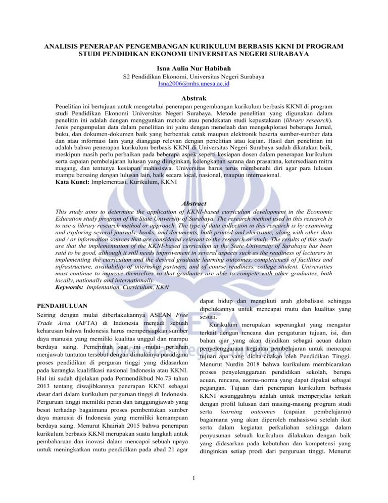 ANALISIS PENERAPAN PENGEMBANGAN KURIKULUM BERBASIS KKNI DI PROGRAM STUDI PENDIDIKAN EKONOMI UNIVERSITAS NEGERI SURABAYA Isna Aulia Nur Habibah S2 Pendidikan Ekonomi, Universitas Negeri Surabaya [email protected] Abstrak Penelitian ini bertujuan untuk mengetahui penerapan pengembangan kurikulum berbasis KKNI di program studi Pendidikan Ekonomi Universitas Negeri Surabaya. Metode penelitian yang digunakan dalam penelitin ini adalah dengan menggunkan metode atau pendekatan studi kepustakaan (library research). Jenis pengumpulan data dalam penelitian ini yaitu dengan menelaah dan mengekplorasi beberapa Jurnal, buku, dan dokumen-dokumen baik yang berbentuk cetak maupun elektronik beserta sumber-sumber data dan atau informasi lain yang dianggap relevan dengan penelitian atau kajian. Hasil dari penelitian ini adalah bahwa penerapan kurikulum berbasis KKNI di Universitas Negeri Surabaya sudah dikatakan baik, meskipun masih perlu perbaikan pada beberapa aspek seperti kesiapan dosen dalam penerapan kurikulum serta capaian pembelajaran lulusan yang diinginkan, kelengkapan sarana dan prasarana, ketersediaan mitra magang, dan tentunya kesiapan mahasiswa. Universitas harus terus membenahi diri agar para lulusan mampu bersaing dengan lulusan lain, baik secara local, nasional, maupun internasional. Kata Kunci: Implementasi, Kurikulum, KKNI Abstract This study aims to determine the application of KKNI-based curriculum development in the Economic Education study program of the State University of Surabaya. The research method used in this research is to use a library research method or approach. The type of data collection in this research is by examining and exploring several journals, books, and documents, both printed and electronic, along with other data and / or information sources that are considered relevant to the research or study. The results of this study are that the implementation of the KKNI-based curriculum at the State University of Surabaya has been said to be good, although it still needs improvement in several aspects such as the readiness of lecturers in implementing the curriculum and the desired graduate learning outcomes, completeness of facilities and infrastructure, availability of internship partners, and of course readiness. college student. Universities must continue to improve themselves so that graduates are able to compete with other graduates, both locally, nationally and internationally. Keywords: Implentation, Curriculum, KKN dapat hidup dan mengikuti arah globalisasi sehingga dipelukannya untuk mencapai mutu dan kualitas yang sesuai. Kurikulum merupakan seperangkat yang mengatur terkait dengan rencana dan pengaturan tujuan, isi, dan bahan ajar yang akan dijadikan sebagai acuan dalam penyelenggaraan kegiatan pembelajaran untuk mencapai tujuan apa yang dicita-citakan oleh Pendidikan Tinggi. Menurut Nurdin 2018 bahwa kurikulum membicarakan proses penyelenggaraan pendidikan sekolah, berupa acuan, rencana, norma-norma yang dapat dipakai sebagai pegangan. Tujuan dari penerapan kurikulum berbasis KKNI sesungguhnya adalah untuk memperjelas terkait dengan profil lulusan dari masing-masing program studi serta learning outcomes (capaian pembelajaran) bagaimana yang akan diperoleh mahasiswa setelah ikut serta dalam kegiatan perkuliahan sehingga dalam penyusunan sebuah kurikulum dilakukan dengan baik yang didasarkan pada kebutuhan dan kompetensi yang diinginkan setiap prodi dari perguruan tinggi. Menurut PENDAHULUAN Seiring dengan mulai diberlakukannya ASEAN Free Trade Area (AFTA) di Indonesia menjadi sebuah keharusan bahwa Indonesia harus mempersiapkan sumber daya manusia yang memiliki kualitas unggul dan mampu berdaya saing. Pemerintah saat ini mulai perlahan menjawab tuntutan tersebut dengan dimulainya paradigma proses pendidikan di perguran tinggi yang didasarkan pada kerangka kualifikasi nasional Indonesia atau KKNI. Hal ini sudah dijelakan pada Permendikbud No.73 tahun 2013 tentang diwajibkannya penerapan KKNI sebagai dasar dari dalam kurikulum perguruan tinggi di Indonesia. Perguruan tinggi memiliki peran dan tanggungjawab yang besat terhadap bagaimana proses pembentukan sumber daya manusia di Indonesia yang memiliki kemampuan berdaya saing. Menurut Khairiah 2015 bahwa penerapan kurikulum berbasis KKNI merupakan suatu langkah untuk pembaharuan dan inovasi dalam mencapai sebuah upaya untuk meningkatkan mutu pendidikan pada abad 21 agar 1 Waseso dan Hidayat 2017 bahwa pentingnya menerapkan kurikulum berbasis KKNI pada prodi terletak pada standarisasi kompetensi mahasiswa dari prodi yang sama melalui level-level yang telah ditetapkan. Namun dalam hal ini terkait dengan penyusunan kurikulum antar prodi dalam perguruan tinggi terdapat sedikit kemungkinan dalam perbedaan out put yang akan dihasilkan, karena dari masing-masing perguruan tinggi sudah ada ketentuan capaian pembelajaran secara nasionalnya. Sehingga dimisalkan lulusan mahasiswa dari prodi Pendidikan Ekonomi Universitas Negeri Surabaya dengan lulusan mahasiswa dari prodi Pendidikan Ekonomi Universitas Negeri Malang tidak terdapat perbedaan dalam halnya tentang kualifikasi nasional yang dihasilkan. Dalam penelitian Siagian dan Siregar 2018 bahwa sejauh ini, kompetensi masa depan yang diharapkan untuk mempersiapkan sumber daya manusia yang bersaing secara nasional maupun global adalah: 1) memiliki kemampuan dalam berkomunikasi, 2) memiliki kemampuan dalam berpikir jernih dan kritis, 3) dapat mempertimbangkan segi moral dari suatu permasalahan, 4) menjadi warga negara yang bertanggung jawab, mencoba untuk mengerti dan toleran terhadap pandangan yang berbeda, 6) hidup dalam masyarakat yang mengglobal, 7) memiliki minat yang luas dalam kehidupan, 8) siap untuk bekerja, 9) memiliki kecerdasan sesuai bakat/minatnya, dan 10) memiliki rasa tanggung jawab terhadap lingkungan. Penerapan kurikulum pendidikan tinggi tersebut diharapkan dapat menghasilkan lulusan-lulusan yang bermutu dan relevan dengan pembangunan nasional termasuk keb