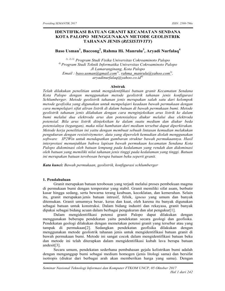 Prosiding SEMANTIK 2017 ISSN: 2580-796x IDENTIFIKASI BATUAN GRANIT KECAMATAN SENDANA KOTA PALOPO MENGGUNAKAN METODE GEOLISTRIK TAHANAN JENIS (RESISTIVITY) Baso Usman1, Baccong2, Rahma Hi. Manrulu3, Aryadi Nurfalaq4 1), 2),3) 4) Program Studi Fisika Universitas Cokroaminoto Palopo Program Studi Teknik Informatika Universitas Cokroaminoto Palopo Jl Lamaranginang, Kota Palopo Email : [email protected]), [email protected]), [email protected]) Abstrak Telah dilakukan penelitian untuk mengidentifikasi batuan granit Kecamatan Sendana Kota Palopo dengan menggunakan metode geolistrik tahanan jenis konfigurasi Schlumberger. Metode geolistrik tahanan jenis merupakan salah satu dari kelompok metode geofisika yang digunakan untuk mempelajari keadaan bawah permukaan dengan cara mempelajari sifat aliran listrik di dalam batuan di bawah permukaan bumi. Metode geolistrik tahanan jenis dilakukan dengan cara menginjeksikan arus listrik ke dalam bumi melalui dua elektroda arus dan potensialnya diukur melalui dua elektroda potensial. Bila arus listrik diinjeksikan ke dalam suatu medium dan diukur beda potensialnya (tegangan), maka nilai hambatan dari medium tersebut dapat diperkirakan. Metode kerja penelitian ini yaitu dengan membuat sebuah lintasan kemudian melakukan pengukuran dengan resistivitymeter, data yang diperoleh kemudian diolah menggunakan software IP2Win untuk mendapatkan gambaran struktur bawah permukaannya. Hasil interpretasi menunjukkan bahwa lapisan bawah permukaan kecamatan Sendana Kota Palopo didominasi oleh batuan lempung pada kedalaman yang rendah dan didominasi oleh batuan yang memiliki nilai tahanan jenis tinggi pada kedalaman yang tinggi. Batuan ini merupakan batuan terobosan berupa batuan beku seperti granit. Kata kunci: Bawah permukaan, geolistrik, konfigurasi schlumberger 1. Pendahuluan Granit merupakan batuan terobosan yang terjadi melalui proses pembekuan magma di permukaan bumi dengan temperatur yang stabil. Granit memiliki sifat asam, berbutir kasar hingga sedang, serta bewarna terang keabuan, kecoklatan, dan kemerahan. Selain itu, granit merupakan jenis batuan intrusif, felsik, igneus yang umum dan banyak ditemukan. Granit umumnya besar, keras dan kuat, oleh karena itu banyak digunakan sebagai batuan untuk konstruksi. Dalam bidang industri dan rekayasa, granit banyak dipakai sebagai bidang acuan dalam berbagai pengukuran dan alat pengukur[1]. Dalam mengidentifikasi potensi granit Palopo dapat dilakukan dengan menggunakan beberapa pendekatan yaitu pendekatan secara geologi dan geofisika. Pendekatan geologi dilakukan dengan memetakan potensi granit yang tersebar atau yang tampak di permukaan[2]. Sedangkan pendekatan geofisika dilakukan dengan menggunakan metode geolistrik tahanan jenis untuk mengidentifikasi batuan granit di bawah permukaan bumi. Metode ini sangat cocok dalam mengidentifikasi batuan beku dan metode ini telah diterapkan dalam mengidentifikasi kubah lava berupa batuan andesit[3]. Secara umum, pendekatan sederhana pembahasan gejala kelistrikan bumi adalah dengan menganggap bumi sebagai medium homogen (jenis litologi sama) dan bersifat isotropis (diukur dari berbagai arah akan memberikan harga yang sama). Dengan Seminar Nasional Teknologi Informasi dan Komputer FTKOM UNCP, 05 Oktober 2017 Hal 1 dari 242 Prosiding SEMANTIK 2017 ISSN: 2580-796x perlakuan tersebut medan listrik dari sumber titik di dalam bumi merupakan simetri bola. Prinsip metode geolistrik adalah dengan menginjeksi arus melalui elektroda arus C1 yang dibenamkan di dalam bumi. Elektroda ini dihubungkan dengan elektroda arus C2 lainnya yang berada di permukaan tetapi berjarak cukup jauh, sehingga pengaruhnya dapat diabaikan. Elektroda arus dapat dipandang sebagai titik sumber yang memancarkan arus listrik kesegala arah dalam medium bumi dengan tahanan jenis ρ. Prinsip kerja dari metode geolistrik ini adalah menginjeksikan arus kedalam bumi kemudian mengukur tegangan listriknya di permukaan bumi. Ekuipotensial di setiap titik di dalam bumi membentuk permukaan bola dengan jari-jari r. Arus listrik yang diinjeksikan melalui elektroda arus sebagai fungsi jarak dan kedalaman, mengalir keluar bola secara radial ke segala arah. Karena sumber arus terdapat di permukaan bumi, maka permukaan yang dilalui arus adalah setengah bola. Untuk menghitung tahanan jenis batuan dari batuan yang dilalui arus pada permukaan setengah bola[4] adalah sebagai berikut: 2 r V I ......(1) Apabila jarak antara dua elektroda arus tidak terlalu besar, potensial disetiap titik dekat permukaan akan dipengaruhi oleh kedua elektroda arus. Adapun potensial listrik yang dihasilkan dari kedua sumber arus ini adalah beda potensial yang terukur pada dua titik pengukuran potensial (P1 dan P2). Adapun beda potensial terukur antara titik P1 dan P2 adalah: V V ( P1 ) V ( P2 ) V dimana: r1= jarak C1 ke P1 r2= jarak C2 ke P1 r3= jarak C1 ke P2 r4 = jarak C2 ke P2 dengan: L C1C 2 2 I 2 1 1 1 1 r1 r2 r3 r4 ......(2) ......(3) dan l P1 P2 2 untuk lebih jelasnya lihat gambar berikut: Gambar 1. Susunan elektroda konfigurasi Schlumberger[5] Seminar Nasional Teknologi Informasi dan Komputer FTKOM UNCP, 05 Oktober 2017 Hal 2 dari 242 Prosiding SEMANTIK 2017 ISSN: 2580-796x Dengan mengatur persamaan-persamaan di atas, kita peroleh persamaan untuk resistivitas: V I Dimana K adalah faktor koreksi geometri yang dinyatakan dengan K ( L2 l 2 ) K 2l …...(4) …...(5) Faktor koreksi ini berubah-ubah tergantung dari konfigurasi apa yang digunakan. Faktor koreksi ini dilakukan karena pada umumnya lapisan batuan tidak mempunyai sifat homogen sempurna, seperti yang dipersyaratkan pada pengukuran geolistrik. Untuk posisi lapisan batuan yang terletak dekat dengan permukaan tanah akan sangat berpengaruh terhadap hasil pengukuran tegangan dan ini akan membuat data geolistrik menjadi menyimpang dari nilai sebenarnya. Faktor yang dapat mempengaruhi homogenitas lapisan batuan adalah fragmen batuan lain yang menyisip pada lapisan, faktor ketidakseragaman dari pelapukan batu
