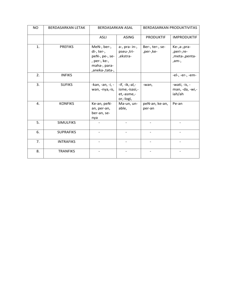 NO BERDASARKAN LETAK BERDASARKAN ASAL ASLI 1. PREFIKS 2. INFIKS 3. SUFIKS 4. KONFIKS 5. SIMULFIKS 6. SUPRAFIKS 7. 8. ASING MeN-, ber-, a-, pra- in-, di-, ter-, pseu-,tripeN-, pe-, se- ,ekstra, per-, ke-, maha-, para,aneka-,tata-, BERDASARKAN PRODUKTIVITAS PRODUKTIF IMPRODUKTIF Ber-, ter-, se,per-,ke- Ke-,a-,pra,peri-,re,meta-,penta,am-, -el-, -er-, -em-kan, -an, -i, wan, -nya,-is, Ke-an, peNan, per-an, ber-an, senya - -if, -ik,-al,isme,-isasi,et,-asme,or,-logi, Ma-un, unable, -wan, -wati, -is, man, -da, -wi,iah/ah peN-an, ke-an, per-an Pe-an - - - - - - - INTRAFIKS - - - - TRANFIKS - - - -