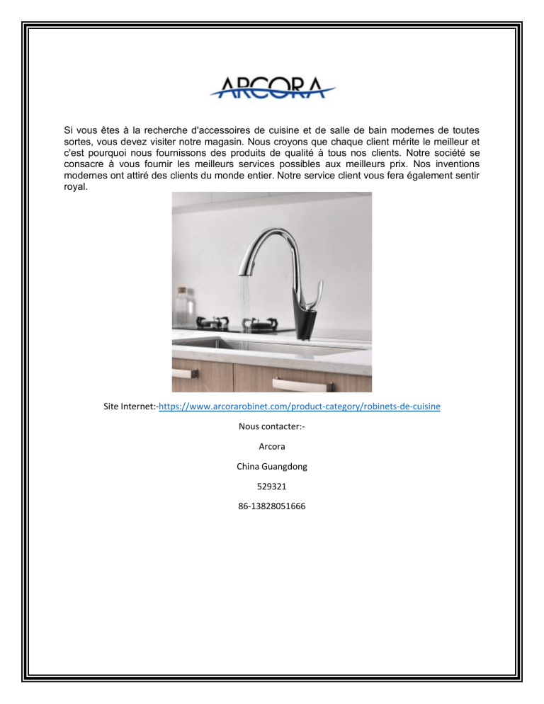 Si vous êtes à la recherche d'accessoires de cuisine et de salle de bain modernes de toutes sortes, vous devez visiter notre magasin. Nous croyons que chaque client mérite le meilleur et c'est pourquoi nous fournissons des produits de qualité à tous nos clients. Notre société se consacre à vous fournir les meilleurs services possibles aux meilleurs prix. Nos inventions modernes ont attiré des clients du monde entier. Notre service client vous fera également sentir royal. Site Internet:-https://www.arcorarobinet.com/product-category/robinets-de-cuisine Nous contacter:Arcora China Guangdong 529321 86-13828051666