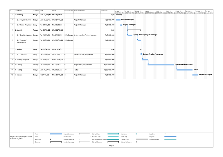 ID Task Name 1 1 Planning Duration Start Finish 4 days Mon 15/03/21 Thu 18/03/21 3 days Mon 15/03/21 Wed 17/03/21 2 1.1 Project Charter 3 1.2 Rapat Pimpinan 1 day Predecessors Resource Names Rp0 Thu 18/03/21 Thu 18/03/21 7 days Tue 23/03/21 Wed 31/03/21 5 2.1 Studi Kelayakan 3 days Tue 23/03/21 Thu 25/03/21 6 2.2 Proposal Persetujuan 2 days Tue 30/03/21 Wed 31/03/21 5FS+2 days 1 day Thu 01/04/21 Thu 01/04/21 4 7 2 Analisis 3 Design 2 Rp3.000.000 Project Manager Rp1.000.000 3FS+2 days System Analist;Project Manager Project Manager Project Manager System Analist;Project Manager Rp5.000.000 Rp2.000.000 Rp0 3.1 Use Case 1 day Thu 01/04/21 Thu 01/04/21 9 4 Activity Diagram 2 days Fri 02/04/21 Mon 05/04/21 8 10 5 Coding 14 days Tue 06/04/21 11 6 Testing 9 days Mon 26/04/21 Thu 06/05/21 12 7 Closure 2 days Fri 07/05/21 Project: WibyRo_ProjectJupiter Date: Fri 08/01/21 Project Manager 14 Mar '21 21 Mar '21 28 Mar '21 04 Apr '21 11 Apr '21 18 Apr '21 25 Apr '21 02 May '21 09 May '21 16 May '21 SMTWT F S S MTWT F S S MTWT F S SMTWT F S SMTWT F S SMTWT F S SM TWT F S SM TWT F S SMTWT F S SM TWT F Rp0 8 Fri 23/04/21 Fixed Cost 6 System Analist;Programer Rp1.000.000 9 Programer1;Porgramer2 Rp50.000.000 10 Tester Rp10.000.000 Mon 10/05/21 11 System Analist;Programer Rp1.000.000 Project Manager Programer1;Porgramer2 Tester Project Manager Rp2.000.000 Task Project Summary Manual Task Start-only Deadline Split Inactive Task Duration-only Finish-only Progress Milestone Inactive Milestone Manual Summary Rollup External Tasks Manual Progress Summary Inactive Summary Manual Summary External Milestone Page 1