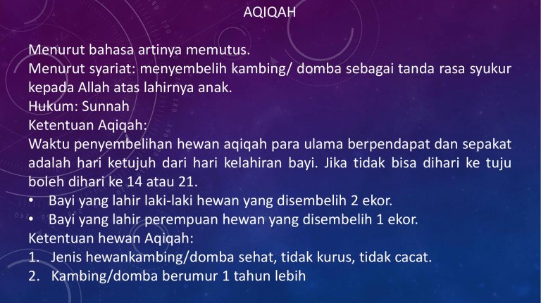 AQIQAH Menurut bahasa artinya memutus. Menurut syariat: menyembelih kambing/ domba sebagai tanda rasa syukur kepada Allah atas lahirnya anak. Hukum: Sunnah Ketentuan Aqiqah: Waktu penyembelihan hewan aqiqah para ulama berpendapat dan sepakat adalah hari ketujuh dari hari kelahiran bayi. Jika tidak bisa dihari ke tuju boleh dihari ke 14 atau 21. • Bayi yang lahir laki-laki hewan yang disembelih 2 ekor. • Bayi yang lahir perempuan hewan yang disembelih 1 ekor. Ketentuan hewan Aqiqah: 1. Jenis hewankambing/domba sehat, tidak kurus, tidak cacat. 2. Kambing/domba berumur 1 tahun lebih