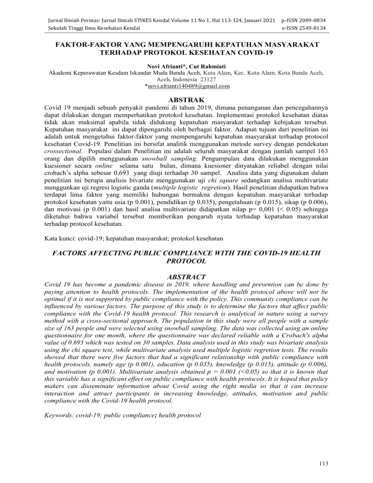 Jurnal - 124,Januari Januari 2021 2021 p-ISSN 2089-0834 JurnalIlmiah IlmiahPermas: Permas:Jurnal JurnalIlmiah IlmiahSTIKES STIKESKendal KendalVolume Volume11 11No No1,1,Hal Hal113 113-124, Sekolah Tinggi Ilmu Kesehatan Kendal Sekolah Tinggi Ilmu Kesehatan Kendal e-ISSN 2549-8134 FAKTOR-FAKTOR YANG MEMPENGARUHI KEPATUHAN MASYARAKAT TERHADAP PROTOKOL KESEHATAN COVID-19 Novi Afrianti*, Cut Rahmiati Akademi Keperawatan Kesdam Iskandar Muda Banda Aceh, Kuta Alam, Kec. Kuta Alam, Kota Banda Aceh, Aceh, Indonesia 23127 *[email protected] ABSTRAK Covid 19 menjadi sebuah penyakit pandemi di tahun 2019, dimana penanganan dan pencegahannya dapat dilakukan dengan memperhatikan protokol kesehatan. Implementasi protokol kesehatan diatas tidak akan maksimal apabila tidak didukung kepatuhan masyarakat terhadap kebijakan tersebut. Kepatuhan masyarakat ini dapat dipengaruhi oleh berbagai faktor. Adapun tujuan dari penelitian ini adalah untuk mengetahui faktor-faktor yang mempengaruhi kepatuhan masyarakat terhadap protocol kesehatan Covid-19. Penelitian ini bersifat analitik menggunakan metode survey dengan pendekatan crossectional. Populasi dalam Penelitian ini adalah seluruh masyarakat dengan jumlah sampel 163 orang dan dipilih menggunakan snowball sampling. Pengumpulan data dilakukan menggunakan kuesioner secara online selama satu bulan, dimana kuesioner dinyatakan reliabel dengan nilai crobach’s alpha sebesar 0,693 yang diuji terhadap 30 sampel. Analisa data yang digunakan dalam penelitian ini berupa analisis bivariate menggunakan uji chi square sedangkan analisa multivariate menggunkan uji regresi logistic ganda (multiple logistic regretion). Hasil penelitian didapatkan bahwa terdapat lima faktor yang memiliki hubungan bermakna dengan kepatuhan masyarakat terhadap protokol kesehatan yaitu usia (p 0.001), pendidikan (p 0,035), pengetahuan (p 0.015), sikap (p 0.006), dan motivasi (p 0.001) dan hasil analisa multivariate didapatkan nilap p= 0,001 (< 0.05) sehingga diketahui bahwa variabel tersebut memberikan pengaruh nyata terhadap kepatuhan masyarakat terhadap protocol kesehatan. Kata kunci: covid-19; kepatuhan masyarakat; protokol kesehatan FACTORS AFFECTING PUBLIC COMPLIANCE WITH THE COVID-19 HEALTH PROTOCOL ABSTRACT Covid 19 has become a pandemic disease in 2019, where handling and prevention can be done by paying attention to health protocols. The implementation of the health protocol above will not be optimal if it is not supported by public compliance with the policy. This community compliance can be influenced by various factors. The purpose of this study is to determine the factors that affect public compliance with the Covid-19 health protocol. This research is analytical in nature using a survey method with a cross-sectional approach. The population in this study were all people with a sample size of 163 people and were selected using snowball sampling. The data was collected using an online questionnaire for one month, where the questionnaire was declared reliable with a Crobach's alpha value of 0.693 which was tested on 30 samples. Data analysis used in this study was bivariate analysis using the chi square test, while multivariate analysis used multiple logistic regretion tests. The results showed that there were five factors that had a significant relationship with public compliance with health protocols, namely age (p 0.001), education (p 0.035), knowledge (p 0.015), attitude (p 0.006), and motivation (p 0.001). Multivariate analysis obtained p = 0.001 (<0.05) so that it is known that this variable has a significant effect on public compliance with health protocols. It is hoped that policy makers can disseminate information about Covid using the right media so that it can increase interaction and attract participants in increasing knowledge, attitudes, motivation and public compliance with the Covid-19 health protocol. Keywords: covid-19; public compliance; health protocol 113 Jurnal Ilmiah Permas: Jurnal Ilmiah STIKES Kendal Volume 11 No 1, Hal 113 - 124, Januari 2021 Sekolah Tinggi Ilmu Kesehatan Kendal PENDAHULUAN Covid 19 merupakan penyakit menular yang disebabkan oleh jenis coronavirus yang baru ditemukan pada tahun 2019 dan menjadi sebuah pandemi yang terjadi di negara di seluruh dunia (WHO, 2020). berdasarkan data yang di himpun dari WHO pada 2 Agustus 2020 secara global tercatat 17.396.943 kasus yang terkonfirmasi positif dan 675.060 kasus diantaranya dinyatakan meninggal, dimana negara yang paling tinggi berdasarkan peringkat yaitu Amerika, Brazil, India, Rusia, Afrika Selatan, dan meksiko. Indonesia juga merupakan salah satu negara yang tidak luput dari serangan penyakit ini dan menduduki peringkat 24 terbanyak kasus terpapar covid 19 secara dunia, dimana berdasarkan data dari Kementerian Kesehatan RI (2020) sampai pada 4 Agustus tercatat 109.936 kasus dengan 5.139 orang meninggal. Penanganan dan pencegahan kasus pandemic ini sudah dilakukan dengan berbagai cara, baik secara global maupun nasional atau wilayah. Adapun strategi yang selama ini sudah dijalankan untuk penanganan covid 19 yaitu melalui 4 (empat) strategi yaitu gerakan memakai masker, penelusuran kontak (tracing) dari kasus positif yang dirawat dengan menggunakan rapid test atau tes cepat, edukasi dan penyiapan isolasi secara mandiri pada sebagian hasil tracing yang menunjukan hasil tes positif dari rapid tes atau negatif dengan gejala untuk melakukan isolasi mandiri, serta Strategi isolasi Rumah Sakit yang dilakukan kala isolasi mandiri tidak mungkin dilakukan, seperti karena ada tanda klinis yang butuh layanan definitif di Rumah Sakit (Agus, 2020). Strategi yang dijalankan tersebut belum membawa dampak dalam menekan kasus yang ada sehingga dengan mengevaluasi dari sifat virus covid dimana virus ini tertular melalui udara dan memiliki masa inkubasi selama 14 hari maka pemerintah kembali mengeluarkan kebijakan melalui Kementrian Dalam Negeri RI (2020) dengan adanya isolasi diri yang mewajibkan semua masyarakat berd