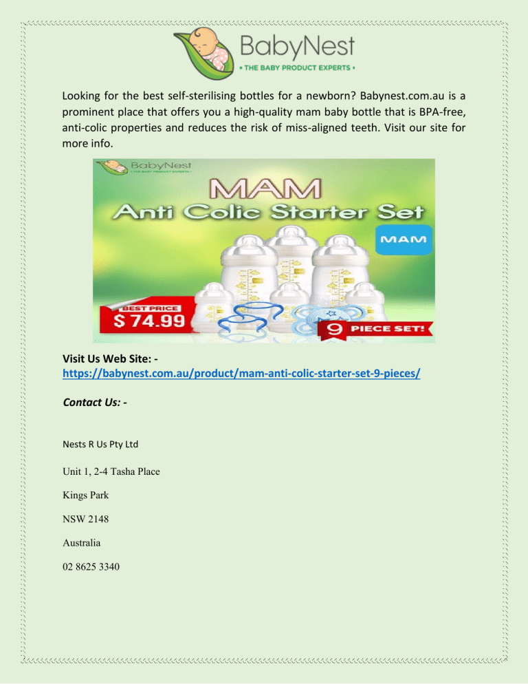 Looking for the best self-sterilising bottles for a newborn? Babynest.com.au is a prominent place that offers you a high-quality mam baby bottle that is BPA-free, anti-colic properties and reduces the risk of miss-aligned teeth. Visit our site for more info. Visit Us Web Site: https://babynest.com.au/product/mam-anti-colic-starter-set-9-pieces/ Contact Us: - Nests R Us Pty Ltd Unit 1, 2-4 Tasha Place Kings Park NSW 2148 Australia 02 8625 3340