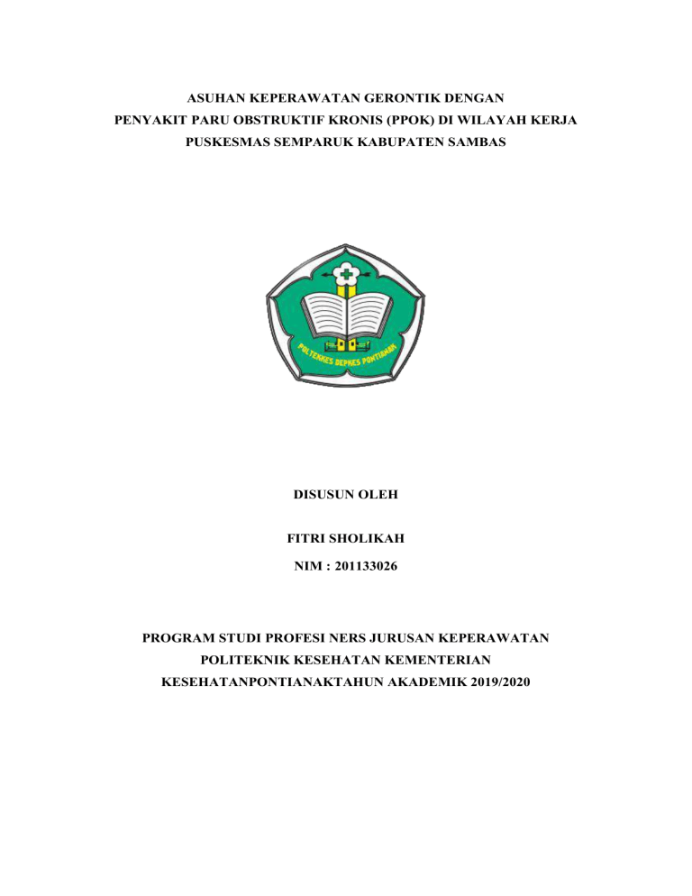 ASUHAN KEPERAWATAN GERONTIK DENGAN PENYAKIT PARU OBSTRUKTIF KRONIS (PPOK) DI WILAYAH KERJA PUSKESMAS SEMPARUK KABUPATEN SAMBAS DISUSUN OLEH FITRI SHOLIKAH NIM : 201133026 PROGRAM STUDI PROFESI NERS JURUSAN KEPERAWATAN POLITEKNIK KESEHATAN KEMENTERIAN KESEHATANPONTIANAKTAHUN AKADEMIK 2019/2020 VISI DAN MISI PROGRAM STUDI PROFESI NERS KEPERAWATAN POLTEKKES KEMENKES PONTIANAK VISI "Menjadi Institusi Pendidikan Ners yang Bermutu dan Unggul dalam Bidang Keperawatan Gawat Darurat dan Keperawatan Perioperatif di Tingkat Regional Tahun 2020" MISI 1. Meningkatkan Program Pendidikan Ners yang Unggul dalam Bidang Keperawatan Gawat Darurat dan Keperawatan Perioperatif yang Berbasis Kompetensi. 2. Meningkatkan Program Pendidikan Ners yang Unggul dalam Bidang Keperawatan Gawat Darurat dan Keperawatan Perioperatif yang BerbasisPenelitian. 3. Mengembangkan Upaya Pengabdian Masyarakat yang Unggul dalam Keperawatan Gawat Darurat dan Keperawatan Perioperatif yang Berbasis IPTEK dan Teknologi Tepat Guna. 4. Mengembangkan Program Pendidikan Ners yang Unggul dalam Bidang Keperawatan Gawat Darurat dan Keperawatan Perioperatif yang Mandiri, Transparan dan Akuntabel. 5. Mengembangkan kerjasama baik lokal maupun regional i LEMBAR PENGESAHAN ASUHAN KEPERAWATAN GERONTIK DENGAN PENYAKIT PARU OBSTRUKTIF KRONIS (PPOK) DI WILAYAH KERJA PUSKESMAS SEMPARUK KABUPATEN SAMBAS Mata Kuliah : Praktik Klinik Keperawatan Gerontik Semester : I (Ganjil) Institusi : Poltekkes Kemenkes Pontianak Prodi : Profesi Ners Sambas, Februari 2020 Mahasiswa FITRI SHOLIKAH NIM : 201133026 Mengetahui, Clincal Teacher Clincal Instructure Ns. Suharyanto, M.Kep NIP. 197103061992032000 Ns. Nurul Yaqin, S.ST., NIP. 197705222000121002 ii ASUHAN KEPERAWATAN GERONTIK Tn. T PENYAKIT PARU OBSTRUKTIF KRONIS (PPOK) DIWILAYAH KERJA PUSKESMAS KECAMATAN SEMPARUK PENGKAJIAN A. Data Umum 1. Nama lansia : Tn. T 2. Usia : 68 tahun 3. Agama : Islam 4. Suku : Melayu 5. Jeniskelamin : laki-laki 6. Riwayat Pendidikan : SD 7. Riwayat pekerjaan : Tidak Bekerja 8. Status perkawinan : Menikah B. Keluhan Utama Pasien mengatakan batuk dan sesak ± 1 tahun yang lalu sampai sekarang. C. Riwayat Kesehatan 1. Riwayat Penyakit (dalam 6 bulan terakhir) Pasien mengatakan batuk dan sesak, ceritakan sesak? Batuk kering atau berdahak? Batuk terus menerus? Penyerta lain ? Riwayat merokok? Aktif atau pasif? Terpapapr dengan lingkungan? Riwayat bronkritis kritis? 2. Riwayat Penyakit Keluarga Pasien mengatakan tidak ada satu orang pun dari keluarga yang mengalami sakit yang sama seperti yang dialaminya saat ini, hal ini diperkuat oleh keluarga pasien yang mengatakan tidak ada dari keluarga mereka yang lain yang memiliki penyakit yang sama seperti yang dialami Tn. T. 3. Riwayat PencegahanPenyakit a. Riwayat Monitoring Tekanan Darah 1 Keluarga pasien mengatakan saat dilakukan pemeriksaan kepada pasien, didapatkan tekanan darah pasien normal 130/70mmHg. RR? HR ? b. Skrining Kesehatan yang Dilakukan Keluarga pasien mengatakan bahwa pasien pernah dilakukan skrining kesehatan (posyandu lansia) kegiatan tersebut dilakukan rutin tiap bulan oleh puskesmas semparuk. 4. Status Gizi (diukur dengan grafik indeks massa tubuh) IMT = BB (kg) : TB (m2) = 50 kg : 165 cm = 50 kg : 2.72 m2 = 18.4 nutrisi IMT Pasien termasuk dalam kategori berat badan kurang yaitu 18.4 5. Masalah Kesehatan Terkait Status Gizi a. Masalah pada Mulut Pasien mengatakan giginya masih banyak, masih bias mengunyah makanan, gigi depan udah lepas satu didepan dan 3 yang dibelakang. Gigi pasien tampak menguning tidak ada stomatitis pada mulut Pasien, saat dilakukan pengkajian tercium bau mulut. b. Perubahan Berat Badan Pasien mengatakan tidak mengetahui apakah terjadi perubahan berat badan atau tidak karena jarang timbang berat badan, pasien mengatakan terakhir mengukur berat badan yaitu 50 Kg c. Masalah Nutrisi Pasien mengatakan kurang nafsu makan kalau makan sedikit 6. Masalah Kesehatan yang Dialami Saat Ini Pasien mengatakan batuk dan kadang sesak 7. Obat-obatan yang Dikonsumsi Saat Ini Pasien mengatak rutin mengkonsumsi obat salbutamol dan cetirizine 2 8. Status Fungsional (AKS) (dinilai dengan indeks KATZ) No 1 2 3 4 5 6 Aktivitas Mandi Berpakaian Kekamarkecil Berpindah Kontinensia Makan Mandiri Tergantung √ √ √ √ √ √ Hasil: Nilai D yang berarti kemandirian dalam semua hal 9. Status Mobilisasi a. Tes Keseimbangan No. Instruksi 1 Keseimbangan duduk 2 Duduk keberdiri 3 Upaya untuk bangkit (duduk ke berdiri) 4 Keseimbangan berdiri awal (5 detikpertama) 5 Keseim bangan berdiri awal (5 detik pertama) Reaksi Pasien Bersandar Tenang dan Aman 6 Berdiri kaki rapat, terapis memberikan dorongan 3 kali di dada 7 Berdiri dengan kaki rapat dan menutup mata 8 Berputar 360 derajat 3 Skor 1 0 Tidak mampu tanpa bantuan Mampu dengan bantuan tangan Mampu Tidak mampu tanpa bantuan Mampu dengan lebih dari 1 kali upaya 0 1 0 0 2 Mampu dengan 1 kali upaya 0 Goyah Stabil dengan bantuan Stabil tanpa bantuan Goyah Stabil dengan base luas / bantuan Stabil dengan base luas/ tanpabantuan Bereaksi akan jatuh Terhuyung, goyah Stabil Goyah Stabil Langkah tidak kontinyu Langkah kontinyu Goyah Stabil 0 1 0 0 1 0 0 0 2 1 0 0 0 0 0 9 Berdiri ke duduk Tidak aman (salah penempatan, duduk denganmenjatuhkandirikekursi) 0 Menggunakan tangan dengan duduk perlahan 1 Aman dan duduk perlahan 0 SKOR KESEIMBANGAN : 10 b. Tes Berjalan No 1 2 Instruksi Inisiasi berjalan dengan Instruksi Reaksipasien Memulai dengan ragu-ragu Panjang dan tinggi langkah Ayunan kaki kanan Panjang dan tinggi langkah Ayunan kaki kiri 3 4 5 6 Kesimetrisan langkah Kontinyuitas langkah Berjalan lurus pada jalur ( estimasijarakantar kaki seukurantubuh ) Trunk 4 Skor 0 Tanpa ragu 1 Tidak melewati kaki kiri yang menumpu Melewati kaki kiri yang menumpu Kaki kanan menyentuh lantai 0 Kaki kanan tidak menyentuh lantai 1 Tidak melewati kaki kanan yang menumpu Melewati kaki kanan yang menumpu Kaki kiri menyentuh lantai 0 Kaki kiri tidak menyentuh lantai Jarak langkah kanan dan kiri tidak sama Jarak l