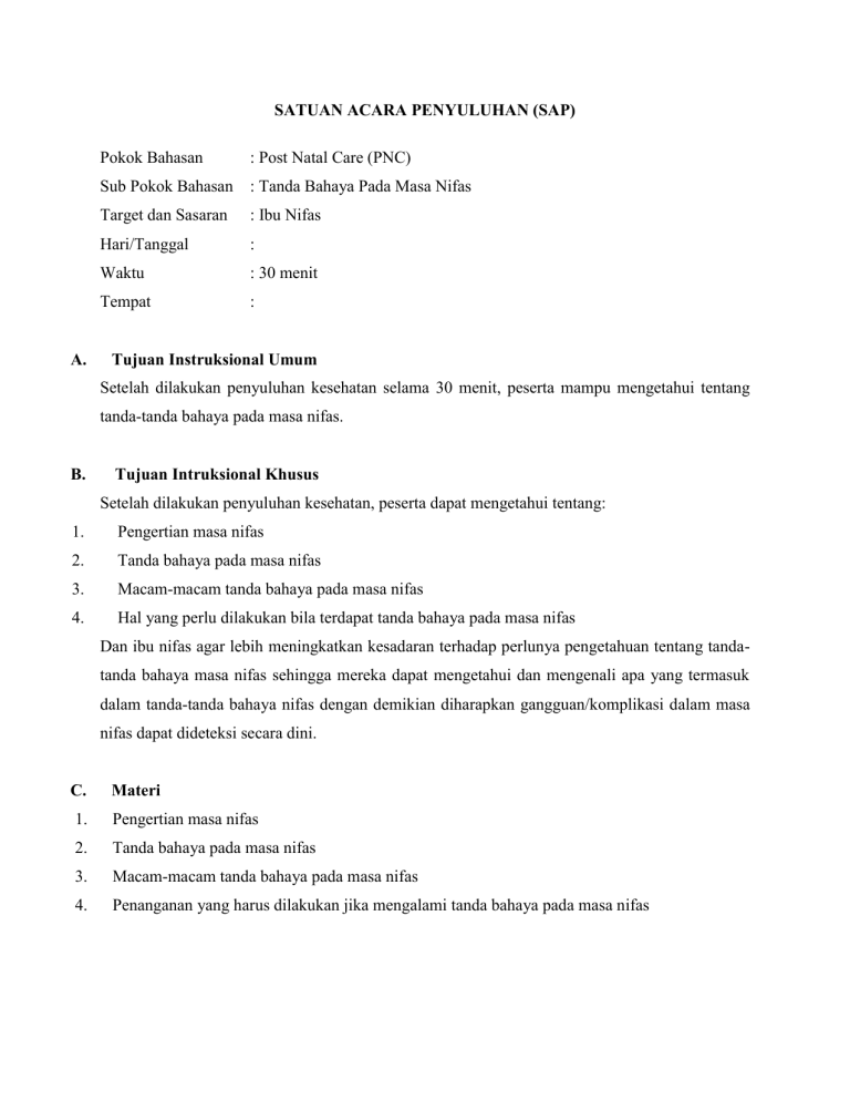 SATUAN ACARA PENYULUHAN (SAP) A. Pokok Bahasan : Post Natal Care (PNC) Sub Pokok Bahasan : Tanda Bahaya Pada Masa Nifas Target dan Sasaran : Ibu Nifas Hari/Tanggal : Waktu : 30 menit Tempat : Tujuan Instruksional Umum Setelah dilakukan penyuluhan kesehatan selama 30 menit, peserta mampu mengetahui tentang tanda-tanda bahaya pada masa nifas. B. Tujuan Intruksional Khusus Setelah dilakukan penyuluhan kesehatan, peserta dapat mengetahui tentang: 1. Pengertian masa nifas 2. Tanda bahaya pada masa nifas 3. Macam-macam tanda bahaya pada masa nifas 4. Hal yang perlu dilakukan bila terdapat tanda bahaya pada masa nifas Dan ibu nifas agar lebih meningkatkan kesadaran terhadap perlunya pengetahuan tentang tandatanda bahaya masa nifas sehingga mereka dapat mengetahui dan mengenali apa yang termasuk dalam tanda-tanda bahaya nifas dengan demikian diharapkan gangguan/komplikasi dalam masa nifas dapat dideteksi secara dini. C. Materi 1. Pengertian masa nifas 2. Tanda bahaya pada masa nifas 3. Macam-macam tanda bahaya pada masa nifas 4. Penanganan yang harus dilakukan jika mengalami tanda bahaya pada masa nifas D. Metode Ceramah dan Tanya jawab E. Media Leaflet dan Satuan Acara Penyuluhan (SAP) F. Kegiatan Penyuluhan Waktu Kegiatan Kegiatan Ibu Pembukaan 1. Salam Pembuka Menjawab salam (4 Menit) 2. Memperkenalkan diri Mendengarkan masa nifas Melihat Menjelaskan macam-macam tanda Mendengarkan bahaya pada masa nifas Memperhatikan Mengajukan 3. Menjelaskan pokok bahasan dan tujuan penyuluhan 4. Menjelaskan jalannya penyuluhan 5. Membagi leaflet 6. Menjelaskan pengertian masa nifas 7. Menjelaskan tanda bahaya pada Isi (20 Menit) 8. 9. Menjelaskan penanganan yang harus dilakukan jika mengalami tanda bahaya pada masa nifas Penutup 10. Tanya jawab (6 Menit) 11. Mengakhiri Penyuluhan 12. Salam penutup pertanyaan Menjawab Menjawab salam G. Evaluasi Prosedur : Post Test Bentuk : Lisan Jenis : Tanya Jawab Jenis Pertanyaan : 1. Apa pengertian dari masa nifas? 2. Sebutkan tanda bahaya pada masa nifas dan cara penanganannya? Hasil Ibu dapat menjawab pertanyaan yang diberikan. Materi Penyuluhan TANDA BAHAYA PADA IBU NIFAS A. Pengertian Masa Nifas Masa nifas (Puerperium) adalah dimulai setelah kelahiran plasenta dan berakhir ketika alatalat kandungan kembali seperti keadaan sebelum hamil. Masa nifas berlangsung selama kira-kira 6-8 minggu (Prawirohardjo, 2010) Puerperium berlangsung 6 minggu atau 42 hari merupakan waktu yang diperlukan untuk pulihnya alat kandungan pada keadaan yang normal, dijumpai dua kejadian penting pada puerperium, yaitu involusi uterus dan proses laktasi (Manuaba, 2007). Masa nifas dimulai beberapa jam setelah plasenta lahir dan mencakup 6 minggu berikutnya. (APN, 2008) Jadi masa nifas adalah periode yang dimulai setelah kelahiran plasenta dan berakhir ketika alat-alat kandungan pulih seperti keadaan sebelum hamil yang lamanya 6 minggu atau 42 hari. B. Tanda-tanda Bahaya Masa Nifas Adalah suatu tanda yang abnormal yang mengindikasikan adanya bahaya/komplikasi yang dapat terjadi selama masa nifas, apabila tidak dilaporkan atau tidak terdeteksi bisa menyebabkan kematian ibu (Pusdiknakes, 2011). Tanda-tanda bahaya masa nifas, sebagai berikut: 1. Pendarahan Post Partum a. Tanda dan gejala Pendarahan post partum adalah pendarahan lebih dari 500-600 ml dalam masa 24 jam setelah anak lahir (Prawirohardjo, 2010). Menurut waktu terjadinya dibagi atas 2 bagian: 1) Pendarahan Post Partum Primer (Early Post Partum Hemorragie) yang terjadi dalam 24 jam setelah anak lahir. Penyebab utama adalah atonia uteri, retensio plasenta, sisa plasenta dan robekan jalan lahir. Terbanyak dalam 2 jam pertama. 2) Pendarahan Post Partum Sekunder (Late Post Partum Hemorragie) yang terjadi setelah 24 jam, biasanya terjadi antara hari ke 5-15 post partum. Penyebab utama adalah robekan jalan lahir dan sisa plasenta (Prawirohardjo, 2010) Menurut Manuaba (2008), pendarahan post partum merupakan penyebab penting kematian maternal khususnya di Negara berkembang. Factor-faktor penyebab pendarahan post partum adalah: a. Grandemultipara b. Jarak persalinan pendek kurang dari 2 tahun c. Persalinan yang dilakukan dengan tindakan b. Penanganan Perdarahan yang perlahan dan berlanjut atau perdarahan tiba-tiba merupakan suatu kegawatdaruratan, segeralah bawa ibu ke fasilitas kesehatan. 2. Lochea yang Berbau Busuk (Bau dari Vagina) Lochea adalah cairan yang dikeluarkan uterus melalui vagina dalam masa nifas sifat lochea alkalis, jumlah lebih banyak dari pengeluaran lender waktu menstruasi dan berbau anyir (Cairan ini berasal dari bekas melekatnya plasenta). Lochea dibagi dalam beberapa jenis (Rustam Muchtar, 2008): a. Lochea rubra (cruenta): Berisi darah segar dan sisa-sisa selaput ketuban, sel-sel desidua, verniks kaseosa, lanugo, dan mekonium, selama dua hari pasca persalinan. b. Lochea Sanguinolenta: Berwarna merah kuning berisi darah dan lendir hari ke 3-7 pasca persalinan. c. Lochea Serosa: Berwarna kuning, cairan tidak berdarah lagi, pada hari ke 7-14 pasca persalinan. d. Lochea Alba: Cairan putih, setelah 2 minggu. e. Lochea Purulenta: Terjadi infeksi, cairan seperti nanah berbau busuk. f. Lochiostasis: Lochea tidak lancar keluarnya. a. Tanda dan gejala 1) Keluarnya cairan dari vagina 2) Adanya bau yang menyengat dari vagina 3) Disertai dengan demam > 38oC b. Penanganan Jagalah selalu kebersihan vagina anda, jika terjadi hal – hal yang tidak diinginkan segeralah periksakan diri anda ke fasilitas kesehatan. 3. Sub-Involusi Uterus (Pengecilan Rahim yang Terganggu) Involusi adalah keadaan uterus yang mengecil oleh kontraksi rahim dimana berat rahim dari 1000 gr saat setelah bersalin, menjadi 40-60 mg 6 minggu kemudian. Bila pengecilan ini kurang baik atau terganggu disebut sub-involusi (Rustam Muchtar, 2008). Factor penyebab sub-involusi, antara lain: sisa plasenta dalam uterus, endometritis, adanya mioma uteri (Prawirohardjo, 2010). a. Tanda dan gejala - Uterus lebih besar dan lebih lembek dari seharusnya - Fundus masih tinggi - Lochea 