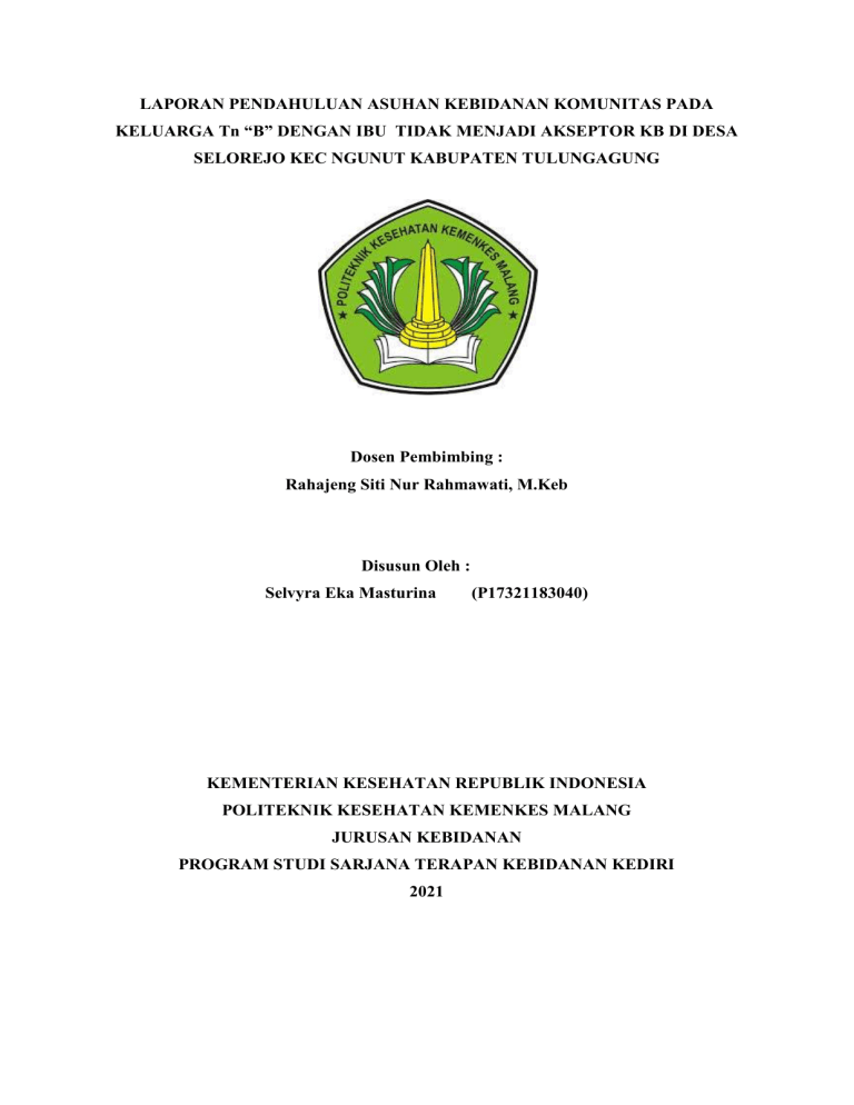 LAPORAN PENDAHULUAN ASUHAN KEBIDANAN KOMUNITAS PADA KELUARGA Tn “B” DENGAN IBU TIDAK MENJADI AKSEPTOR KB DI DESA SELOREJO KEC NGUNUT KABUPATEN TULUNGAGUNG Dosen Pembimbing : Rahajeng Siti Nur Rahmawati, M.Keb Disusun Oleh : Selvyra Eka Masturina (P17321183040) KEMENTERIAN KESEHATAN REPUBLIK INDONESIA POLITEKNIK KESEHATAN KEMENKES MALANG JURUSAN KEBIDANAN PROGRAM STUDI SARJANA TERAPAN KEBIDANAN KEDIRI 2021 BAB I PENDAHULUAN 1.1 Latar Belakang Bidan adalah seorang wanita yang telah mengikuti program pendidikan bidan dan lulus ujian sesuai dengan persyaratan yang berlaku (Kepmenkes no.900/Menkes/SK/VII/2002). Dengan memperhatikan aspek sosial budaya dan kondisi masyarakat Indonesia, maka Ikatan Bidan Indonesia (IBI) menetapkan bahwa bidan Indonesia adalah: seorang perempuan yang lulus dari pendidikan Bidan yang diakui pemerintah dan organisasi profesi di wilayah Negara Republik Indonesia serta memiliki kompetensi dan kualifikasi untuk diregister, sertifikasi dan atau secara sah mendapat lisensi untuk menjalankan praktik kebidanan. Bidan di Komunitas adalah bidan yang bekerja melayani keluarga dan masyarakat di wilayah tertentu. Bidan yg bekerja di komunitas harus mengenal kondisi kesehatan di masyarakat yangg selalu mengalami perubahan, sehingga bidan harus tanggap terhadap perubahan tersebut. Para ahli mendefinisikan komunitas atau masyarakat dari sudut pandang yang berbeda. WHO mendefinisikan komunitas sebagai kelompok social yang ditentukan oleh batas-batas wilayah, nilai-nilai keyakinan dan minat yang sama, serta adanya saling mengenal dan berinteraksi Antara anggota masyarakat yang satu dengan yang lainnya. Kebidanan komunitas merupakan konsep dasar bidan dalam melayani keluarga dan masyarakat di wilayah tertentu. Kebidanan komunitas adalah bidan yang melayani keluarga dan masyarakat di luar rumah sakit. Di dalam konsep tersebut tercakup berbagai unsur. Unsur-unsur tersebut adalah bidan sebagai pelaksana pelayanan, pelayanan kebidanan, dan komunitas sebagai sarana pelayanan, ilmu dan teknologi kebidanan, serta factor yang mempengaruhi seperti lingkungan, masing-masing usnur memiliki karekteristik. Pendekatan baru mengenai kualitas pelayanan menuntut pergeseran titik tekan pelayanan kesehatan terutama kebidanan dari yang berorientasi target peencapaian menjadi berorientasi penjagaan mutu pelayanan. Pendekatan semacam ini mengharuskan pihak pengelola program untuk mengoordinasi semua kegiatan yang berbasis klinik seperti rumah sakit, puskesmas, klinik, swasta atau yang 2 berbasis pada masyarakat seperti posyanddu, polindes, bidan di desa, petugas penyalur kontrasepsi (CBD), dan lainnya. 1.2 Tujuan 1.2.1. Tujuan Umum Membantu masyarakat dalam mengupayakan hidup sehat sehingga mencapai derajat kesehatan yang optimal. 1.2.2 Tujuan Khusus a. Mengidentifikasi masalah kesehatan yang berhubungan dengan kesehatan ibu dan anak pada keluarga b. Menemukan masalah yang ada dan memprioritaskannya c. Merumuskan berbagai alternative pemecah masalah d. Mendorong dan meningkatkan kesadaran serta partisipasi keluarga dalam upaya mendorong dirinya sendiri dalam bidang kesehatan, serta menanamkan perilaku hidup sehat 1.3 Metode Pengumpulan Data Dalam penyusunan laporan ini menggunakan metode wawancara dan pendataan 1.4 Sistematika Penulisan Halaman Judul BAB I PENDAHULUAN 1.1 Latar Belakang 1.2 Tujuan 1.3 Metode pengumpulan Data 1.4 Sistematika Penulis BAB II TINJAUAN TEORI 2.1 Konsep Teori Kurang Gizi 2.2 Konsep Teori KB 2.3 Konsep Teori Hipertensi BAB III TINJAUAN KASUS BAB IV PEMBAHASAN Berisi analisis tentang kesenjangan antara teori dan praktik BAB V PENUTUP 5.1 Kesimpulan 5.2 Saran DAFTAR PUSTAKA BAB II TINJAUAN TEORI 2.1 Konsep Teori Kurang gizi A. Definisi Gizi Gizi adalah suatu proses organisme menggunakan makanan yang dikonsumsi secara normal melalui proses digesti, absobsi, transportasi, penyimpanan, metabolisme dan pengeluaran zat-zat yang tidak digunakan untuk mempertahankan kehidupan, pertumbuhandan fungsi normal dari organ-organ, serta menghasilkan energi. Tidak ada satu jenis makanan yang mengandung semua zat gizi, yang mampu membuat seseorang untuk hidup sehat, tumbuh kembang dan produktif. Oleh karena itu,setiap orang perlu mengkonsumsi anekaragam makanan; kecuali bayi umur 0-4 bulan yang cukup mengkonsumsi Air Susu Ibu (ASI) saja. Bagi bayi 0-4 bulan, ASI adalah satu-satunya makanan tunggal yang penting dalam proses tumbuh kembang dirinya secara wajar dan sehat. Makan makanan yang beranekaragam sangat bermanfaat bagi kesehatan. Makanan yang beraneka ragam yaitu makanan yang mengandung unsur-unsur zat gizi yang diperlukan tubuh baik kualitas maupun kuantintasnya, dalam pelajaran ilmu gizi biasadisebut triguna makanan yaitu, makanan yang mengandung zat tenaga, pembangun dan zat pengatur. Apabila terjadi kekurangan atas kelengkapan salah satu zat gizi tertentu pada satu jenis makanan, akan dilengkapi oleh zat gizi serupa dari makanan yang lain. Jadi makan makanan yang beraneka ragam akan menjamin terpenuhinya kecukupan sumber zat tenaga,zat pembangun dan zat pengatur. Makanan sumber zat tenaga antara lain: beras, jagung, gandum, ubi kayu, ubi jalar,kentang, sagu, roti dan mi. Minyak, margarin dan santan yang mengandung lemak jugadapat menghasilkan tenaga. Makanan sumber zat tenaga menunjang aktivitas sehari-hari.Makanan sumber zat pembangun yang berasal dari bahan makanan nabati adalahkacang-kacangan, tempe, tahu. Sedangkan yang berasal dari hewan adalah telur, ikan, ayam,daging, susu serta hasil olahan, seperti keju. Zat pembangun berperan sangat penting untuk pertumbuhan dan perkembangan kecerdasan seseorang.Makanan sumber zat pengatur adalah semua sayur-sayuran dan buah-buahan.Makanan ini mengandung berbagai vitamin dan mineral, yang berperan untuk melancarkan bekerjanya fungsi organ-organ tubuh. B. Definisi Kurang Gizi Malnutrisi adalah keadaan patologis akibatkekurangan atau kelebihan secara relatif maupun absolut saat lebih zat gizi. Gizi kurang pada keadaan awalnya tidakditentukan