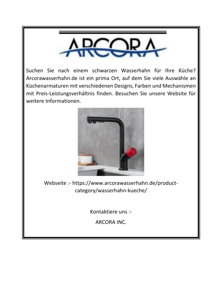 Suchen Sie nach einem schwarzen Wasserhahn für Ihre Küche? Arcorawasserhahn.de ist ein prima Ort, auf dem Sie viele Auswähle an Küchenarmaturen mit verschiedenen Designs, Farben und Mechanismen mit Preis-Leistungsverhältnis finden. Besuchen Sie unsere Website für weitere Informationen. Webseite :- https://www.arcorawasserhahn.de/productcategory/wasserhahn-kueche/ Kontaktiere uns :ARCORA INC.