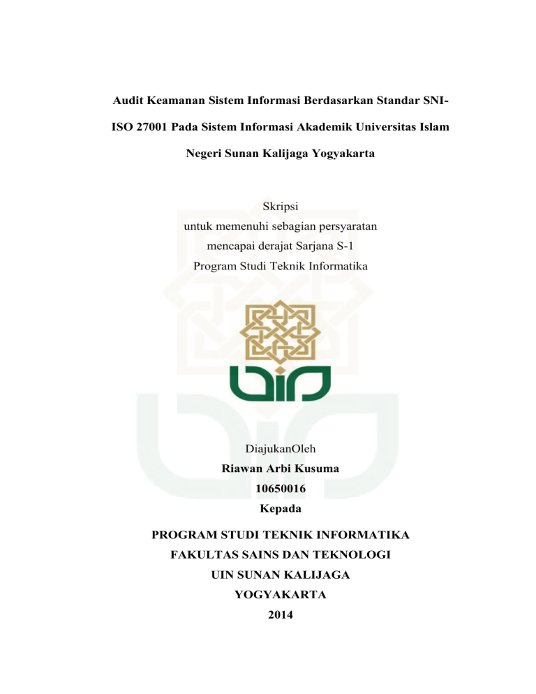 Audit Keamanan Sistem Informasi Berdasarkan Standar SNIISO 27001 Pada Sistem Informasi Akademik Universitas Islam Negeri Sunan Kalijaga Yogyakarta Skripsi untuk memenuhi sebagian persyaratan mencapai derajat Sarjana S-1 Program Studi Teknik Informatika DiajukanOleh Riawan Arbi Kusuma 10650016 Kepada PROGRAM STUDI TEKNIK INFORMATIKA FAKULTAS SAINS DAN TEKNOLOGI UIN SUNAN KALIJAGA YOGYAKARTA 2014 Audit Keamanan Sistem Informasi Berdasarkan Standar SNIISO 27001 Pada Sistem Informasi Akademik Universitas Islam Negeri Sunan Kalijaga Yogyakarta Skripsi untuk memenuhi sebagian persyaratan mencapai derajat Sarjana S-1 Program Studi Teknik Informatika DiajukanOleh RiawanArbiKusuma 10650016 PROGRAM STUDI TEKNIK INFORMATIKA FAKULTAS SAINS DAN TEKNOLOGI UIN SUNAN KALIJAGA YOGYAKARTA 2014 I III PERNYATAAN KEASLIAN SKRIPSI Yang bertanda tangan dibawah ini : Nama : Riawan Arbi Kusuma NIM : 10650016 Program Studi : Teknik Informatika Fakultas : SainsdanTeknologi Menyatakan bahwa skripsi dengan judul “AUDIT KEAMANAN SISTEM INFORMASI BERDASARKAN STANDAR STANDAR SNI ISO 27001 PADA SISTEM INFORMASI AKADEMIK UNIVERSITAS ISLAM NEGERI UIN SUNAN KALIJAGA YOGYAKARTA” tidak terdapat karya yang pernah diajukan untuk memper oleh gelar kesarjanaan di suatu Perguruan Tinggi, dan sepanjang pengetahuan saya juga tidak terdapat karya atau pendapat yang pernah ditulis atau diterbitkan oleh orang lain, kecuali yang secara tertulis diacu dalam naskah ini dan disebutkan dalam daftar pustaka. Yogyakarta, 16 Januari 2014 Yang Menyatakan Riawan Arbi Kusuma NIM :10650016 III KATA PENGANTAR Alhamdulillah, segala pujibagi Allah Subhanahuwata‟ala atas limpahan rahmat, hidayah, serta bimbingan-Nya. Shalawat serta salam semoga tercurah kepada Nabi Muhammad Shallallohu „alaihiwasallam. Akhirnya penulis dapat menyelesaikan penelitian Tugas Akhir yang berjudul Audit Keamanan Sistem Informasi Berdasarkan Standar SNI ISO 27001 Pada Sistem Informasi Akademik Universitas Islam Negeri Sunan Kalijaga Yogyakarta.Oleh Karena itu, dengan segala kerendahan hati pada kesempatan ini penulis mengucapkan banyak terimakasih kepada: 1. Prof. Drs. H. Akh. Minhaji, M.A., Ph.D selaku Dekan Fakultas Sains dan Teknologi Universitas Islam Negeri Sunan Kalijaga. 2. Bapak Agus Mulyanto, S.Si, M.Kom. selaku Ketua Program Studi Teknik Informatika Fakultas Sains dan Teknologi Universitas Islam Negeri Sunan Kalijaga. 3. Bapak M. Mustakim, ST., M.T., selaku pembimbing yang selalu sabar membimbing, mengarahkan, memberikan nasehat dan saran selama penyusunan skripsi. 4. Agung Fatwanto, S.Si.,M.Kom, Ph.D, selakuKepalaUPT PTIPD UIN Sunan Kalijaga yang telah memberikan izin penelitian. 5. Seluruh staf TI PKSI UIN Sunan Kalijaga yang telah bersedia meluangkan waktunya menjadi responden untuk pengambilan data penelitian. IV 6. Ibunda HJ. Suwarti Sumono dan Ayahanda Sumono, S.H. (alm) yang selalu setia memberikan dukungan pada penulis serta doa yang menjadi sumber motivasi dan inspirasi. 7. MbakOsy, MbakRia, MbakNeni yang selalu memberikan dukungan dan inspirasi. 8. Hanan, Rasyid, Ami, Pak Aulia dan seluruh teman-teman keluarga besar Program Studi Teknik Informatika, khususnya angkatan 2010 yang telah banyak sekali memberikan masukan, saran dan diskusi yang begitu berharga yang telah banyak membantu proses penelitian penulis. 9. Serta semua rekan-rekan penulis di berbagai kegiatan maupun organisasi yang juga telah memberikan banyak sekali masukan dan kontribusi yang sangat berarti bagi penulis Penulis merasa masih banyak sekali kekurangan dan kelemahan dalam penelitian ini, oleh karena itu segala kritik dan saran senantiasa penulis harapkan dari para pembaca. Akhir kata,semoga penelitian ini dapat menjadi panduan serta referensi yang sangat berguna bagi pembaca dan dapat dimanfaatkan sebaik-baiknya. Yogyakarta, 18 Januari 2014 Penulis IV HALAMAN PERSEMBAHAN Laahawlawalaaquwwataillabillah, tidak ada daya dan kekuatan kecuali Allah yang Maha Tinggi dan Maha Agung. Puji syukur kehadirat Allah yang Maha Pengasih dan Penyayang.Sholawat semoga tercurah pada junjungan Nabi Muhammad SAW.Alhamdulillah dengan kasih sayang dan petunjuk-Nya, saya dapat menyelesaikan penelitian ini.Terselesaikannya penelitian ini, tidak lepas dari doa dan dukungan banyak pihak. Maka, melalui kesempatan ini, saya mengucapkan terimakasih setulus hati kepada: 1. IbundakuHJ. Suwarti Sumono terimakasih untuk semua kasihsayang dan pengorbananmu. Tidak ada kata yang bisa mewakili betapa besar rasa terimakasihku. Semoga Allah senantiasa melimpahkan kasih sayang, rahmat dan barokah serta kemuliaan hidup dunia dan akhirat. Love you mom, you always be my hero. 2. Mbak Osy, Mbak Ria, Mbak Neni dan semua keponakan, keluarga besar Amad Djoyosetiko terimakasih untuk semua bantuan dan dukungan, Thankyou for all . 3. Keluarga Bambang Istiadi, May be I though him as a second parents for me. Thankyou for giving me boarding house, home stay actually for 3 years i stayed in beloved Yogyakarta. Always give me different point a view about the world, nice person he is. Thankyou for all. 4. Jalan Bali crew Reza, Priyo, Doni, Husna, kalian luarbiasa! Salah satu penghibur dikala hati galau. Keep on this brotherhood fellas!. V 5. Keluarga UPT PTIPD UIN Sunan Kalijaga Yogyakarta terimakasih atas semua bantuan dan kerjasama-nya. 6. Kakak-kakak TIF UIN Sunan Kalijaga terimakasih untuksemua sharing ilmu yang kita lakukan. VI HALAMAN MOTTO Man never to sit down and do nothing (Sitka, Brother Bear) Merumuskan Visi dan Misi adalah salah satu bentuk dalam mengambil keputusan, bahkan pengambilan keputusan yang cukup fundamental. Visi dan Misi Anda akan menjiwai segala gerak dan tindakan di masa datang. Man Jadda Wajada VII DAFTAR ISI COVER HALAMAN JUDUL ................................................................................................... i LEMBAR PENGESAHAN ......................................................................................... ii PERNYATAAN KEASLIAN SKRIPSI ........................................