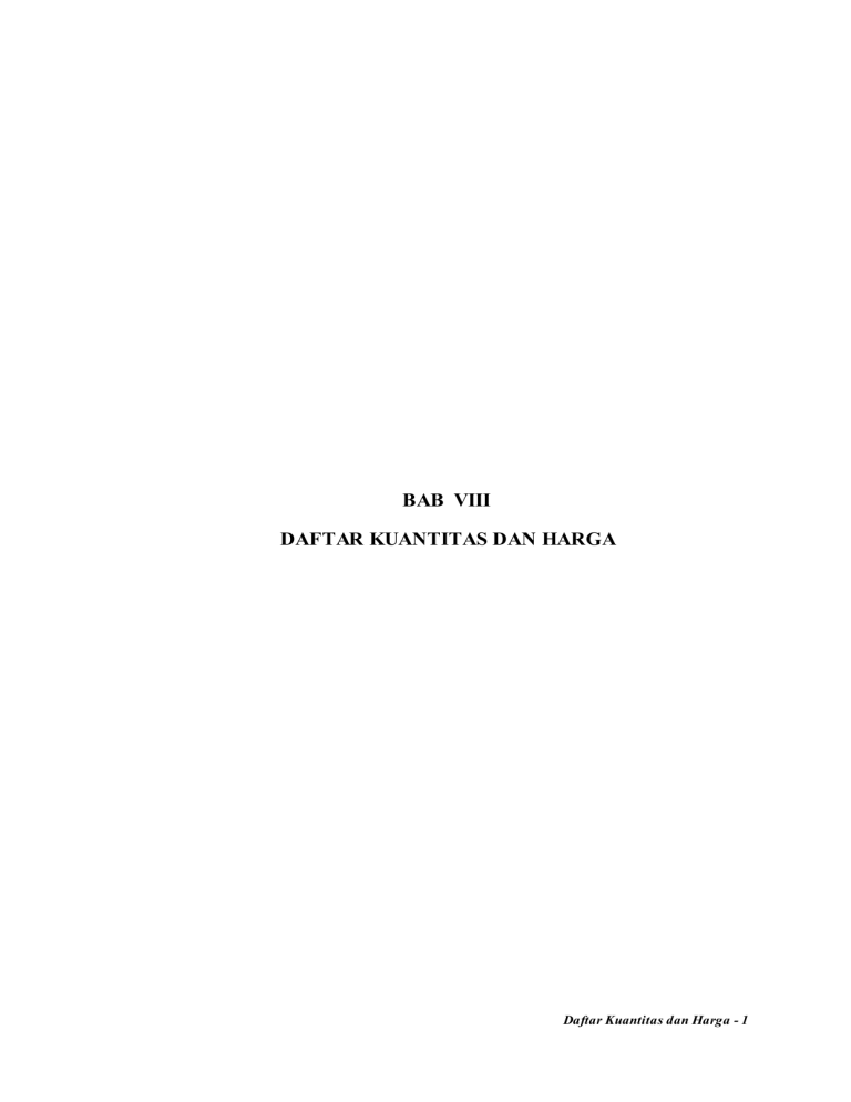 BAB VIII DAFTAR KUANTITAS DAN HARGA Daftar Kuantitas dan Harga - 1 DAFTAR RENCANA ANGGARAN BIAYA ( RAB ) KEGIATAN : Pengelolaan Jaringan Irigasi Wilayah Sungai Ciliwung-Cisadane PEKERJAAN : DAK dan PENDAMPING APBD DI. SASAK (1,088 Ha) Pembuatan Tanggul BSK. 3 = 540 m' Penggantian Pintu Penguras = 1 Bh LOKASI : Desa Cibeuteung Udik, Kec. Ciseeng, Kab. Bogor TAHUN ANGGARAN : 2010 No Uraian Pekerjaan Satuan Volume 1 2 3 4 I. PEKERJAAN PERSIAPAN 1 Papan Nama Kegiatan 2 Dokumentasi Unit 1,00 set 4,00 Harga Satuan ( Rp. ) 5 Jumlah Biaya ( Rp. ) 6 Jumlah II. A. 1 2 PEKERJAAN POKOK Pekerjaan Tanah Galian Tanah Biasa Timbunan Tanah dipadatkan m3 m3 812,17 Jumlah B. 1 2 3 Pekerjaan Pasangan Pasangan batu belah camp.1 Pc : 4 Ps Plesteran campuran 1 Pc : 3 Ps Siaran Campuran 1 Pc : 2 Ps m3 m2 m2 1.147,50 270,00 1.452,60 Jumlah C Pekerjaan Pintu 1 Pintu Sorong Type B = 1,60 m ; H = 1,70 m III. PEKERJAAN PEMBANTU 1 Pengalihan Aliran / Kisdam bh 1,00 Ls 1,00 Jumlah Terbilang : Jumlah Total PPN 10 % Jumlah Dibulatkan Daftar Kuantitas dan Harga - 2 DAFTAR HARGA SATUAN UPAH DAN BAHAN NO URAIAN SATUAN HARGA A. UPAH B BAHAN Daftar Kuantitas dan Harga - 3 DAFTAR HARGA SATUAN PEKERJAAN KEGIATAN : PEKERJAAN : LOKASI : TAHUN ANGGARAN : No Uraian Pekerjaan Satuan 1 2 3 Kode Analisa 4 Harga Satuan ( Rp. ) 5 Ketrangan 6 I. PEKERJAAN PERSIAPAN II. PEKERJAAN POKOK A. Pekerjaan Tanah B. Pekerjaan Pasangan C. Pekerjaan Pintu Daftar Kuantitas dan Harga - 4 ANALISA HARGA SATUAN 1 Unit Papan Nama Kegiatan Kode Analisa : P.1 No Uraian Satuan Kuantitas 1 2 3 4 A. BAHAN - Kayu Balok Borneo Super - Paku 4 - 7 cm - Cat Kayu - Multiplek (9 mm) M3 Kg Kg lbr Harga Satuan ( Rp. ) 5 Jumlah Harga ( Rp. ) 6=4x5 0.0270 0.2500 1.0000 0.5000 Jumlah A B. TENAGA KERJA - Ongkos Penulisan - Ongkos Pasang Org/Hr Org/Hr 1.0000 1.0000 Jumlah B C. PERALATAN - Jumlah C JUMLAH ( A + B + C ) KEUNTUNGAN MAX. 10 % JUMLAH DIBULATKAN Keterangan : Papan Nama Kegiatan dibuat : a). tiang 3 batang kayu kelas II (5/7) @ panjang 2,5 m b). Multiplek ( 9 mm ) luas 120 x 120 Cm c). Warna dasar biru dengan huruf putih, redaksi/format sesuai standart di pasang pada lokasi strategis yang terlihat oleh umum pada area lokasi kegiatan Daftar Kuantitas dan Harga - 5 ANALISA HARGA SATUAN 1 m3 Galian Tanah Biasa Maksimum Kedalaman 1 m Kode Analisa : A.1 No Uraian Satuan Kuantitas 1 2 3 4 A. Harga Satuan Jumlah Harga ( Rp. ) 5 ( Rp. ) 6=4x5 BAHAN Jumlah A B. TENAGA KERJA - Pekerja Org/Hari 0.7500 - Mandor Org/Hari 0.0250 Jumlah B C. PERALATAN - Jumlah C JUMLAH ( A + B + C) KEUNTUNGAN MAX. 10 % JUMLAH DIBULATKAN Keterangan Galian tanah dalamnya tidak lebih 1m, tanahnya disebarkan disekitar atau dibuang tidak lebih jauh dari 3 m' Daftar Kuantitas dan Harga - 6 ANALISA HARGA SATUAN 1 m3 Pasangan batu belah campuran 1 Pc : 4 Ps. Kode Analisa B.2 No Uraian Satuan Kuantitas 1 2 3 4 A. BAHAN - Semen Pc (50 Kg) - Batu Belah - Pasir Pasang Zak M3 M3 Harga Satuan ( Rp. ) 5 3.2570 1.2000 0.5220 Jumlah A B. TENAGA KERJA - Pekerja - Tukang Batu - Kepala Tukang Batu - Mandor Org/Hari Org/Hari Org/Hari Org/Hari Jumlah Harga ( Rp. ) 6=4x5 0.00 3.6000 1.2000 0.1200 0.1800 Jumlah B C. PERALATAN - Jumlah C JUMLAH ( A + B + C ) KEUNTUNGAN MAX. 10 % JUMLAH DIBULATKAN Keterangan Daftar Kuantitas dan Harga - 7 ANALISA HARGA SATUAN 1 m2 Plesteran Campuran 1 Pc : 3 Ps (tebal 15 mm) Kode Analisa B.3 No Uraian Satuan Kuantitas 1 2 3 4 A. BAHAN - Semen Pc ( 50 ) Kg - Pasir Pasang zak M3 Harga Satuan ( Rp. ) 5 Jumlah Harga ( Rp. ) 6=4x5 0.1630 0.0194 Jumlah A B. TENAGA KERJA - Pekerja - Tukang Batu - Kepala Tukang Batu - Mandor Org/Hari Org/Hari Org/Hari Org/Hari 0.4000 0.2000 0.0200 0.0200 Jumlah B C. PERALATAN - Jumlah C JUMLAH ( A + B + C ) KEUNTUNGAN MAX. 10 % JUMLAH DIBULATKAN Keterangan Termasuk permukaan plester dihaluskan Daftar Kuantitas dan Harga - 8 ANALISA HARGA SATUAN 1 m2 Siaran Campuran 1 Pc : 2 Ps Kode Analisa B.4 No Uraian Satuan Kuantitas 1 2 3 4 A. BAHAN - Semen Pc ( 50 ) Kg - Pasir Pasang zak M3 Harga Satuan ( Rp. ) 5 Jumlah Harga ( Rp. ) 6=4x5 0.1054 0.0085 Jumlah A B. TENAGA KERJA - Pekerja - Tukang Batu - Kepala Tukang Batu - Mandor Org/Hari Org/Hari Org/Hari Org/Hari 0.3600 0.1200 0.0120 0.0180 Jumlah B C. PERALATAN - Jumlah C JUMLAH ( A + B + C ) KEUNTUNGAN MAX. 10 % JUMLAH DIBULATKAN Keterangan Daftar Kuantitas dan Harga - 9 ANALISA HARGA SATUAN 1 m3 Bongkaran Pasangan (tebal lebih dari 50 mm). Kode Analisa B.5 No Uraian Satuan Kuantitas Harga Satuan ( Rp. ) Jumlah Harga ( Rp. ) 1 2 3 4 5 6=4x5 A. BAHAN Jumlah A B. TENAGA KERJA - Pekerja - Mandor Org/Hari Org/Hari 4.0000 0.4000 Jumlah B C. PERALATAN - Jumlah C JUMLAH ( A + B + C ) KEUNTUNGAN MAX. 10 % JUMLAH DIBULATKAN Keterangan Daftar Kuantitas dan Harga - 10 ANALISA HARGA SATUAN 1 m3 Tanah diratakan, ditimbris dan dihaluskan Kode Analisa A.4 No Uraian Satuan Kuantitas 1 2 3 4 Harga Satuan ( Rp. ) 5 Jumlah Harga ( Rp. ) 6=4x5 A. BAHAN Jumlah A B. TENAGA KERJA - Pekerja - Mandor Org/Hari Org/Hari 0.2500 0.0100 Jumlah B C. PERALATAN Stemper Jumlah C JUMLAH ( A ) KEUNTUNGAN MAX. 10 % JUMLAH DIBULATKAN Keterangan Tanah sudah ada di lokasi atau tanah bekas galian Daftar Kuantitas dan Harga - 11 ANALISA HARGA SATUAN 1 m3 Angkutan Galian Tanah Sejauh +/- 30 m' Kode Analisa D.1 No Uraian Satuan Kuantitas Harga Satuan ( Rp. ) Jumlah Harga ( Rp. ) 1 2 3 4 5 6=4x5 A. BAHAN Jumlah A B. TENAGA KERJA - Pekerja - Mandor Org/Hari Org/Hari 0.3300 0.0100 Jumlah B C. PERALATAN - Jumlah C JUMLAH ( A + B + C ) KEUNTUNGAN MAX. 10 % JUMLAH DIBULATKAN Keterangan Daftar Kuantitas dan Harga - 12 ANALISA HARGA SATUAN 1 m3 Cetakan beton (bekisting) Kode Analisa C.1 No Uraian Satuan Kuantitas 1 2 3 4 A. BAHAN - Paku - Kayu Terentang/Albasiah Kg M3 Harga Satuan ( Rp. ) 5 Jumlah Harga ( Rp. ) 6=4x5 0.4000 0.4000 Jumlah A B. TENAGA KERJA - Pekerja - Tukang Kayu - Kepala Tukang Kayu - Mandor Org/Hari Org/Hari Org/Hari Org/Hari 0.2000 0.5000 0.0500 0.0100 Jumlah B C. PERALATAN - Pekerja (membongkar cetakan dan menyiram beton) Org/Hari 0.4000 Jumlah C JU