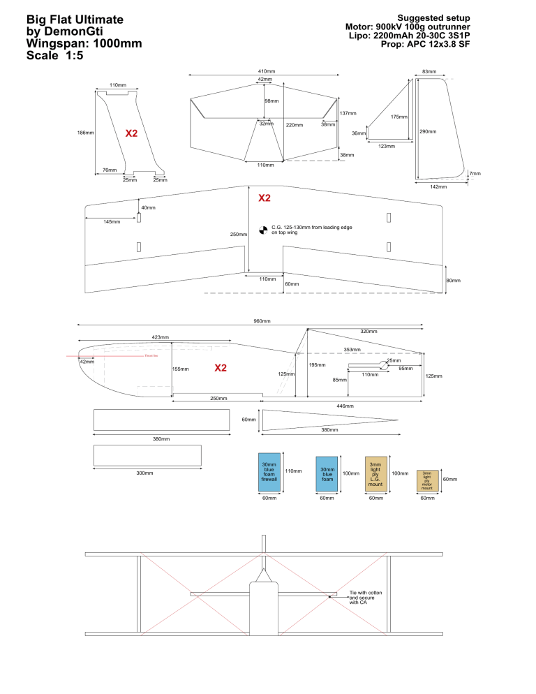 Big Flat Ultimate by DemonGti Wingspan: 1000mm Scale 1:5 Suggested setup Motor: 900kV 100g outrunner Lipo: 2200mAh 20-30C 3S1P Prop: APC 12x3.8 SF 410mm 83mm 42mm 110mm 98mm 137mm 32mm X2 186mm 220mm 175mm 38mm 290mm 36mm 123mm 38mm 110mm 76mm 7mm 25mm 25mm 142mm X2 40mm 145mm C.G. 125-130mm from leading edge on top wing 250mm 110mm 80mm 60mm 960mm 320mm 423mm 353mm Thrust line 42mm 155mm 25mm 195mm X2 95mm 125mm 110mm 85mm 125mm 250mm 446mm 60mm 380mm 380mm 300mm 30mm blue foam firewall 60mm 110mm 30mm blue foam 60mm 100mm 3mm light ply L.G. mount 60mm Tie with cotton and secure with CA 100mm 3mm light ply motor mount 60mm 60mm