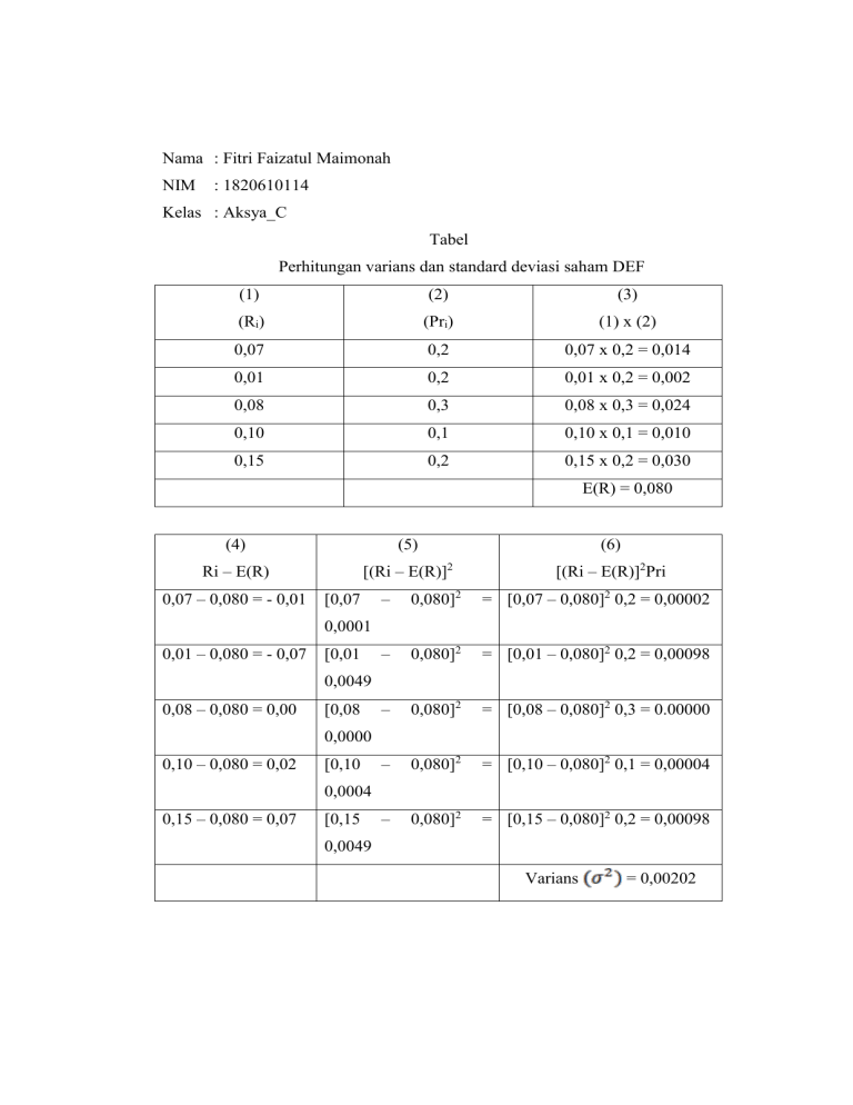 Nama : Fitri Faizatul Maimonah NIM : 1820610114 Kelas : Aksya_C Tabel Perhitungan varians dan standard deviasi saham DEF (1) (2) (3) (Ri) (Pri) (1) x (2) 0,07 0,2 0,07 x 0,2 = 0,014 0,01 0,2 0,01 x 0,2 = 0,002 0,08 0,3 0,08 x 0,3 = 0,024 0,10 0,1 0,10 x 0,1 = 0,010 0,15 0,2 0,15 x 0,2 = 0,030 E(R) = 0,080 (4) (5) (6) Ri – E(R) [(Ri – E(R)]2 [(Ri – E(R)]2Pri 0,07 – 0,080 = - 0,01 [0,07 – 0,080]2 = [0,07 – 0,080]2 0,2 = 0,00002 – 0,080]2 = [0,01 – 0,080]2 0,2 = 0,00098 – 0,080]2 = [0,08 – 0,080]2 0,3 = 0.00000 – 0,080]2 = [0,10 – 0,080]2 0,1 = 0,00004 – 0,080]2 = [0,15 – 0,080]2 0,2 = 0,00098 0,0001 0,01 – 0,080 = - 0,07 [0,01 0,0049 0,08 – 0,080 = 0,00 [0,08 0,0000 0,10 – 0,080 = 0,02 [0,10 0,0004 0,15 – 0,080 = 0,07 [0,15 0,0049 Varians = 0,00202 Standar deviasi: 0,00202 0,0449 4,49%