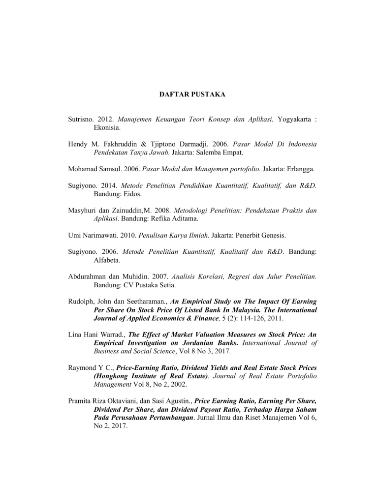 DAFTAR PUSTAKA Sutrisno. 2012. Manajemen Keuangan Teori Konsep dan Aplikasi. Yogyakarta : Ekonisia. Hendy M. Fakhruddin & Tjiptono Darmadji. 2006. Pasar Modal Di Indonesia Pendekatan Tanya Jawab. Jakarta: Salemba Empat. Mohamad Samsul. 2006. Pasar Modal dan Manajemen portofolio. Jakarta: Erlangga. Sugiyono. 2014. Metode Penelitian Pendidikan Kuantitatif, Kualitatif, dan R&D. Bandung: Eidos. Masyhuri dan Zainuddin,M. 2008. Metodologi Penelitian: Pendekatan Praktis dan Aplikasi. Bandung: Refika Aditama. Umi Narimawati. 2010. Penulisan Karya Ilmiah. Jakarta: Penerbit Genesis. Sugiyono. 2006. Metode Penelitian Kuantitatif, Kualitatif dan R&D. Bandung: Alfabeta. Abdurahman dan Muhidin. 2007. Analisis Korelasi, Regresi dan Jalur Penelitian. Bandung: CV Pustaka Setia. Rudolph, John dan Seetharaman., An Empirical Study on The Impact Of Earning Per Share On Stock Price Of Listed Bank In Malaysia. The International Journal of Applied Economics & Finance, 5 (2): 114-126, 2011. Lina Hani Warrad., The Effect of Market Valuation Measures on Stock Price: An Empirical Investigation on Jordanian Banks. International Journal of Business and Social Science, Vol 8 No 3, 2017. Raymond Y C., Price-Earning Ratio, Dividend Yields and Real Estate Stock Prices (Hongkong Institute of Real Estate). Journal of Real Estate Portofolio Management Vol 8, No 2, 2002. Pramita Riza Oktaviani, dan Sasi Agustin., Price Earning Ratio, Earning Per Share, Dividend Per Share, dan Dividend Payout Ratio, Terhadap Harga Saham Pada Perusahaan Pertambangan. Jurnal Ilmu dan Riset Manajemen Vol 6, No 2, 2017. Mohamad Rianto Talamati dan Sifrid S. Pangemanan., The Effect Of Earnings Per Share (EPS) & Return On Equity (ROE) on Stock Price Of Banking Company Listed In Indonesia Stock Exchange (IDX) 2010-2014. Jurnal EMBA Vol 3, No 2. 2015 Bambang Suryono dan Dwi Rahmawati., Pengaruh Dividend Payout Ratio, Earning Per Share dan Debt to Equity Ratio Terhadap Harga Saham. Jurnal Ilmu dan Riset Akuntansi Vol. 6, No. 6: 2460-0585, 2017 Abied Luthfi Safitri., Earning Per Share, Price Earning Ratio, Return On Asset, Debt to Equity Ratio dan Market Value Added Terhadap Harga Saham Dalam Kelompok Jakarta Islamic Index. Management analysis journal. Vol. 2, No. 2 : 2252-6552, 2013 Maria Makdalena Inge Beliani dan M. Budiantara., Pengaruh Price Earning Ratio dan Price To Book Value Terhadap Harga Saham Perusahaan Asuransi yang Terdaftar Di Bursa Efek Indonesia Tahun 2009-2012. Jurnal Riset Akuntansi Mercu Buana Vol. 1 No. 1: 2460-1233, 2015. Arum Desmawati Murni Mussalamah dan Muzakar Isa., Pengaruh Earning Per Share, Debt To Equity Ratio, dan Return On Equity Terhadap Harga Saham Pada Perusahaan Manufaktur Yang Terdaftar di Bursa Efek Indonesia (2007-2011). BENEFIT Jurnal Manajemen dan Bisnis. Vol 19, No. 2: 189-195, 2015. Mulyani L dan Pitaloka E., Pengaruh Return on Equity, Earning per Share (EPS), dan Debt to Equity Ratio terhadap Price Earning Ratio (PER) Pada PT Indofood Sukses Makmur. Tbk Periode 2012-2014. Widyakala Vol 4 No. 1: 2337-7313, 2017 Sumber Internet : Laporan Ikhtisar Keuangan www.idx.co.id Berita dan Teori https://www.scribd.com/doc/149548027/Pengertian-Objek-penelitian http://www.landasanteori.com/2015/10/pengertian-price-earning-ratio-adalah.html https://ilmumanajemenindustri.com/pengertian-per-price-earning-ratio-rasio-hargaterhadap-pendapatan-rumus-per/ http://www.pojokbisnis.com/investasi-dan-saham/pengertian-harga-saham http://www.bukopin.co.id/read/83/Sekilas_Bank_Bukopin.html https://id.wikipedia.org/wiki/Bank_Bukopin https://id.wikipedia.org/wiki/Bank_Danamon_Indonesia#Sejarah https://www.danamon.co.id/-/media/ALL-CONTENT-ABOUTDANAMON/LAPORAN-KEUANGAN/LAPORANTAHUNAN/2008/3ProfilPerusahaanTonggakSejarah.pdf