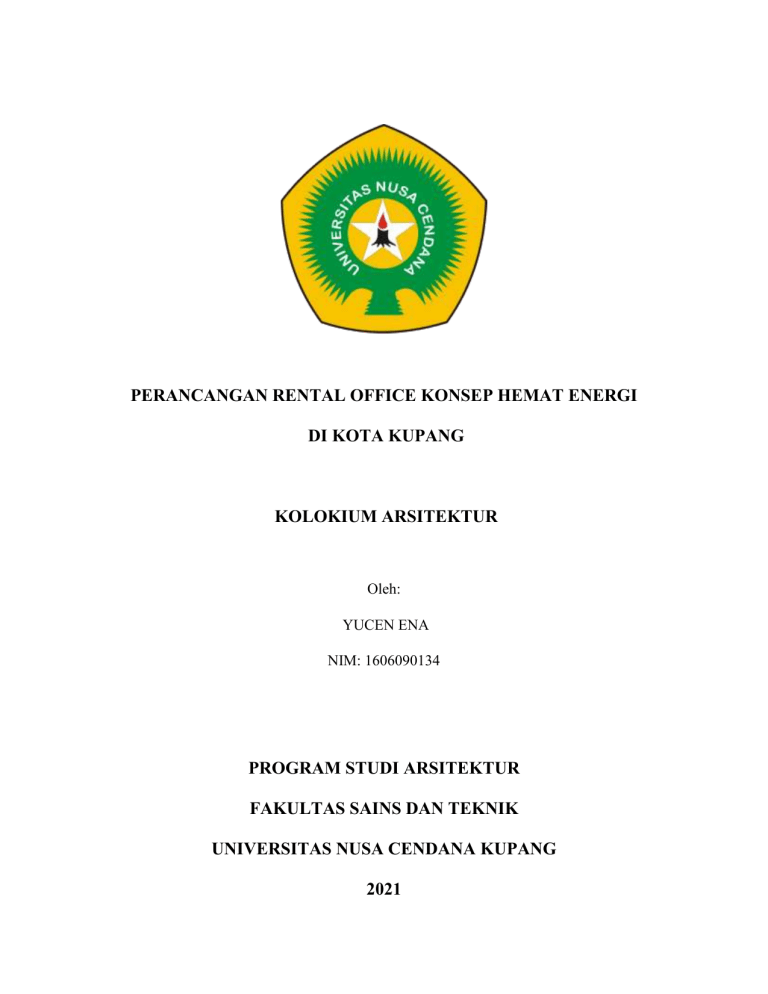 PERANCANGAN RENTAL OFFICE KONSEP HEMAT ENERGI DI KOTA KUPANG KOLOKIUM ARSITEKTUR Oleh: YUCEN ENA NIM: 1606090134 PROGRAM STUDI ARSITEKTUR FAKULTAS SAINS DAN TEKNIK UNIVERSITAS NUSA CENDANA KUPANG 2021 BAB I PENDAHULUAN 1.1. Latar Belakang Kota Kupang adalah sebuah kotamadya dan sekaligus ibu kota provinsi Nusa Tenggara Timur, Indonesia. Kotamadya ini adalah kota yang terbesar di Pulau Timor yang terletak di pesisir Teluk Kupang, bagian barat laut pulau Timor. Sebagai kota terbesar di provinsi Nusa Tenggara Timur, Kota Kupang dipenuhi oleh berbagai suku bangsa. Suku yang signifikan jumlahnya di "Kota Kupang" adalah suku Timor, Rote, Sabu, Tionghoa, Flores dan sebagian kecil pendatang dari Bugis dan Jawa. Luas wilayah Kota Kupang adalah 180,27 km² dengan jumlah penduduk sekitar 441.565 jiwa (2020). Kota ini terbagi menjadi 6 kecamatan dan 51 kelurahan. (https://id.wikipedia.org/wiki/Kota_Kupang di akses pada 2 april 2021) Bertambahnya aktivitas dan skala usaha tentunya memerlukan sarana pendukung, yaitu sarana perkantoran yang merupakan pusat pengolahan informasi, pengambilan keputusan dan kebijaksanaan bisnis. Sejalan dengan kebijakan otonomi daerah, perusahaan-perusahaan lokal mulai meningkatkan efisiensi dalam mengembangkan usaha sehingga kebutuhan akan ruang tempat bekerja juga mengalami peningkatan. Perkembangan skala usaha didukung dengan semakin membaiknya keadaan ekonomi baik dikota-kota besar maupun daerah. Menurut Hunt, W.D. (dalam Marlina, 2008) kantor sewa adalah suatu bangunan yang mewadahi transaksi bisnis dan pelayanan secara professional. Ruang-ruang dalamnya terdiri dari ruang-ruang dengan fungsi yang sama, yaitu fungsi kantor dengan status pemakai sebagai penyewa atas ruang yang digunakannya.Pertimbangan perusahaan dalam memilih kantor sewa dapat berupa banyak hal, dari kenyamanan, keamanan, fasilitas yang disediakan, serta pemilihan lokasi yang tepat, dimana pembangunan kantor sewa pada umumnya terletak pada jalur premier/jalur utama bagi zona komersil. Aspek estetika bangunan pada umumnya juga menjadi daya tarik suatu perusahaan dalam memilih kantor sewa, Di Kota kupang harga lahan setiap tahun semangkin meningkat terutama di lokasi-lokasi strategis dan setara harga lahan di kota besar lainnya. Dengan kondisi tersebut seharusnya bangunan kantor sewa bisa sebagai alternatif serta berpotensi sebagai upaya memaksimalkan kebutuhkan ruang kantor yang lebih murah terhadap keterbatasan lahan. Pada saat ini, pembangunan di kota besar menitikberatkan bangunan bertingkat tinggi. Jika melihat keadaan dari harga lahan pada area-area zona komersil di kota kupang, maka bangunan tinggi adalah solusi terbaik sebagai wadah bangunan kantor sewa. serta menciptakan sarana dan prasarana bagi penduduk di dalamnya Jika berbicara tentang bangunan tinggi, maka dapat dipastikan kebutuhan energi listrik yang digunakan akan lebih tinggi jika dibandingkan dengan bangunan biasa. Sebagai wadah kegiatan perkantoran, perusahaan-perusahan tersebut untuk menyewa suatu bagi kegiataan usahanya. Di samping hal tersebut juga di sebabkan ketidak idealnya wadah perkantoran yang ada karena: Keadaan fisik bangunan yang kurang mendukung untuk perkantoran karena merupakan suatu bagian yang bukan fungsinya. Hal ini dapat kita lihat pada beberapa rumah tinggal yang ada di kota ini yang beralih fungsi menjadi bangunan perkantoran. Lokasi kurang mendukung suasana perkantoran serta hubungnnya dengan klien/relasi maupun dengan intansi-intansi lainnya. Misalnya karena lokasi tidak terletak di daerah lingkungan perkantoran tetapi pada kawasan permukiman. Saat ini di kota kupang terdapat 1 bangunan tinggi yang berfungsi sebagai kantor sewa yakni gedung Graha Pena yang pada awalnya adalah kantor salah satu penerbit di kota kupang yang di alihkan fungsi sebagai kantor sewa karna melihat peluang bisnis, adapun beberapa ruko di kota kupang yang di alihkan fungsinya menjadi kantor sewa. Namun meningat bahwa pertumbuhan ekonomi selama beberapa tahun terakhir semakin pesat, Sehingga dalam hal ini, salah satu alternatif pemecahan dari kondisi diatas adalah dengan membangun kantor sewa dengan sistem high rise / bangunan tinggi agar efisien dan efektif. Berbeda dengan pola penggunaan lahan umumnya di wilayah NTT lainnya, lahan di kota ini didominasi oleh penggunaan untuk perumahan, perkantoran, dan sarana bisnis lainnya. Pada 2000, misalnya, sekitar 35,03% wilayah Kota Kupang sudah menjadi perumahan, lahan pekarangan, dan untuk bangunan lain (BPS Kota Kupang 2001 di akses pada 27 maret 2021) Kota Kupang sudah seharusnya mulai memikirkan efisiensi penggunaan lahan terlebih untuk bangunan perkantoran baik pemerintahan maupun swasta dengan mengembangkan unit kantor sewa. Hal ini tentu akan membantu para pelaku usaha dalam menjalankan usahanya (kebutuhan akan kantor) ditengah harga lahan yang melambung tinggi terlebih di wilayah-wilayah pusat kota. Kantor sewa yang direncanakan menggunakan pendekatan arsitektur hemat energi yang tentunya disesuaikan dengan fisik dasar Kota Kupang, terlebih keadaan iklim. Selain itu kantor sewa yang direncanakan ini akan dilengkapi dengan berbagai fasilitas penunjang seperti mini market, bank, restaurant dan bebrapa fasilitas lain yang disesuaikan dengan kebutuhan dan gaya hidup masyarakat modern. Besarnya pengunaan energi listrik yang dikonsumsi oleh gedung perkantoran digunakan pada sistem pencahayaan sebesar 10-25% dan penghawaan buatan sebesar 50-70% (soegijanto, 1998). Hal tersebut dapat menyebabkan polusi udara dan juga pemborosan energi dan biaya secara besar-besaran. untuk itu, melalui pendekatan konsep bangunan hemat energi, mampu mengurangi tingkat suhu bumi akibat pemanasan global serta dapat meminimalisir pemakaian energi listrik pada bangunan Rental Office, Dengan konsep bangunan hemat energi ini diharapkan menjadi solusi dalam mengurangi polusi udara dan efek rumah kaca serta dapat menciptakan bangunan yang berkelanjutan demi menjaga kestablian lingkungan dimasa depan. Menerapkan energi ya