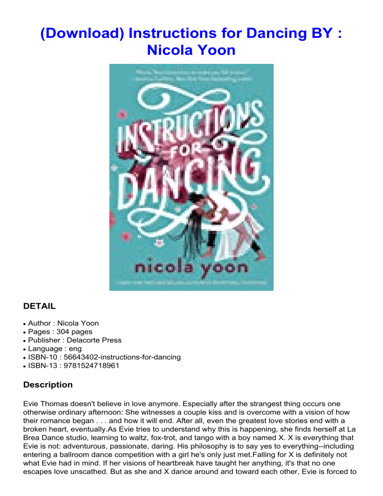 (Download) Instructions for Dancing BY : Nicola Yoon DETAIL ● ● ● ● ● ● Author : Nicola Yoon Pages : 304 pages Publisher : Delacorte Press Language : eng ISBN-10 : 56643402-instructions-for-dancing ISBN-13 : 9781524718961 Description Evie Thomas doesn't believe in love anymore. Especially after the strangest thing occurs one otherwise ordinary afternoon: She witnesses a couple kiss and is overcome with a vision of how their romance began . . . and how it will end. After all, even the greatest love stories end with a broken heart, eventually.As Evie tries to understand why this is happening, she finds herself at La Brea Dance studio, learning to waltz, fox-trot, and tango with a boy named X. X is everything that Evie is not: adventurous, passionate, daring. His philosophy is to say yes to everything--including entering a ballroom dance competition with a girl he's only just met.Falling for X is definitely not what Evie had in mind. If her visions of heartbreak have taught her anything, it's that no one escapes love unscathed. But as she and X dance around and toward each other, Evie is forced to question all she thought she knew about life and love. In the end, is love worth the risk? Suport On:[Android] [Iphone] [Windows] [Mac os] [Linux] Download here
