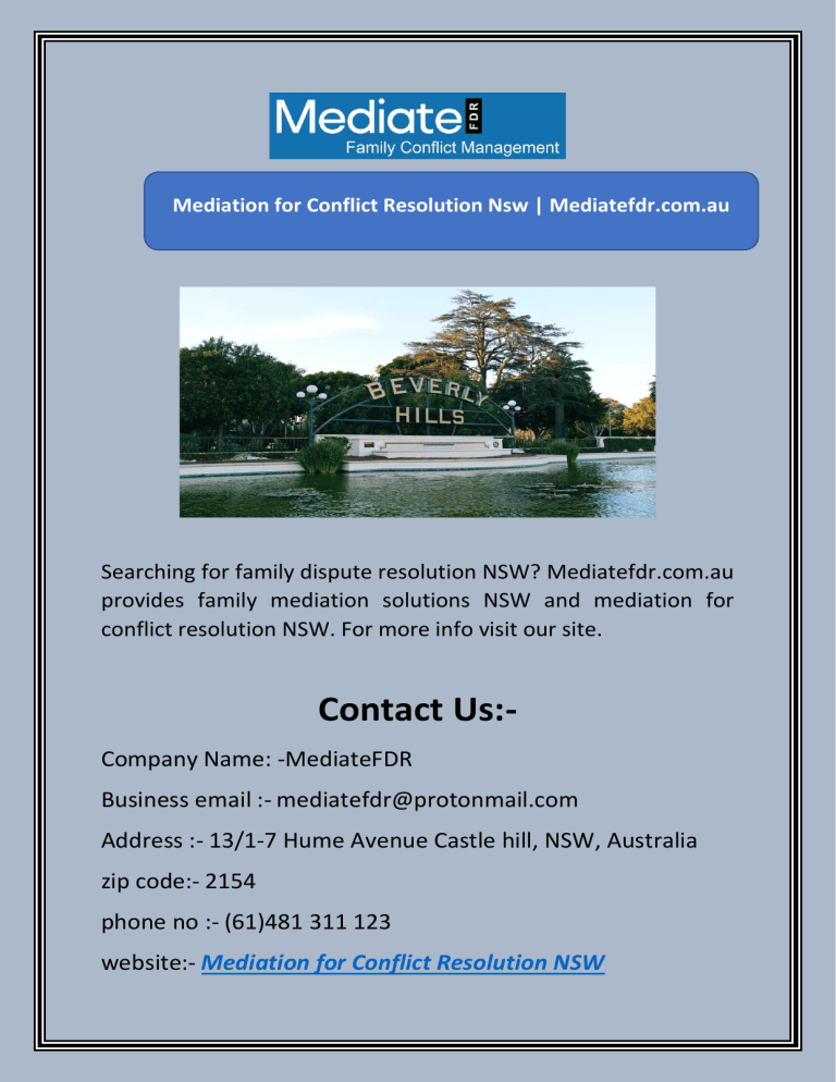 Mediation for Conflict Resolution Nsw | Mediatefdr.com.au Searching for family dispute resolution NSW? Mediatefdr.com.au provides family mediation solutions NSW and mediation for conflict resolution NSW. For more info visit our site. Contact Us:Company Name: -MediateFDR Business email :- [email protected] Address :- 13/1-7 Hume Avenue Castle hill, NSW, Australia zip code:- 2154 phone no :- (61)481 311 123 website:- Mediation for Conflict Resolution NSW