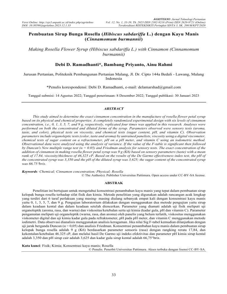 Versi Online: http://ojs3.unpatti.ac.id/index.php/agritekno DOI: 10.30598/jagritekno.2023.12.1.33 AGRITEKNO: Jurnal Teknologi Pertanian Vol. 12, No. 1, 33-39, Th. 2023 ISSN 2302-9218 (Print) ISSN 2620-9721 (Online) Terakreditasi RISTEKDIKTI Peringkat SINTA 3, SK. 200/M/KPT/2020 Pembuatan Sirup Bunga Rosella (Hibiscus sabdariffa L.) dengan Kayu Manis (Cinnamomum burmannii) Making Rosella Flower Syrup (Hibiscus sabdariffa L.) with Cinnamon (Cinnamomum burmannii) Debi D. Ramadhanti*, Bambang Priyanto, Ainu Rahmi Jurusan Pertanian, Politeknik Pembangunan Pertanian Malang, Jl. Dr. Cipto 144a Bedali - Lawang, Malang Indonesia *Penulis korespondensi: Debi D. Ramadhanti, e-mail: [email protected] Tanggal submisi: 14 Agustus 2022; Tanggal penerimaan: 8 Desember 2022; Tanggal publikasi: 30 Januari 2023 ABSTRACT This study aimed to determine the exact cinnamon concentration in the manufacture of rosella flower petal syrup based on its physical and chemical properties. A completely randomized experimental design with six levels of cinnamon concentration, i.e., 0, 1, 3, 5, 7, and 9 g, respectively, replicated four times was applied in this research. Analyses were performed on both the concentrated and diluted forms of the syrup. Parameters observed were sensory tests (aroma, taste, and color), physical tests on viscosity, and chemical tests (sugar content, pH, and vitamin C). Observation parameters include organoleptic tests (color, taste and aroma) by untrained panelists, viscosity using a digital viscometer, chemical tests of sugar content on a refractometer, pH on a pH meter, and vitamin C using an iodometric method. Observational data were analyzed using the analysis of variance. If the value of the F-table is significant then followed by Duncan's New multiple range test (α = 0.05) and Friedman analysis for sensory tests. The exact concentration of the addition of cinnamon in making rosella flower petal syrup was 9 g (K6) based on sensory parameters (taste) with a mean rank of 17.84, viscosity/thickness of 46,325 cP. Based on the results of the De Garmo effectiveness index test, the pH of the concentrated syrup was 3,350 and the pH of the diluted syrup was 3,625; the sugar content of the concentrated syrup was 66.75brix. Keywords: Chemical; Cinnamon concentration; Physical; Rosella © The Author(s). Publisher Universitas Pattimura. Open access under CC-BY-SA license. ABSTRAK Penelitian ini bertujuan untuk mengetahui konsentrasi penambahan kayu manis yang tepat dalam pembuatan sirup kelopak bunga rosella terhadap sifat fisik dan kimia. Metode penelitian yang digunakan adalah rancangan acak lengkap yang terdiri dari 6 taraf perlakuan yang masing- masing diulang sebanyak empat kali dengan konsentrasi kayu manis yaitu 0, 1, 3, 5, 7, dan 9 g. Pengujian laboratorium dilakukan dengan menggunakan dua metode pengujian yaitu sirup dalam keadaan kental dan dalam keadaan setelah diencerkan. Parameter yang diamati adalah uji fisik meliputi uji organoleptik (aroma, rasa, dan warna) dan viskositas/ketebalan serta uji kimia (kadar gula, pH dan vitamin C). Parameter pengamatan meliputi uji organoleptik (warna, rasa, dan aroma) oleh panelis yang belum terlatih, viskositas menggunakan viskometer digital dan uji kimia kadar gula pada refraktometer, pH pada pH meter, dan vitamin C menggunakan metode iodimetri. Data observasi dianalisis menggunakan analisis keragaman. Jika nilai Sig F-tabel kemudian dilanjutkan dengan uji jarak berganda Duncan (α = 0,05) dan analisis Friedman. Konsentrasi penambahan kayu manis dalam pembuatan sirup kelopak bunga rosella adalah 9 g (K6) berdasarkan parameter sensoris (rasa) dengan rangking rerata 17,84, dan kekentalan/ketebalan 46.325 cP, dan melalui hasil De Garmo uji indeks efektivitas dan parameter pH kimia sirup kental adalah 3,350 dan pH sirup cair adalah 3,625 dan kadar gula sirup kental adalah 66,75brix. Kata kunci: Fisik; Kimia; Konsentrasi kayu manis; Rosella © Penulis. Penerbit Universitas Pattimura. Akses terbuka dengan lisensi CC-BY-SA. 33 Versi Online: http://ojs3.unpatti.ac.id/index.php/agritekno DOI: 10.30598/jagritekno.2023.12.1.33 AGRITEKNO: Jurnal Teknologi Pertanian Vol. 12, No. 1, 33-39, Th. 2023 ISSN 2302-9218 (Print) ISSN 2620-9721 (Online) Terakreditasi RISTEKDIKTI Peringkat SINTA 3, SK. 200/M/KPT/2020 PENDAHULUAN sebagai pewarna alami dan kayu manis tidak hanya digunakan sebagai bahan masakan melainkan memberikan esensi aroma khas dalam proses olahan sirup. Sirup merupakan sejenis minuman ringan dengan cita rasa yang berbeda serta memiliki aroma khas yang mampu memberikan kesegaran bagi orang yang mengkonsumsinya, pada umumnya berupa larutan kental. Kelebihan sirup yaitu mudah dilarutkan dalam air, praktis dalam penyajian, mempermudah dalam mengkonsumsinya dan tidak membutuhkan waktu yang lama untuk menyajikannya (Hadiwijaya, 2013). Penelitian ini bertujuan untuk mengetahui konsentrasi penambahan kayu manis yang tepat berdasarkan sifat organoleptik (rasa, warna, dan aroma) dan viskositas/kekentalan serta sifat kimia (pH, vitamin C, dan kadar gula). Rosella merupakan bagian dari anggota family berupa Malvacceae dan nama ilmiah yang terbentuk dari tanaman rosella ini ialah Hibiscus sadbariffa L. Masing-masing bagian pada tanaman rosella seperti akar, batang, daun, dan bunga terdapat beragam kandungan yang ada, diantaranya adalah vitamin C dan tingginya kandungan Antosianin utamanya pada bagian bunga. Hal ini dapat disimpulkan bahwa rosella berpotensi sebagai sumber bahan pangan fungsional dan memiliki banyak manfaat dibidang kesehatan (Nurnasari & Khuluq, 2018). Kayu manis (Cinnamomum burmanii) merupakan salah satu flora di Indonesia menurut Rusita (2017) mengandung senyawa aktif yang mampu memperlambat komplikasi diabetes. Pada umumnya, penggunaan kayu manis sebagai penambah cita rasa dan aroma pada minuman. Kampung Ibu Sayur Desa Kebonagung Kecamatan Sukodono Kabupaten Sidoarjo merupakan Desa yang memiliki potensi dalam hal berbudidaya sayuran, ikan, rempah-r