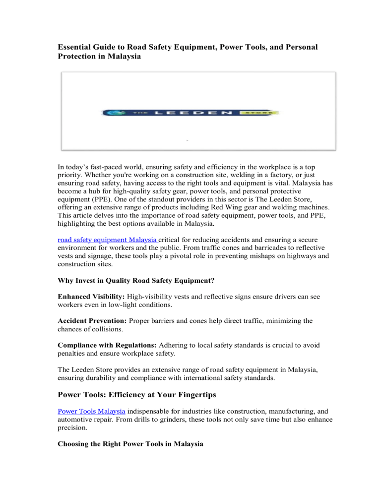 Essential Guide to Road Safety Equipment, Power Tools, and Personal Protection in Malaysia In today’s fast-paced world, ensuring safety and efficiency in the workplace is a top priority. Whether you're working on a construction site, welding in a factory, or just ensuring road safety, having access to the right tools and equipment is vital. Malaysia has become a hub for high-quality safety gear, power tools, and personal protective equipment (PPE). One of the standout providers in this sector is The Leeden Store, offering an extensive range of products including Red Wing gear and welding machines. This article delves into the importance of road safety equipment, power tools, and PPE, highlighting the best options available in Malaysia. road safety equipment Malaysia critical for reducing accidents and ensuring a secure environment for workers and the public. From traffic cones and barricades to reflective vests and signage, these tools play a pivotal role in preventing mishaps on highways and construction sites. Why Invest in Quality Road Safety Equipment? Enhanced Visibility: High-visibility vests and reflective signs ensure drivers can see workers even in low-light conditions. Accident Prevention: Proper barriers and cones help direct traffic, minimizing the chances of collisions. Compliance with Regulations: Adhering to local safety standards is crucial to avoid penalties and ensure workplace safety. The Leeden Store provides an extensive range of road safety equipment in Malaysia, ensuring durability and compliance with international safety standards. Power Tools: Efficiency at Your Fingertips Power Tools Malaysia indispensable for industries like construction, manufacturing, and automotive repair. From drills to grinders, these tools not only save time but also enhance precision. Choosing the Right Power Tools in Malaysia Durability: Look for tools made from high-quality materials that can withstand rigorous use. Ease of Use: Ergonomically designed tools reduce fatigue and improve productivity. Brand Reputation: Trusted brands like Red Wing ensure reliability and longevity. The Leeden Store offers a wide selection of power tools in Malaysia, catering to both professionals and DIY enthusiasts. Their products are designed to meet the needs of various industries, ensuring top-notch performance and safety. Personal Protection Equipment (PPE): A Necessity, Not an Option Personal Protection Equipment Malaysia is essential for safeguarding workers from potential hazards. Whether you’re welding, handling chemicals, or working on a construction site, the right PPE can mean the difference between safety and injury. Types of PPE Available in Malaysia Head Protection: Helmets and hard hats to shield against falling objects. Eye and Face Protection: Safety goggles and face shields to guard against sparks and debris. Respiratory Protection: Masks and respirators to protect from harmful fumes and dust. Hand and Foot Protection: Gloves and steel-toe boots for maximum protection. The Leeden Store’s range of personal protection equipment in Malaysia includes highquality helmets, gloves, and more. With a focus on comfort and safety, their products adhere to strict safety guidelines. Red Wing in Malaysia: A Trusted Name in Safety Gear When it comes to reliable safety gear, Red Wing is a name that stands out. Known for their robust and comfortable footwear, red wing Malaysia products are a favorite among professionals in hazardous work environments. Why Choose Red Wing? Unmatched Durability: Designed to withstand tough conditions, Red Wing boots are built to last. Enhanced Comfort: Ergonomic designs ensure long-lasting comfort, even during extended work hours. Versatility: Suitable for various industries, from construction to oil and gas. The Leeden Store is a proud distributor of Red Wing in Malaysia, offering a comprehensive range of their products. Whether you need sturdy boots or specialized gloves, Red Wing has you covered. Welding Machines in Malaysia: Power and Precision welding machine malaysia a critical process in industries like construction, automotive, and manufacturing. The right welding machine not only ensures precision but also boosts productivity. Factors to Consider When Buying a Welding Machine in Malaysia Type of Welding: Choose between MIG, TIG, and stick welding machines based on your project requirements. Portability: Lightweight and compact machines are ideal for on-site jobs. Energy Efficiency: Opt for energy-efficient models to save on operational costs. The Leeden Store’s range of welding machines in Malaysia includes top-of-the-line models designed for both professionals and hobbyists. Their machines offer precision, durability, and ease of use. Why Choose The Leeden Store in Malaysia? The Leeden Store stands out as a leading provider of road safety equipment, power tools, PPE, and welding machines in Malaysia. Here’s why they’re the go-to choice: Wide Range of Products: From Red Wing safety gear to advanced welding machines, they have it all. Quality Assurance: All products meet international safety and quality standards. Customer Support: Dedicated support teams ensure a seamless shopping experience. Competitive Pricing: Affordable rates without compromising on quality. Email :[email protected] Phone :60 12-403 1797 Social Media :https://www.facebook.com/theleedenstoremy/ https://www.instagram.com/theleedenstoremy/ https://www.youtube.com/@LeedenHercules