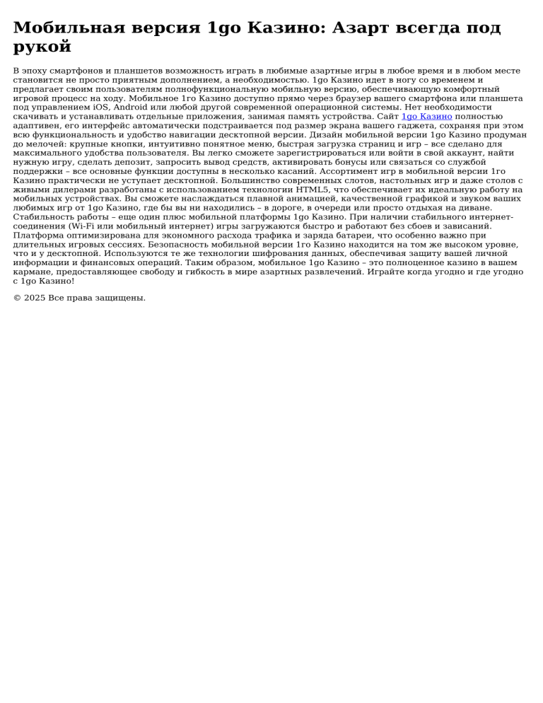 Мобильная версия 1go Казино: Азарт всегда под рукой В эпоху смартфонов и планшетов возможность играть в любимые азартные игры в любое время и в любом месте становится не просто приятным дополнением, а необходимостью. 1go Казино идет в ногу со временем и предлагает своим пользователям полнофункциональную мобильную версию, обеспечивающую комфортный игровой процесс на ходу. Мобильное 1го Казино доступно прямо через браузер вашего смартфона или планшета под управлением iOS, Android или любой другой современной операционной системы. Нет необходимости скачивать и устанавливать отдельные приложения, занимая память устройства. Сайт 1go Казино полностью адаптивен, его интерфейс автоматически подстраивается под размер экрана вашего гаджета, сохраняя при этом всю функциональность и удобство навигации десктопной версии. Дизайн мобильной версии 1go Казино продуман до мелочей: крупные кнопки, интуитивно понятное меню, быстрая загрузка страниц и игр – все сделано для максимального удобства пользователя. Вы легко сможете зарегистрироваться или войти в свой аккаунт, найти нужную игру, сделать депозит, запросить вывод средств, активировать бонусы или связаться со службой поддержки – все основные функции доступны в несколько касаний. Ассортимент игр в мобильной версии 1го Казино практически не уступает десктопной. Большинство современных слотов, настольных игр и даже столов с живыми дилерами разработаны с использованием технологии HTML5, что обеспечивает их идеальную работу на мобильных устройствах. Вы сможете наслаждаться плавной анимацией, качественной графикой и звуком ваших любимых игр от 1go Казино, где бы вы ни находились – в дороге, в очереди или просто отдыхая на диване. Стабильность работы – еще один плюс мобильной платформы 1go Казино. При наличии стабильного интернетсоединения (Wi-Fi или мобильный интернет) игры загружаются быстро и работают без сбоев и зависаний. Платформа оптимизирована для экономного расхода трафика и заряда батареи, что особенно важно при длительных игровых сессиях. Безопасность мобильной версии 1го Казино находится на том же высоком уровне, что и у десктопной. Используются те же технологии шифрования данных, обеспечивая защиту вашей личной информации и финансовых операций. Таким образом, мобильное 1go Казино – это полноценное казино в вашем кармане, предоставляющее свободу и гибкость в мире азартных развлечений. Играйте когда угодно и где угодно с 1go Казино! © 2025 Все права защищены.