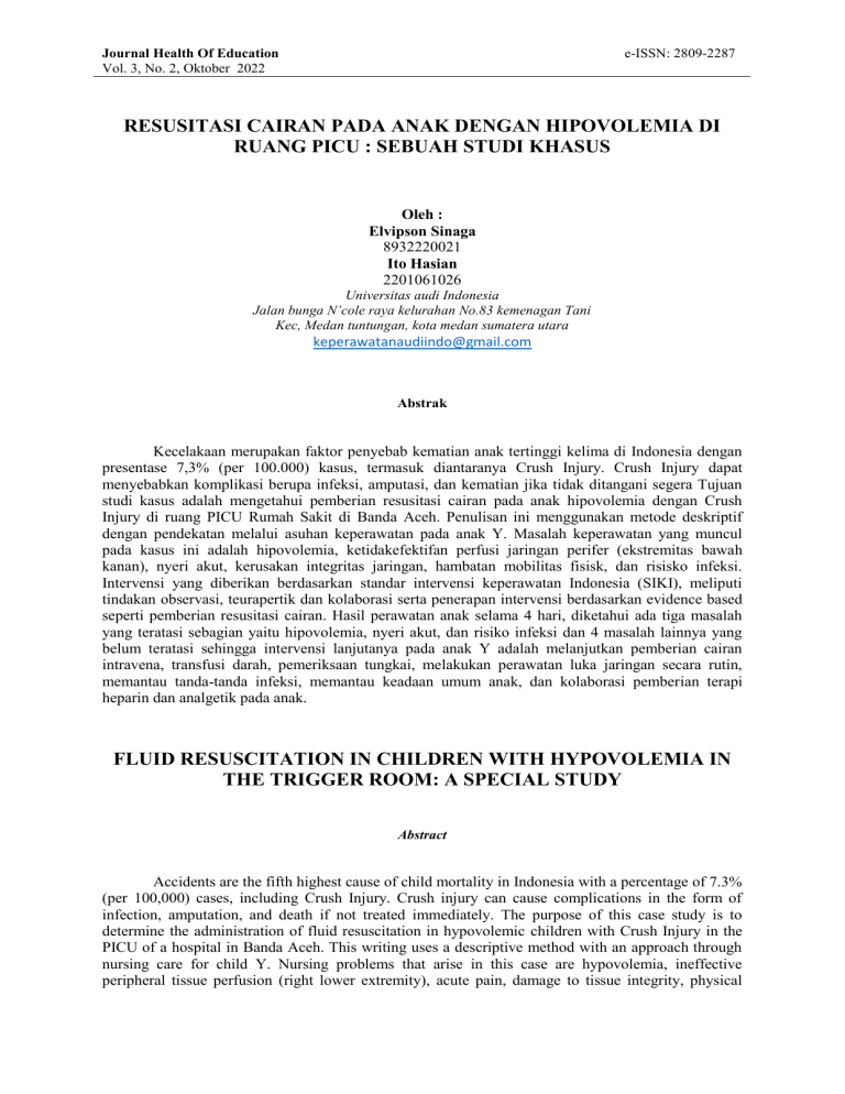 e-ISSN: 2809-2287 Journal Health Of Education Vol. 3, No. 2, Oktober 2022 RESUSITASI CAIRAN PADA ANAK DENGAN HIPOVOLEMIA DI RUANG PICU : SEBUAH STUDI KHASUS Oleh : Elvipson Sinaga 8932220021 Ito Hasian 2201061026 Universitas audi Indonesia Jalan bunga N’cole raya kelurahan No.83 kemenagan Tani Kec, Medan tuntungan, kota medan sumatera utara [email protected] Abstrak Kecelakaan merupakan faktor penyebab kematian anak tertinggi kelima di Indonesia dengan presentase 7,3% (per 100.000) kasus, termasuk diantaranya Crush Injury. Crush Injury dapat menyebabkan komplikasi berupa infeksi, amputasi, dan kematian jika tidak ditangani segera Tujuan studi kasus adalah mengetahui pemberian resusitasi cairan pada anak hipovolemia dengan Crush Injury di ruang PICU Rumah Sakit di Banda Aceh. Penulisan ini menggunakan metode deskriptif dengan pendekatan melalui asuhan keperawatan pada anak Y. Masalah keperawatan yang muncul pada kasus ini adalah hipovolemia, ketidakefektifan perfusi jaringan perifer (ekstremitas bawah kanan), nyeri akut, kerusakan integritas jaringan, hambatan mobilitas fisisk, dan risisko infeksi. Intervensi yang diberikan berdasarkan standar intervensi keperawatan Indonesia (SIKI), meliputi tindakan observasi, teurapertik dan kolaborasi serta penerapan intervensi berdasarkan evidence based seperti pemberian resusitasi cairan. Hasil perawatan anak selama 4 hari, diketahui ada tiga masalah yang teratasi sebagian yaitu hipovolemia, nyeri akut, dan risiko infeksi dan 4 masalah lainnya yang belum teratasi sehingga intervensi lanjutanya pada anak Y adalah melanjutkan pemberian cairan intravena, transfusi darah, pemeriksaan tungkai, melakukan perawatan luka jaringan secara rutin, memantau tanda-tanda infeksi, memantau keadaan umum anak, dan kolaborasi pemberian terapi heparin dan analgetik pada anak. FLUID RESUSCITATION IN CHILDREN WITH HYPOVOLEMIA IN THE TRIGGER ROOM: A SPECIAL STUDY Abstract Accidents are the fifth highest cause of child mortality in Indonesia with a percentage of 7.3% (per 100,000) cases, including Crush Injury. Crush injury can cause complications in the form of infection, amputation, and death if not treated immediately. The purpose of this case study is to determine the administration of fluid resuscitation in hypovolemic children with Crush Injury in the PICU of a hospital in Banda Aceh. This writing uses a descriptive method with an approach through nursing care for child Y. Nursing problems that arise in this case are hypovolemia, ineffective peripheral tissue perfusion (right lower extremity), acute pain, damage to tissue integrity, physical Journal Health Of Education Vol. 3, No. 2, Oktober 2022 e-ISSN: 2809-2287 mobility barriers, and the risk of infection. The interventions provided are based on the Indonesian Nursing Intervention Standard (SIKI), including observation, therapeutic and collaborative actions as well as the application of evidence-based interventions such as fluid resuscitation. The results of child care for 4 days, it is known that there are three problems that have been partially resolved, namely hypovolemia, acute pain, and risk of infection and 4 other problems that have not been resolved so that the follow-up intervention for child Y is to continue giving intravenous fluids, blood transfusions, examination of the limbs, performing treatment tissue wounds regularly, monitor for signs of infection, monitor the general condition of children, and collaborate in giving heparin and analgesic therapy to children. PENDAHULUAN Trauma adalah kata lain cedera yang dapat melukai fisik ataupun psikis. Trauma jaringan lunak pada muskuluskeletal dapat berupa vulnus (luka), perdarahan, memar, regangan atau robek parsial, putus atau robek (avulsi atau ruptur), gangguan pembuluhdarah dan gangguan saraf (Ulfiani, 2021). Crush Injury merupakan luka hancur pada ekstremitas atau anggota tubuh lainnya yang menyebabkan kerusakan serius pada kulit dan jaringan lunak di bawah kulit, kerusakan pembuluh darah, persarafan tendon, fasia, sendi tulang (lokasi penghubung antara tulang) kerusakan tulang dan komponen dalam tulang (Haris, 2019). World Health Organization dan The Global Burden of Diseases Study memperkirakan bahwa setiap tahun terjadi 3,9 juta kematian di seluruh dunia disebabkan oleh kecelakaan. Di Indonesia angka kematian anak akibat kecelakaan, keracunan dan trauma tercatat 7,3 % (per 100.000) dan merupakan salah satu dari lima penyebab kematian anak tertinggi. Kecelakaan pada anak adalah sebesar 19,2% per 100.000 anak sedangkan kecelakaan lalu lintas jalan raya yang terjadi pada anak adalah 8.601 kasus (Kurniawati, 2018). Setiap tahun, hampir 1 juta anak meninggal karena kecelakaan dan lebih dari puluhan juta anak-anak lainnya memerlukan perawatan rumah karena mengalami luka berat (Mulyanti, 2015). Di negara berkembang, trauma merupakan penyebab utama kematian anak usia 1-14 tahun. Diperkirakan 98% kematian anak disebabkan oleh trauma. Di Indonesia, angka kematian pada anak akibat trauma merupakan salah satu dari lima penyebab kematian anak tertinggi (Rachmawati, 2020). Kematian akibat trauma diproyeksikan meningkat dari 5,1 juta menjadi 8,4 juta atau 9,2 % dari kematian secara keseluruhan dan diperkirakan menempati urutan ketiga disability adjusted life years pada tahun 2020. Di Indonesia tahun 2011 trauma akibat kecelakaan lalu lintas adalah 108.696 jiwa dengan korban tewas sebanyak 31.195 Jiwa. Penyebab utama kematian pada anak dengan trauma adalah perdarahan. Trauma dengan perdarahan mengakibatkan hipovolemia, perfusi jaringan tidak adekuat, iskemia, hipoksemia dan akhirnya terjadi hipoksia pada tingkat jaringan dan sel (Wiargitha, 2017). Kehilangan darah atau Hipovolemia adalah penyebab umum syok pada pasien trauma. Pada pasien dengan trauma 30%, volume darah akan hilang sehingga akan menyebabkan hipotensi yang berujung pada penurunan perfusi ke jaringan. Selanjutnya juga dapat diperburuk oleh adanya koagulopati, hipotermia, dan asidosis. Koagulopati a