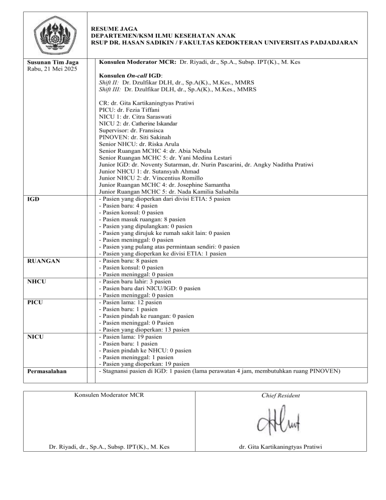 RESUME JAGA DEPARTEMEN/KSM ILMU KESEHATAN ANAK RSUP DR. HASAN SADIKIN / FAKULTAS KEDOKTERAN UNIVERSITAS PADJADJARAN Susunan Tim Jaga Rabu, 21 Mei 2025 Konsulen Moderator MCR: Dr. Riyadi, dr., Sp.A., Subsp. IPT(K)., M. Kes Konsulen On-call IGD: Shift II: Dr. Dzulfikar DLH, dr., Sp.A(K)., M.Kes., MMRS Shift III: Dr. Dzulfikar DLH, dr., Sp.A(K)., M.Kes., MMRS IGD RUANGAN NHCU PICU NICU Permasalahan CR: dr. Gita Kartikaningtyas Pratiwi PICU: dr. Fezia Tiffani NICU 1: dr. Citra Saraswati NICU 2: dr. Catherine Iskandar Supervisor: dr. Fransisca PINOVEN: dr. Siti Sakinah Senior NHCU: dr. Riska Arula Senior Ruangan MCHC 4: dr. Abia Nebula Senior Ruangan MCHC 5: dr. Yani Medina Lestari Junior IGD: dr. Noventy Sutarman, dr. Nurin Pascarini, dr. Angky Naditha Pratiwi Junior NHCU 1: dr. Sutansyah Ahmad Junior NHCU 2: dr. Vincentius Romillo Junior Ruangan MCHC 4: dr. Josephine Samantha Junior Ruangan MCHC 5: dr. Nada Kamilia Salsabila - Pasien yang dioperkan dari divisi ETIA: 5 pasien - Pasien baru: 4 pasien - Pasien konsul: 0 pasien - Pasien masuk ruangan: 8 pasien - Pasien yang dipulangkan: 0 pasien - Pasien yang dirujuk ke rumah sakit lain: 0 pasien - Pasien meninggal: 0 pasien - Pasien yang pulang atas permintaan sendiri: 0 pasien - Pasien yang dioperkan ke divisi ETIA: 1 pasien - Pasien baru: 8 pasien - Pasien konsul: 0 pasien - Pasien meninggal: 0 pasien - Pasien baru lahir: 3 pasien - Pasien baru dari NICU/IGD: 0 pasien - Pasien meninggal: 0 pasien - Pasien lama: 12 pasien - Pasien baru: 1 pasien - Pasien pindah ke ruangan: 0 pasien - Pasien meninggal: 0 Pasien - Pasien yang dioperkan: 13 pasien - Pasien lama: 19 pasien - Pasien baru: 1 pasien - Pasien pindah ke NHCU: 0 pasien - Pasien meninggal: 1 pasien - Pasien yang dioperkan: 19 pasien - Stagnansi pasien di IGD: 1 pasien (lama perawatan 4 jam, membutuhkan ruang PINOVEN) Konsulen Moderator MCR Chief Resident Dr. Riyadi, dr., Sp.A., Subsp. IPT(K)., M. Kes dr. Gita Kartikaningtyas Pratiwi