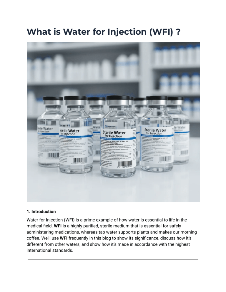 What is Water for Injection (WFI) ? 1. Introduction Water for Injection (WFI) is a prime example of how water is essential to life in the medical field. WFI is a highly purified, sterile medium that is essential for safely administering medications, whereas tap water supports plants and makes our morning coffee. We’ll use WFI frequently in this blog to show its significance, discuss how it’s different from other waters, and show how it’s made in accordance with the highest international standards. 2. WFI (Water for Injection): What Is It? Water that has been sterilized, purified, and packaged especially for parenteral (injectable) use is referred to as WFI in pharmaceutical and clinical contexts. Among WFI’s salient features are: ● Sterility: There are no observable living microorganisms in WFI. ● Endotoxin Control: To prevent hazardous pyrogenic reactions when WFI comes into contact with blood or tissue, the endotoxin level in WFI must be less than 0.25 Endotoxin Units (EU) per milliliter. ● Chemical Purity: Usually less than 500 parts per billion (ppb), WFI has a very low Total Organic Carbon (TOC). ● Microbial Limit: WFI must have no more than 10 Colony Forming Units (CFU) of aerobic bacteria per 100 mL, per the US Pharmacopeia (USP). This blog’s emphasis on WFI highlights how patient safety can be directly impacted by any compromise in WFI quality. 3. Comparing WFI with Other Pharmaceutical Waters Although phrases like Water for Injection (WFI), Sterile Water for Injection, and Bacteriostatic Water for Injection are frequently used synonymously, they have different meanings: 1. Water for Injection (WFI) ● The base grade is extremely purified using validated membrane techniques or distillation. ● Sterilization frequently takes place during drug manufacturing, so WFI might not be sterile right away. 2. Injectable Sterile Water (SWFI) ● WFI that has been further sterilized (autoclaving or 0.2 µm filtration, for example). ● Aseptically packaged to maintain sterility until use. 3. Bacteriostatic WFI ● WFI that contains benzyl alcohol and other antimicrobial preservatives. ● Allows for several uses from a single vial, but because of the potential for preservative toxicity, it is not appropriate for large‑volume or neonatal applications. The main product in each of these categories is still WFI, with each variation being made to meet particular manufacturing or clinical requirements. 4. The Significance of WFI Sterility and Purity WFI is a lifeline, and when we talk about it, we’re talking about more than just water. Any impurity in WFI could have detrimental effects: ● Infections: Bacteria can enter the bloodstream directly from non‑sterile WFI. ● Pyrogenic Shock: Fever, chills, or hypotension can be brought on by endotoxins in inadequate WFI. ● Drug Degradation: When organic pollutants in WFI interact with active pharmaceutical ingredients (APIs), the potency of the drug is diminished. To safeguard patient health, WFI’s sterility and purity requirements are therefore non‑negotiable. 5. WFI’s Main Applications in Healthcare WFI is essential to healthcare workers for a number of crucial tasks: ● Reconstitution of Drugs Antibiotics, vaccines, and biologics are among the many drugs that come in powder form. They are diluted or dissolved by WFI into injectable solutions. ● Flushing of IV Lines To avoid mixing incompatible medications, WFI flushes intravenous lines and catheters both before and after medication administration. ● Cleaning of Equipment To ensure aseptic conditions and remove residues, WFI is used to rinse fill needles, vials, stoppers, and processing equipment. ● Applications in the Lab WFI is used in diagnostic tests and cell culture media preparation where contaminants could distort the results. It is easier to understand why WFI production is strictly regulated when one considers that every application requires the same degree of WFI quality. 6. WFI’s Strict Production Pharmacopeial‑grade WFI is achieved by a number of carefully regulated steps: 1. Prior to Treatment ● Softening & Dechlorination: Preserves downstream membranes by eliminating minerals that cause scaling and leftover disinfectants. ● Activated Carbon Filtration: By absorbing organic pollutants and disinfectant byproducts, activated carbon filtration works. 2. First Purification ● Reverse Osmosis (RO): More than 99 percent of dissolved ions, bacteria, and organics are eliminated by reverse osmosis. ● Ultrafiltration (UF): Gets rid of high‑molecular‑weight contaminants and endotoxins. 3. Last‑Minute Polishing ● Distillation (Vapor Compression or Multi‑Effect): Removes endotoxins and volatile pollutants. ● UV Oxidation: Water is disinfected and trace organics are broken down by UV oxidation. 4. Aseptic Filling and Sterilization ● Membrane Filtration (0.2 µm) or autoclaving in a clean room. ● WFI is packaged in Grade A/B aseptic suites to maintain sterility. 5. Control of Quality ● Microbial count, TOC, conductivity, particulates, and endotoxin (LAL assay) testing. Every one of these steps guarantees that the finished WFI satisfies—or surpasses—pharmacopeial requirements, allowing it to be safely applied directly to human tissues. 7. International Standards and Adherence to Regulations WFI manufacturers adhere to rules set forth by: ● United States Pharmacopeia (USP) ● European Pharmacopeia (EP) ● Japanese Pharmacopeia (JP) ● World Health Organization (WHO) Although high‑grade membrane techniques may be allowed by the EP as an alternative to distillation, all compendia stress: ● Endotoxin Limits: ≤ 0.25 EU/mL ● Microbial Bioburden: ≥ 10 CFU/100 mL ● TOC Limits: < 500 ppb Routine regulatory inspections and in‑process sampling confirm that WFI production stays within these stringent parameters. 8. New Developments Improving WFI Manufacturing The need for efficiency and safety is what is driving the ongoing