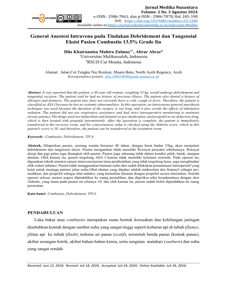 Jurnal Medika Nusantara Volume. 2 No. 3 Agustus 2024 e-ISSN : 2986-7061, dan p-ISSN : 2986-7878, Hal. 185-198 DOI: https://doi.org/10.59680/medika.v2i3.1280 Available online at:https://jurnal.stikeskesdam4dip.ac.id/index.php/Medika General Anestesi Intravena pada Tindakan Debridement dan Tangensial Eksisi Pasien Combustio 13.5% Grade Iia Dila Khairunnisa Mahira Zulmay1*, Abrar Abrar2 1 Universitas Malikussaleh, Indonesia 2 RSUD Cut Meutia, Indonesia Alamat: Jalan Cot Tengku Nie Reuleut, Muara Batu, North Aceh Regency, Aceh Korespondensi penulis: [email protected] Abstract, It was reported that the patient, a 40 year old woman, weighing 53 kg, would undergo debridement and tangential excision. The patient said he had no history of previous illness. The patient also denied a history of allergies and dentures. The patient also does not currently have a cold, cough or fever. Therefore, the patient is classified as ASA I because he has no systemic abnormalities. In this operation, an intravenous general anesthesia technique was used because the duration of the surgery is not long, and it also avoids the effects of inhalation sedation. The patient did not use respiratory assistance and had strict intraoperative monitoring to maintain airway patency.The drugs used are midazolam and fentanyl as pre-medication, and propofol as an induction drug, which is then treated with propofol intermittently. After the operation is complete, the patient is immediately transferred to the recovery room, and his consciousness value is checked using the Aldrette score, which in this patient's score is 10, and therefore, the patient can be transferred to the treatment room. Keywords: Combustio, Debridement, TIVA. Abstrak, Dilaporkan pasien, seorang wanita berumur 40 tahun, dengan berat badan 53kg, akan menjalani debridement dan tangensial eksisi. Pasien mengatakan tidak memiliki Riwayat penyakit sebelumnya. Riwayat alergi dan gigi palsu juga disangkal oleh pasien. Pasien juga sekarang tidak dalam kondisi pilek, batuk, ataupun demam. Oleh karena itu, pasien tergolong ASA I karena tidak memiliki kelainan sistemik. Pada operasi ini, digunakan teknik anestesi umum intravena karena lama pembedahan yang tidak tergolong lama, juga menghindari efek sedasi inhalasi. Pasien tidak menggunakan bantuan nafas dan sudah dilakukan pemantauan intraoperatif yang ketat untuk menjaga patensi jalan nafas.Obat-obatan yang dipakai adalah midazolam dan fentanyl sebagai premedikasi, dan propofol sebagai obat induksi, yang kemudian dirumat dengan propofol secara intermiten. Setelah operasi selesai, pasien segera dipindahkan ke ruang pemulihan, dan diperiksa nilai kesadarannya dengan skor Aldrette, yang mana pada pasien ini nilainya 10, dan oleh karena itu, pasien sudah boleh dipindahkan ke ruang perawatan. Kata kunci: Combustio, Debridement, TIVA. PENDAHULUAN Luka bakar atau combustio merupakan suatu bentuk kerusakan dan kehilangan jaringan disebabkan kontak dengan sumber suhu yang sangat tinggi seperti kobaran api di tubuh (flame), jilitan api ke tubuh (flash), terkena air panas (scald), tersentuh benda panas (kontak panas), akibat serangan listrik, akibat bahan-bahan kimia, serta sengatan matahari (sunburn) dan suhu yang sangat rendah. Received: Juni 12, 2024; Revised: Juli 18, 2024; Accepted: Juli 24, 2024; Online Available: Juli 26, 2024; General Anestesi Intravena Pada Tindakan Debridement Dan Tangensial Eksisi Pasien Combustio 13.5% Grade Iia Dari laporan American Burn Association 2012 dikatakan bahwa angka morbiditas 96,1% lebih banyak terjadi pada wanita (69%). Berdasarkan tempat kejadian, 69 % di rumah tangga dan 9% di tempat kerja, 7% di jalan raya, 5% di rekreasi atau olahraga 10% dan lain-lain. Menurut surat kabar Tribun pada tanggal 8 Februari 2012, pada Simposium Indonesia Burn and Wound Care Meeting yang diselengarakan Universitas Padjadjaran di Bandung dilaporkan data terakhir yang dikeluarkan unit luka bakar RSCM Januari 1998 - Mei 2001 menunjukkan bahwa 60% karena kecelakaan rumah tangga, 20% karena kecelakaan kerja, dan 20% sisanya karena sebab-sebab lain. Dan angka kematian akibat luka bakar pun di Indonesia masih tinggi, sekitar 40%, terutama diakibatkan luka bakar berat. Bila luas luka bakar kurang dari 20%, biasanya mekanisme kompensasi tubuh masih bisa mengatasinya, tetapi bila lebih dari 20% akan terjadi syok hipovolemik dengan gejala yang khas, seperti gelisah, pucat, dingin, berkeringat, nadi kecil, dan cepat, tekanan darah menurun, dan produksi urin berkurang. Pembengkakkan terjadi pelan-pelan, maksimal terjadi setelah delapan jam. Pada kebakaran dalam ruang tertutup atau bila luka terjadi di wajah, dapat terjadi kerusakan mukosa jalan napas karena gas, asap, atau uap panas yang terhisap. Oedem laring yang ditimbulkannya dapat menyebabkan hambatan jalan napas dengan gejala sesak napas, takipnea, stridor, suara serak dan dahak bewarna gelap. Dapat juga keracunan gas CO dan gas beracun lainnya. Karbon monoksida akan mengikat hemoglobin dengan kuat sehingga hemoglobin tak mampu lagi mengikat oksigen. Tanda keracunan ringan adalah lemas, bingung, pusing, mual dan muntah. Pada keracunan yang berat terjadi koma. Bisa lebih dari 60% hemoglobin terikat CO, penderita dapat meninggal. Setelah 12 – 24 jam, permeabilitas kapiler mulai membaik dan mobilisasi serta penyerapan kembali cairan edema ke pembuluh darah. Ini di tandai dengan meningkatnya diuresis. Kemajuan ilmu kedokteran dewasa ini khususnya bidang pembedahan tidak terlepas dari peran dan dukungan kemajuan bidang anestesiologi. Anestesia berarti pembiusan, kata ini berasal dari bahasa Yunani an- "tidak atau tanpa" dan aesthētos, "persepsi atau kemampuan untuk merasa". Istilah anestesi digunakan pertama kali oleh Oliver Wendel Holmes Sr pada tahun 1846. Anestesi umum adalah tindakan meniadakan nyeri secara sentral disertai dengan hilangnya kesadaran dan bersifat pulih kembali (reversible). Prinsipnya dalam penatalaksanaan anestesi pada suatu operasi terdapat beb